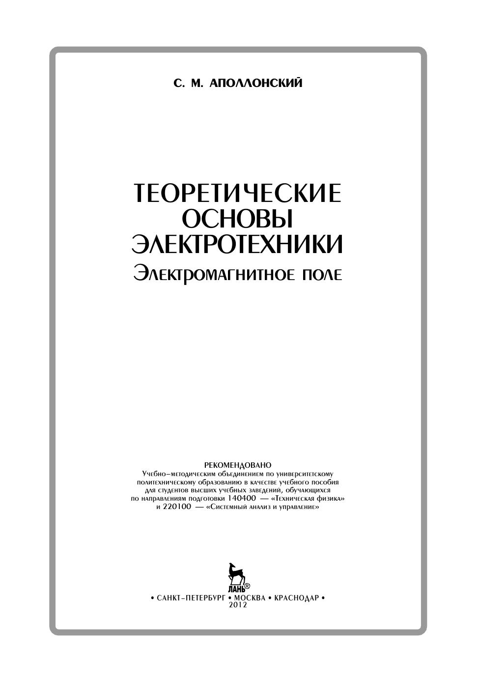 Пособие разработано на основании государственных образовательных стандартов высшего профессионального образования и предназначено для студентов очной, заочной и очно-заочной форм обучения по направлениям подготовки «Техническая физика», «Системный анализ и управление», изучающих дисциплину «Теоретические основы электротехники. Электромагнитное поле». Пособие может быть использовано студентами всех форм обучения по направлениям подготовки «Энергетическое машиностроение» и «Электроэнергетика и электротехника», сталкивающимися с необходимостью изучения электромагнитного поля, а также магистрами, аспирантами и инженерно-техническими работниками электротехнических направлений.