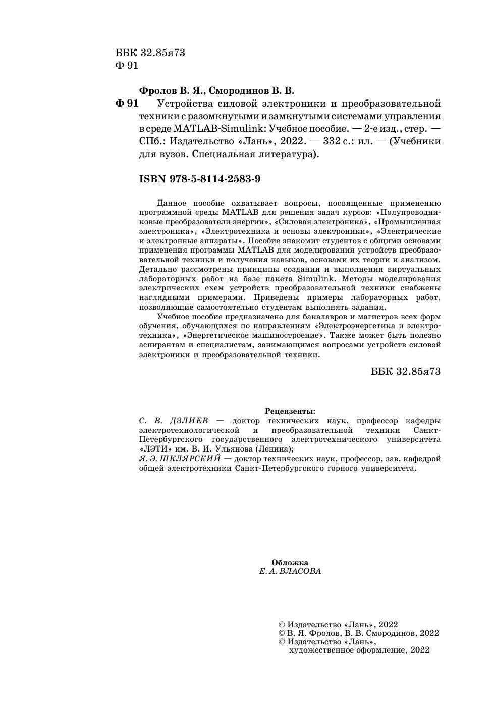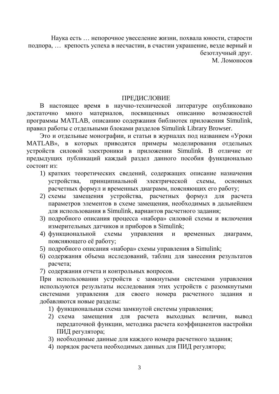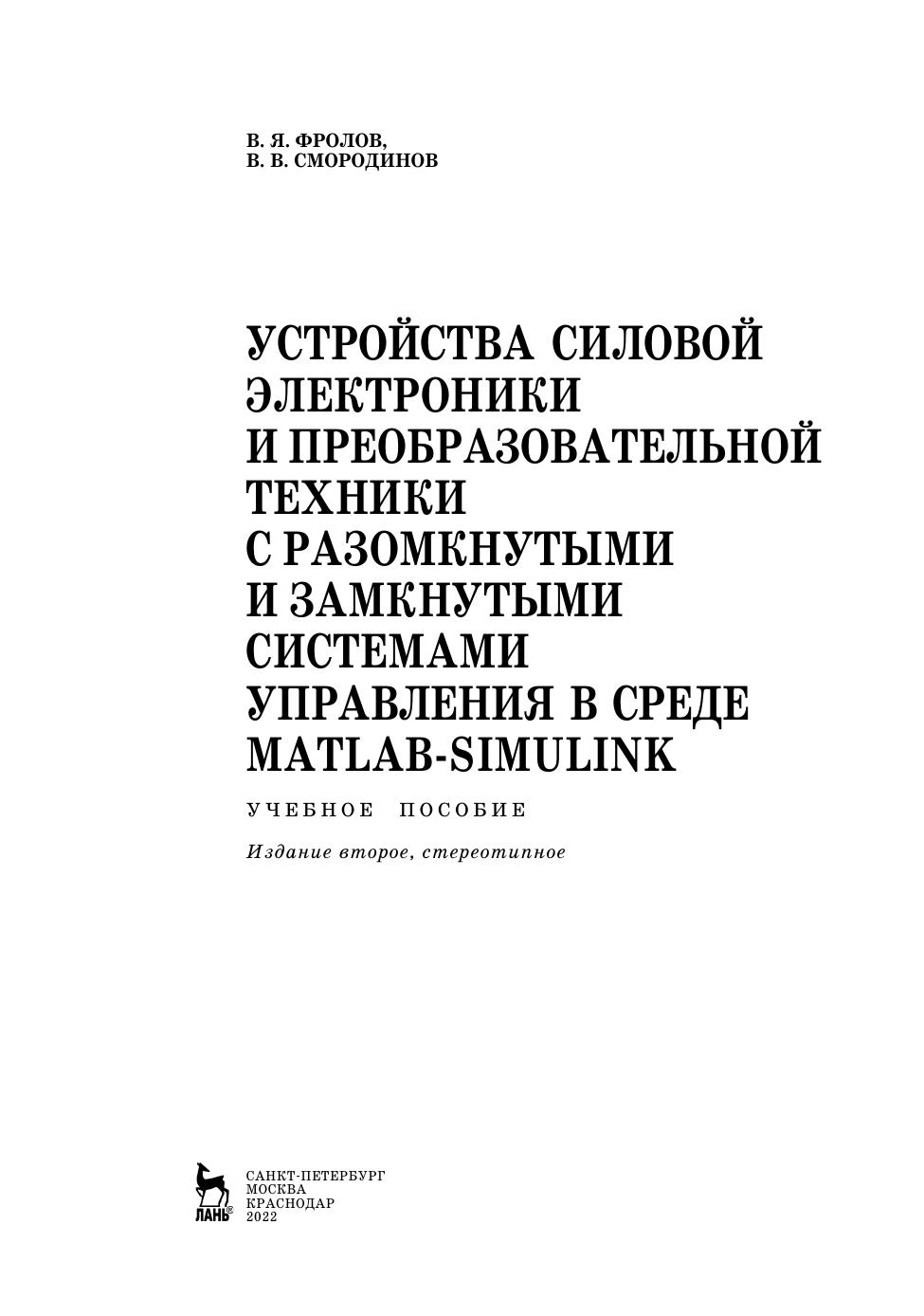 Данное пособие охватывает вопросы, посвященные применению программной среды Matlab для решения задач курсов: «Полупроводниковые преобразователи энергии», «Силовая электроника», «Промышленная электроника», «Электротехника и основы электроники», «Электрические и электронные аппараты». Пособие знакомит студентов с общими основами применения программы Matlab для моделирования устройств преобразовательной техники и получения навыков, основами их теории и анализом. Детально рассмотрены принципы создания и выполнения виртуальных лабораторных работ на базе пакета Simulink. Методы моделирования электрических схем устройств преобразовательной техники снабжены наглядными примерами. Приведены примеры лабораторных работ, позволяющие самостоятельно студентам выполнять задания. Учебное пособие предназначено для бакалавров и магистров всех форм обучения, обучающихся по направлениям «Электроэнергетика и электротехника», «Энергетическое машиностроение». Также может быть полезно аспирантам и специалистам, занимающимся вопросами устройств силовой электроники и преобразовательной техники.