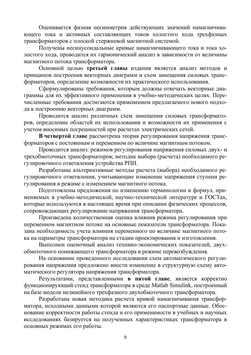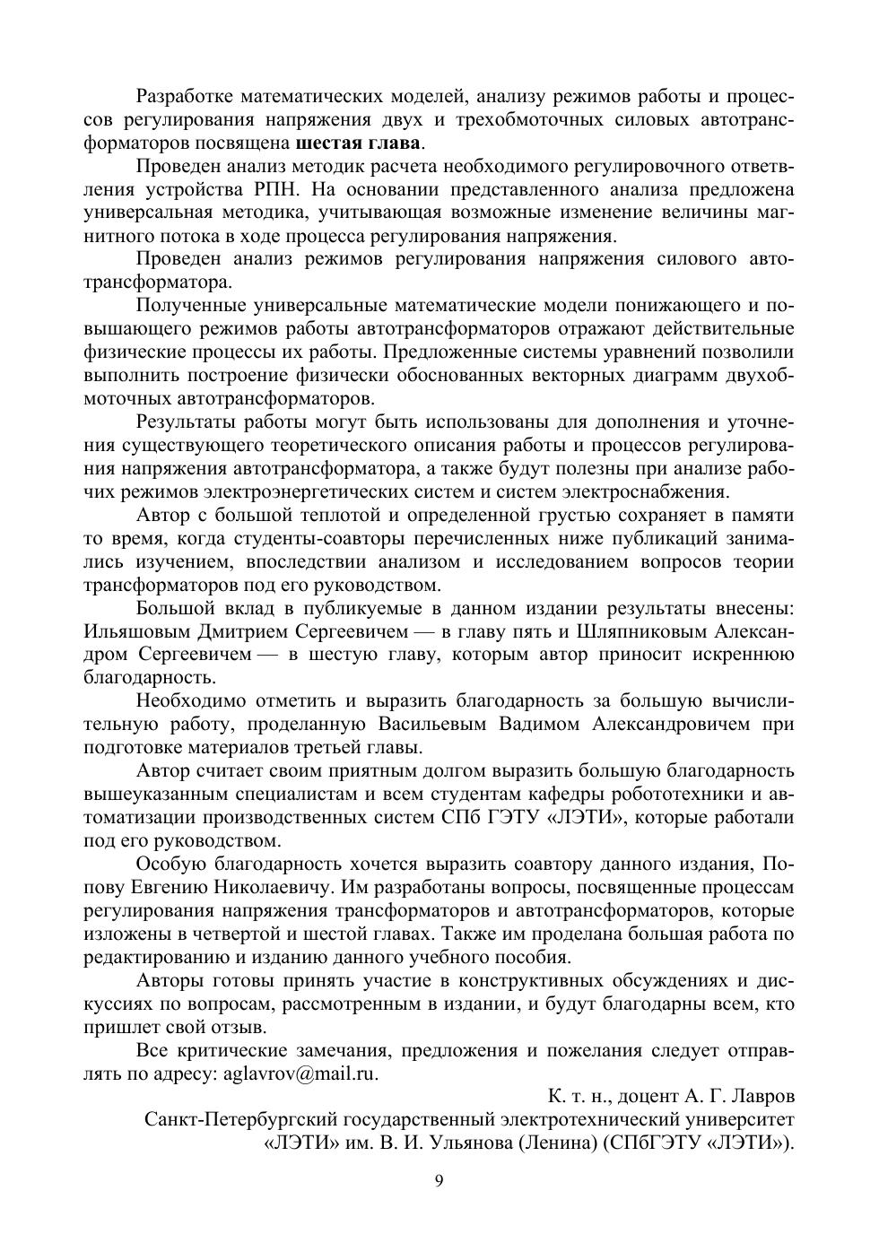 Представлены материалы по некоторым вопросам теории силовых трансформаторов и автотрансформаторов, которые, по мнению авторов, требуют дополнительного исследования, корректировки и доработки, по сравнению с аналогичными в научно-технической и учебно-методической литературе. Проводится анализ: режима холостого хода, методов построения и областей применимости векторных диаграмм и схем замещения силовых трансформаторов, теории регулирования напряжения. Разработан компьютерный стенд для исследования параметров и характеристик нелинейного силового трехфазного трансформатора. Рассмотрены режимы работы силовых двух- и трёхобмоточных силовых автотрансформаторов, предложены уточ-нённые математические модели режимов их работы. Учебное пособие предназначено для студентов вузов, обучающихся по направлениям «Электроэнергетика и электротехника» и «Управление в технических системах», а также может быть полезно слушателям курсов подготовки и переподготовки кадров, преподавателям и инженерно-техническим работникам, занимающимся в своей профессиональной деятельности процессами преобразования энергии в силовых трансформаторах и автотрансформаторах.