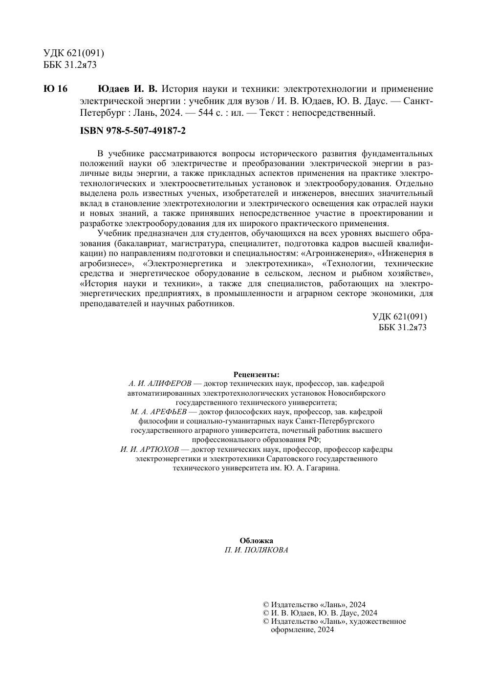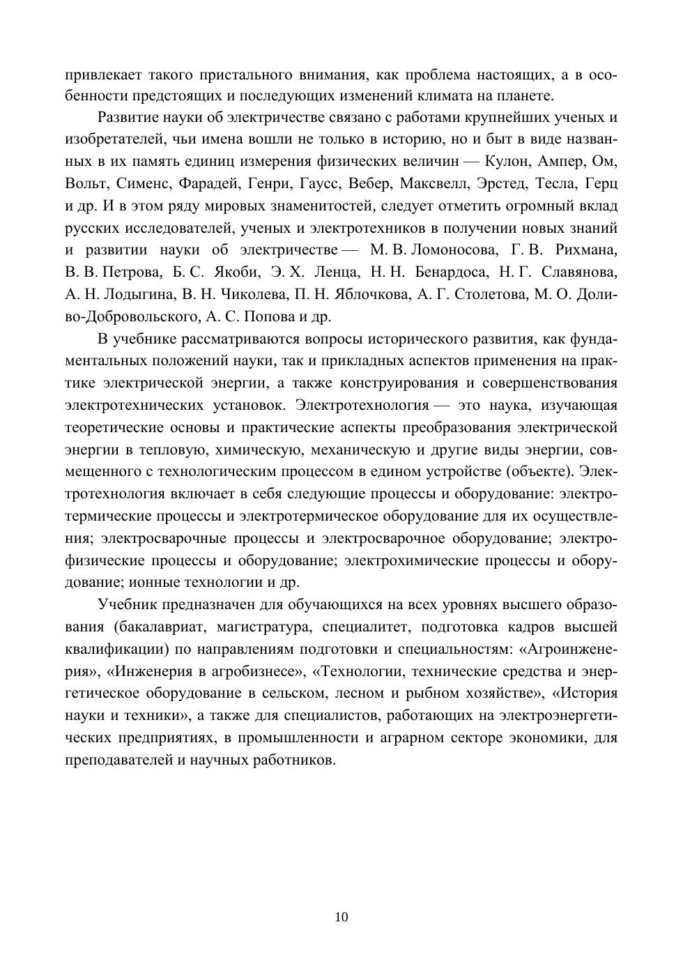В учебнике рассматриваются вопросы исторического развития фундаментальных положений науки об электричестве и преобразовании электрической энергии в раз-личные виды энергии, а также прикладных аспектов применения на практике электротехнологических и электроосветительных установок и электрооборудования. Отдельно выделена роль известных ученых, изобретателей и инженеров, внесших значительный вклад в становление электротехнологии и электрического освещения как отраслей науки и новых знаний, а также принявших непосредственное участие в проектировании и разработке электрооборудования для их широкого практического применения. Учебник предназначен для студентов, обучающихся на всех уровнях высшего образования (бакалавриат, магистратура, специалитет, подготовка кадров высшей квалификации) по направлениям подготовки и специальностям: «Агроинженерия», «Инженерия в агробизнесе», «Электроэнергетика и электротехника», «Технологии, технические средства и энергетическое оборудование в сельском, лесном и рыбном хозяйстве», «История науки и техники», а также для специалистов, работающих на электроэнергетических предприятиях, в промышленности и аграрном секторе экономики, для преподавателей и научных работников.
