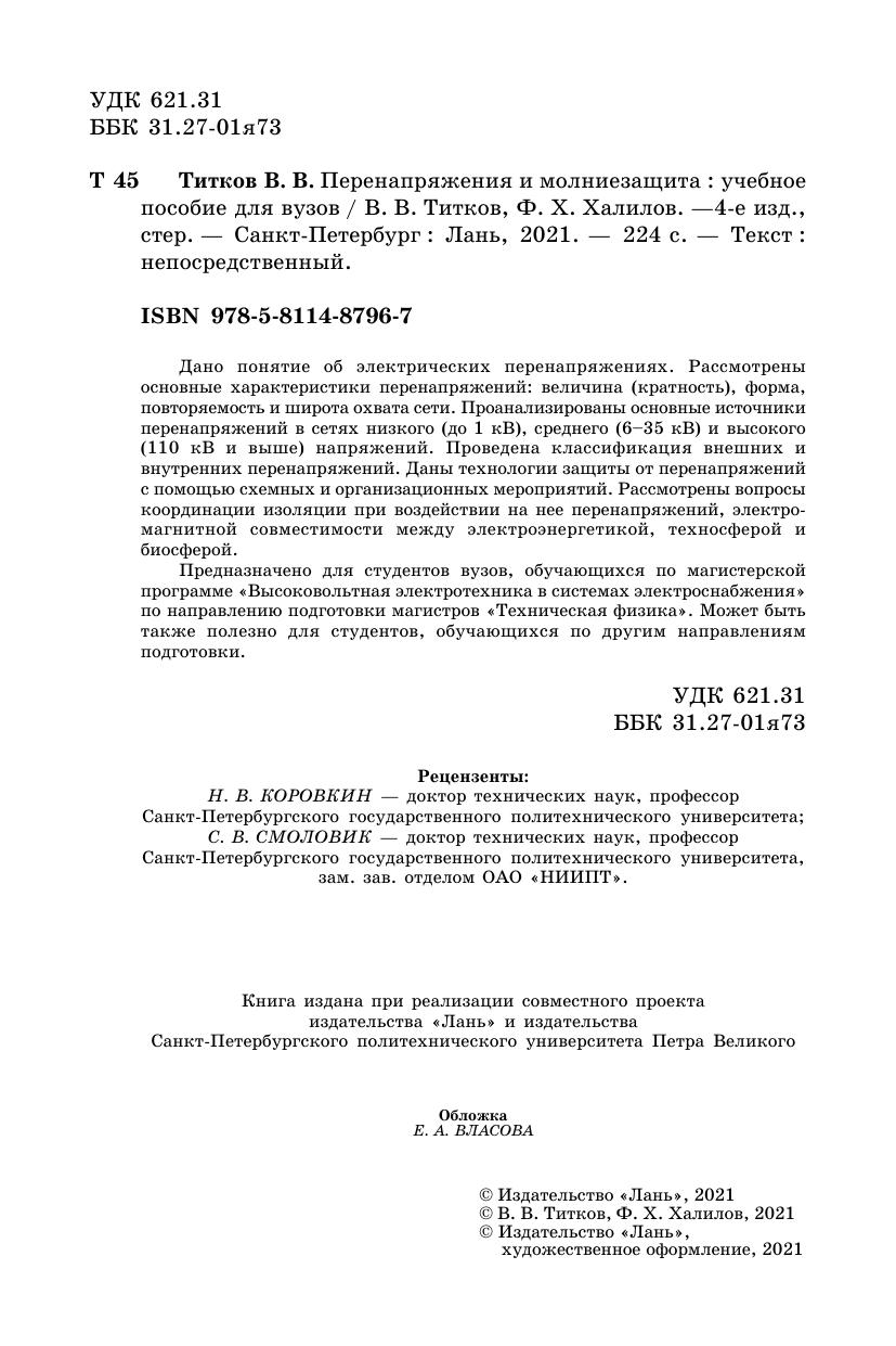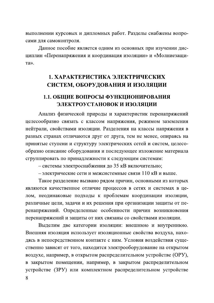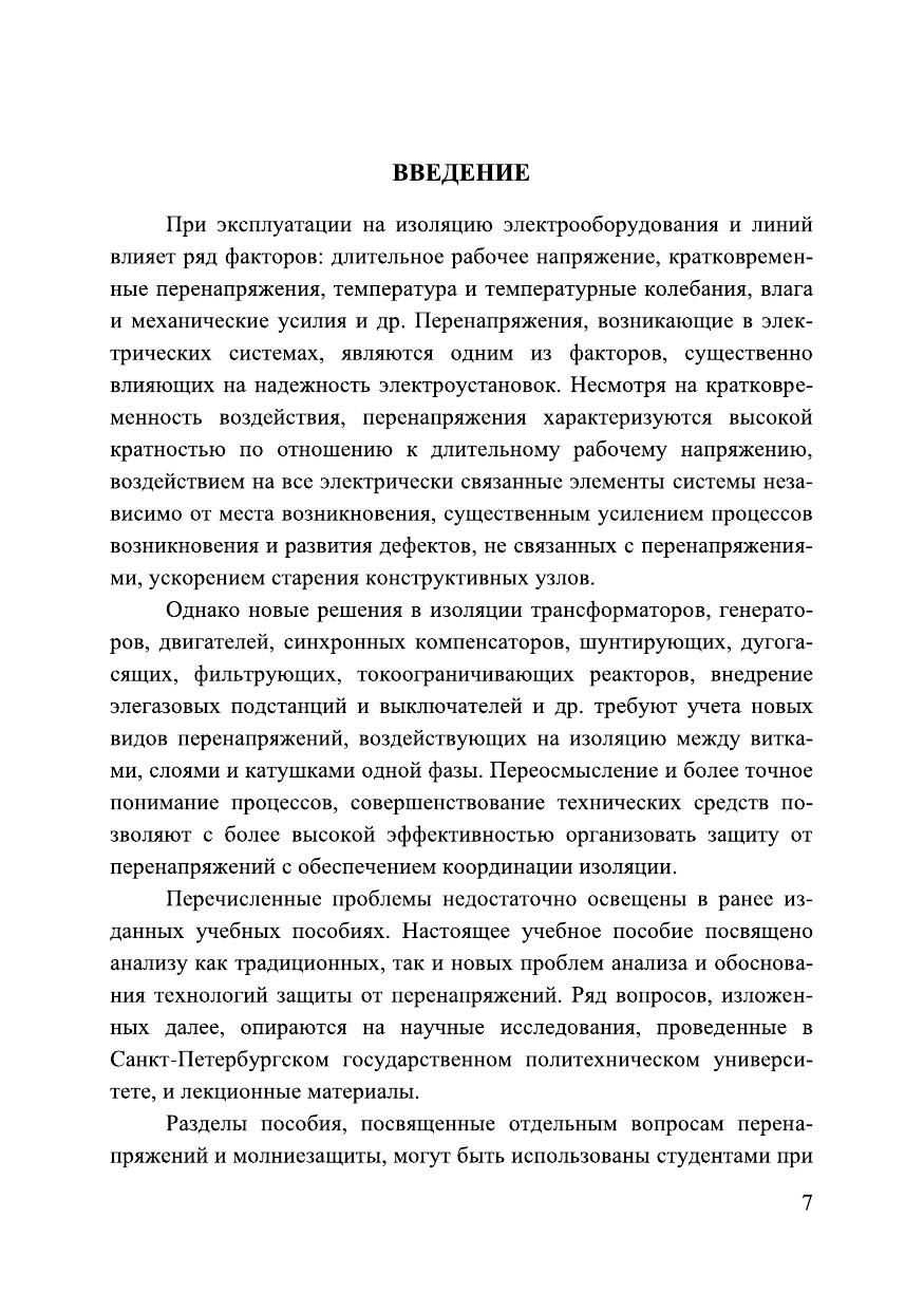 Дано понятие об электрических перенапряжениях. Рассмотрены основные характеристики перенапряжений: величина (кратность), форма, повторяемость и широта охвата сети. Проанализированы основные источники перенапряжений в сетях низкого (до 1 кВ), среднего (6–35 кВ), высокого (110 кВ и выше) напряжений. Проведена классификация внешних и внутренних перенапряжений. Даны технологии защиты от перенапряжений с помощью схемных и организационных мероприятий. Рассмотрены вопросы координации изоляции при воздействии на нее перенапряжений, электромагнитной совместимости между электроэнергетикой, техносферой и биосферой.