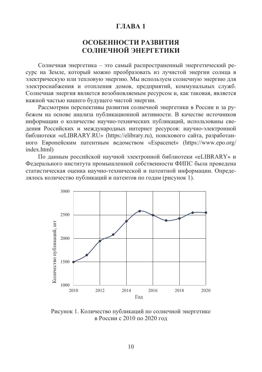 Рассмотрены истоки зарождения солнечной энергетики, первые солнечные батареи и их совершенствование. Дана оценка коэффициента полезного действия каждому подтипу солнечных батарей. Изложена информация о технологии изготовления. Приведена классификация и описаны крупнейшие солнечные электростанции. Представлены результаты статистического анализа научно-технической и патентной информации по публикационной активности по проблеме солнечной энергетики в России и за рубежом. Описано использование солнечной энергетики на объектах топливно-энергетического комплекса, автомобильном, водном, воздушном транспорте, космических аппаратах, гражданских объектах, в быту. Оцениваются перспективы и проблемы.