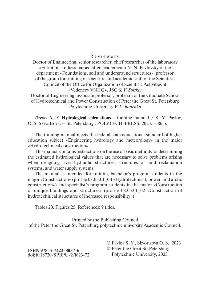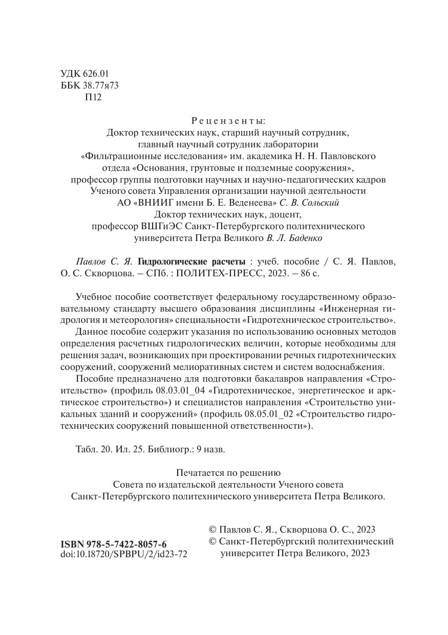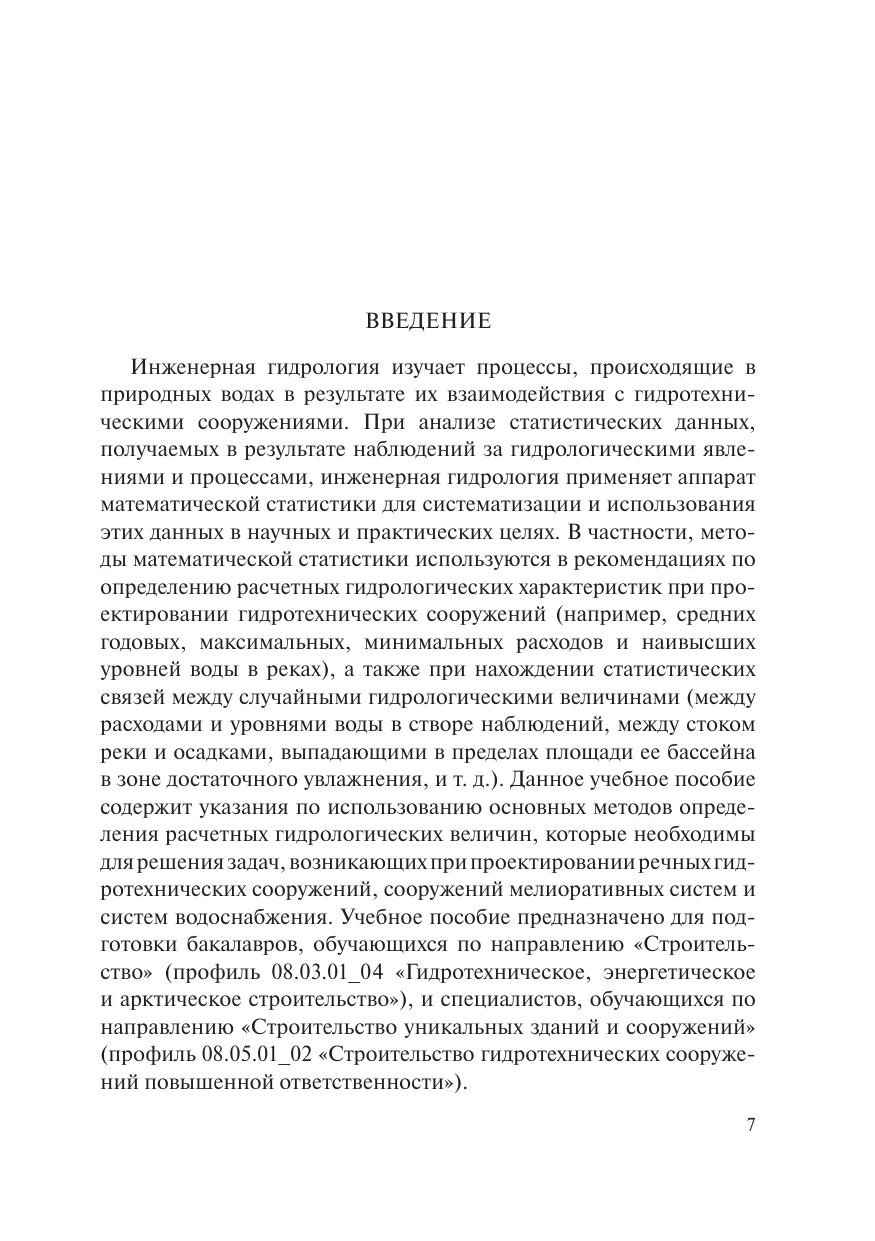 Учебное пособие соответствует федеральному государственному образовательному стандарту высшего образования дисциплины «Инженерная гидрология и метеорология» специальности «Гидротехническое строительство». Данное пособие содержит указания по использованию основных методов определения расчетных гидрологических величин, которые необходимы для решения задач, возникающих при проектировании речных гидротехнических сооружений, сооружений мелиоративных систем и систем водоснабжения. Пособие предназначено для подготовки бакалавров направления «Строительство» (профиль 08.03.01_04 «Гидротехническое, энергетическое и арктическое строительство») и специалистов направления «Строительство уникальных зданий и сооружений» (профиль 08.05.01_02 «Строительство гидро- технических сооружений повышенной ответственности»).