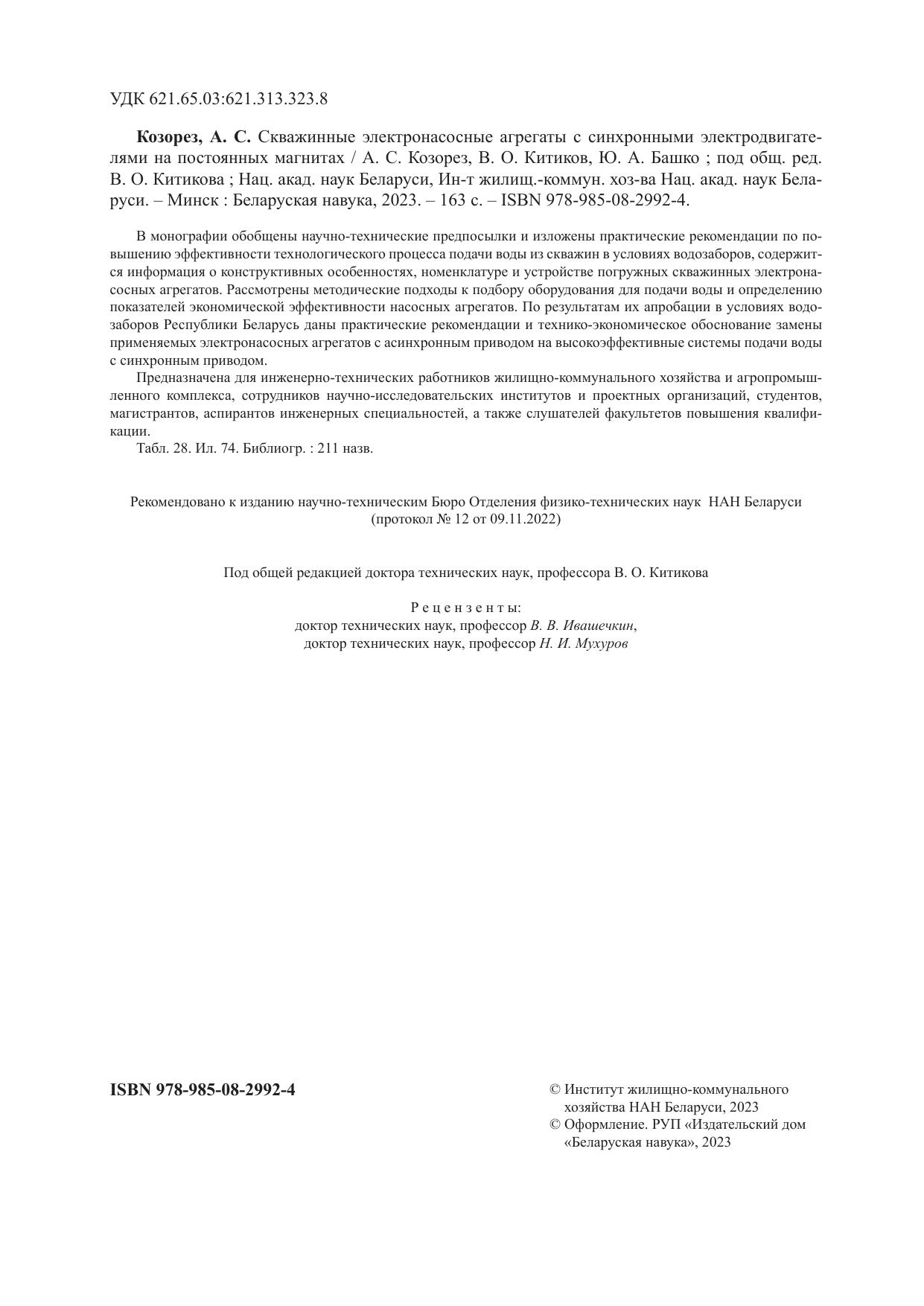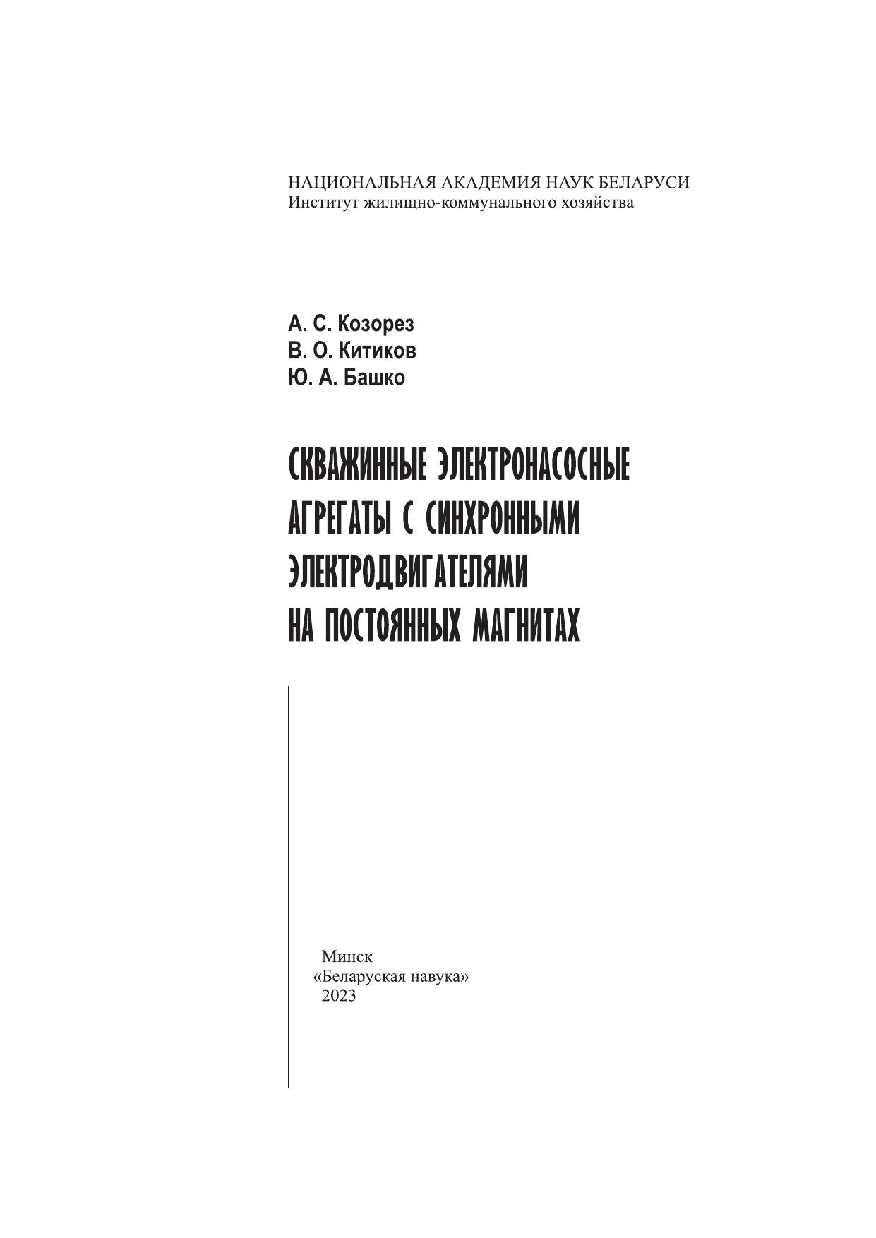 В монографии обобщены научно-технические предпосылки и изложены практические рекомендации по повышению эффективности технологического процесса подачи воды из скважин в условиях водозаборов, содержится информация о конструктивных особенностях, номенклатуре и устройстве погружных скважинных электронасосных агрегатов. Рассмотрены методические подходы к подбору оборудования для подачи воды и определению показателей экономической эффективности насосных агрегатов. По результатам их апробации в условиях водозаборов Республики Беларусь даны практические рекомендации и технико-экономическое обоснование замены применяемых электронасосных агрегатов с асинхронным приводом на высокоэффективные системы подачи воды с синхронным приводом. Предназначена для инженерно-технических работников жилищно-коммунального хозяйства и агропромышленного комплекса, сотрудников научно-исследовательских институтов и проектных организаций, студентов, магистрантов, аспирантов инженерных специальностей, а также слушателей факультетов повышения квалификации.