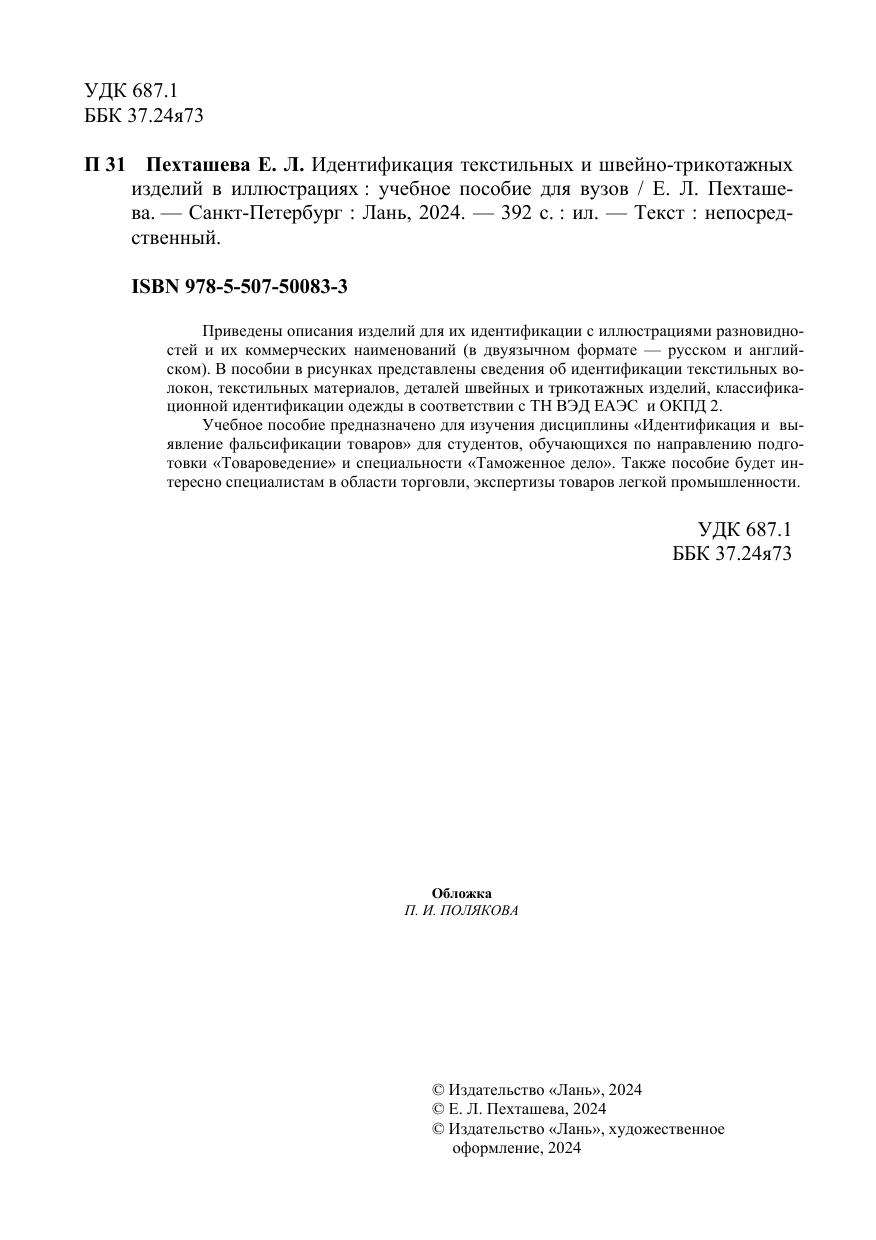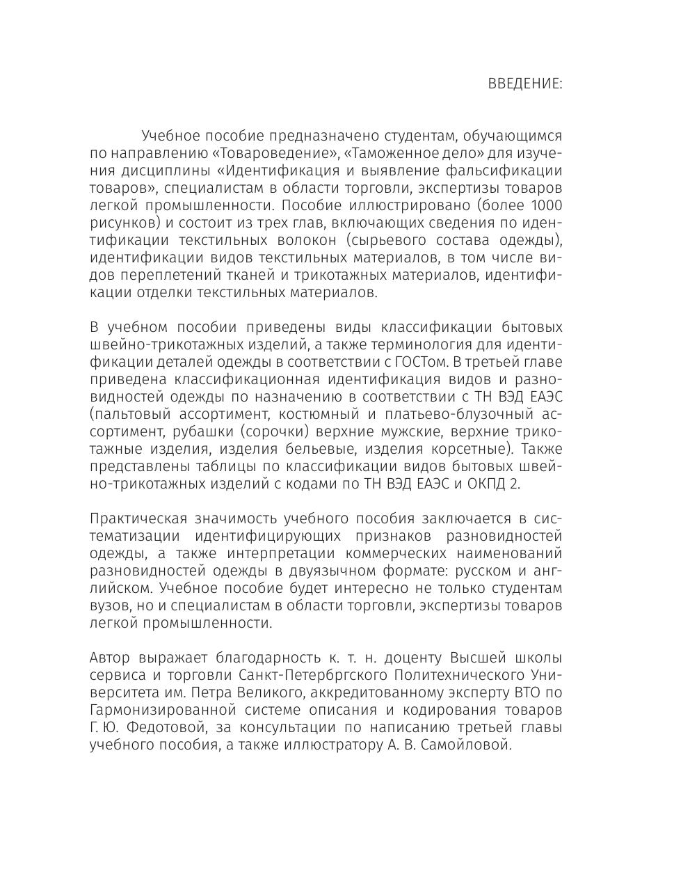 Приведены описания изделий для их идентификации с иллюстрациями разновидностей и их коммерческих наименований (в двуязычном формате — русском и английском). В пособии в рисунках представлены сведения об идентификации текстильных волокон, текстильных материалов, деталей швейных и трикотажных изделий, классификационной идентификации одежды в соответствии с ТН ВЭД ЕАЭС и ОКПД 2. Учебное пособие предназначено для изучения дисциплины «Идентификация и выявление фальсификации товаров» для студентов, обучающихся по направлению подготовки «Товароведение» и специальности «Таможенное дело». Также пособие будет интересно специалистам в области торговли, экспертизы товаров легкой промышленности.