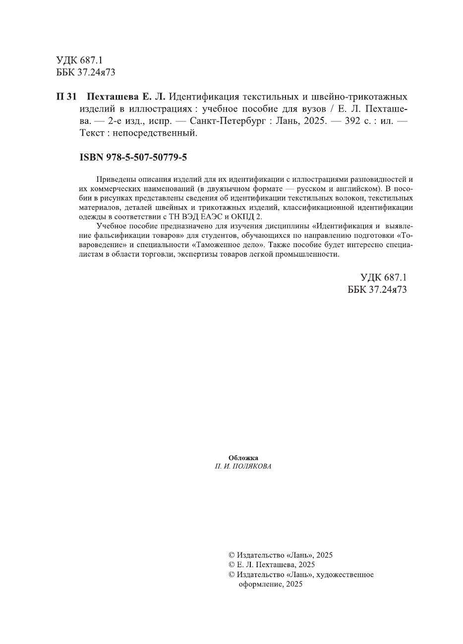 Приведены описания изделий для их идентификации с иллюстрациями разновидностей и их коммерческих наименований (в двуязычном формате — русском и английском). В пособии в рисунках представлены сведения об идентификации текстильных волокон, текстильных материалов, деталей швейных и трикотажных изделий, классификационной идентификации одежды в соответствии с ТН ВЭД ЕАЭС и ОКПД 2. Учебное пособие предназначено для изучения дисциплины «Идентификация и выявление фальсификации товаров» для студентов, обучающихся по направлению подготовки «Товароведение» и специальности «Таможенное дело». Также пособие будет интересно специалистам в области торговли, экспертизы товаров легкой промышленности.