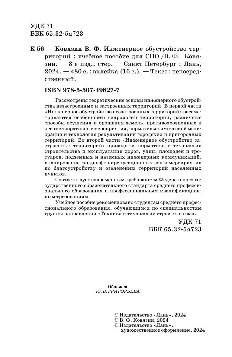 Рассмотрены теоретические основы инженерного обустройства незастроенных и застроенных территорий. В первой части «Инженерное обустройство незастроенных территорий» рассматриваются особенности гидрологии территории, различные способы осушения и орошения земель, противоэрозионные и лесомелиоративные мероприятия, нормативы химической мелиорации и технология рекультивации городских и пригородных территорий. Во второй части «Инженерное обустройство застроенных территорий» приводятся нормативы и технология строительства и эксплуатации дорог, улиц, площадей и тротуаров, подземных и наземных инженерных коммуникаций, планирование ландшафтно-рекреационных зон и мероприятия по благоустройству и озеленению территорий населенных пунктов. Учебное пособие рекомендовано студентам среднего профессионального образования, обучающимся по специальностям группы направлений «Техника и технологии строительства». Соответствует современным требованиям Федерального государственного образовательного стандарта среднего профессионального образования и профессиональным квалификационным требованиям.