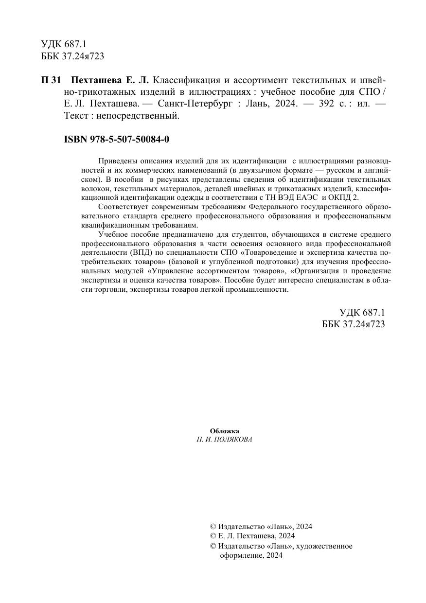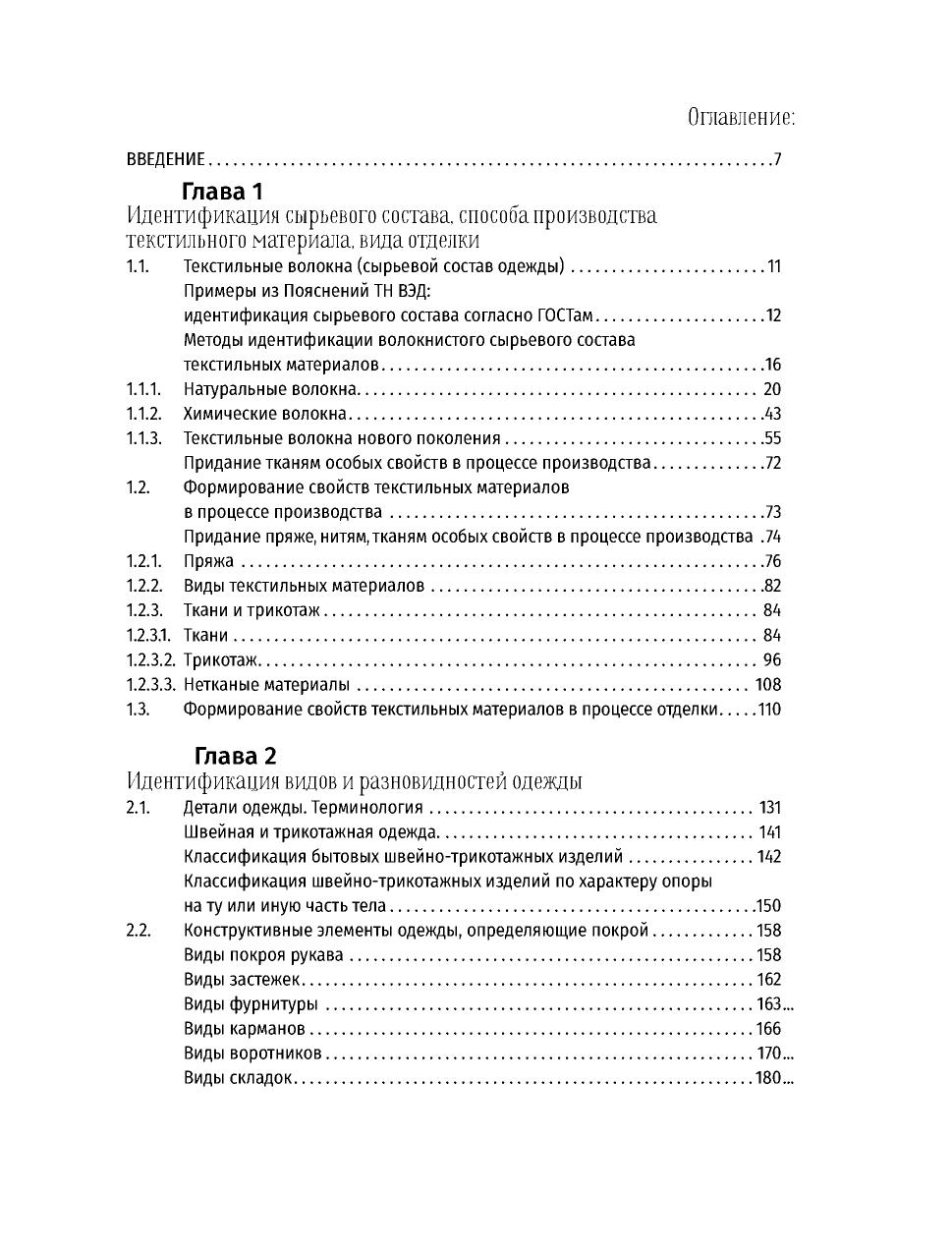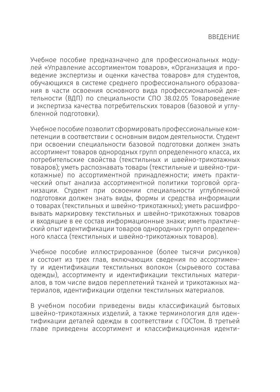 Приведены описания изделий для их идентификации с иллюстрациями разновидностей и их коммерческих наименований (в двуязычном формате — русском и английском). В пособии в рисунках представлены сведения об идентификации текстильных волокон, текстильных материалов, деталей швейных и трикотажных изделий, классификационной идентификации одежды в соответствии с ТН ВЭД ЕАЭС и ОКПД 2. Соответствует современным требованиям Федерального государственного образовательного стандарта среднего профессионального образования и профессиональным квалификационным требованиям. Учебное пособие предназначено для студентов, обучающихся в системе среднего профессионального образования в части освоения основного вида профессиональной деятельности (ВПД) по специальности СПО «Товароведение и экспертиза качества потребительских товаров» (базовой и углубленной подготовки) для изучения профессиональных модулей «Управление ассортиментом товаров», «Организация и проведение экспертизы и оценки качества товаров». Пособие будет интересно специалистам в области торговли, экспертизы товаров легкой промышленности.