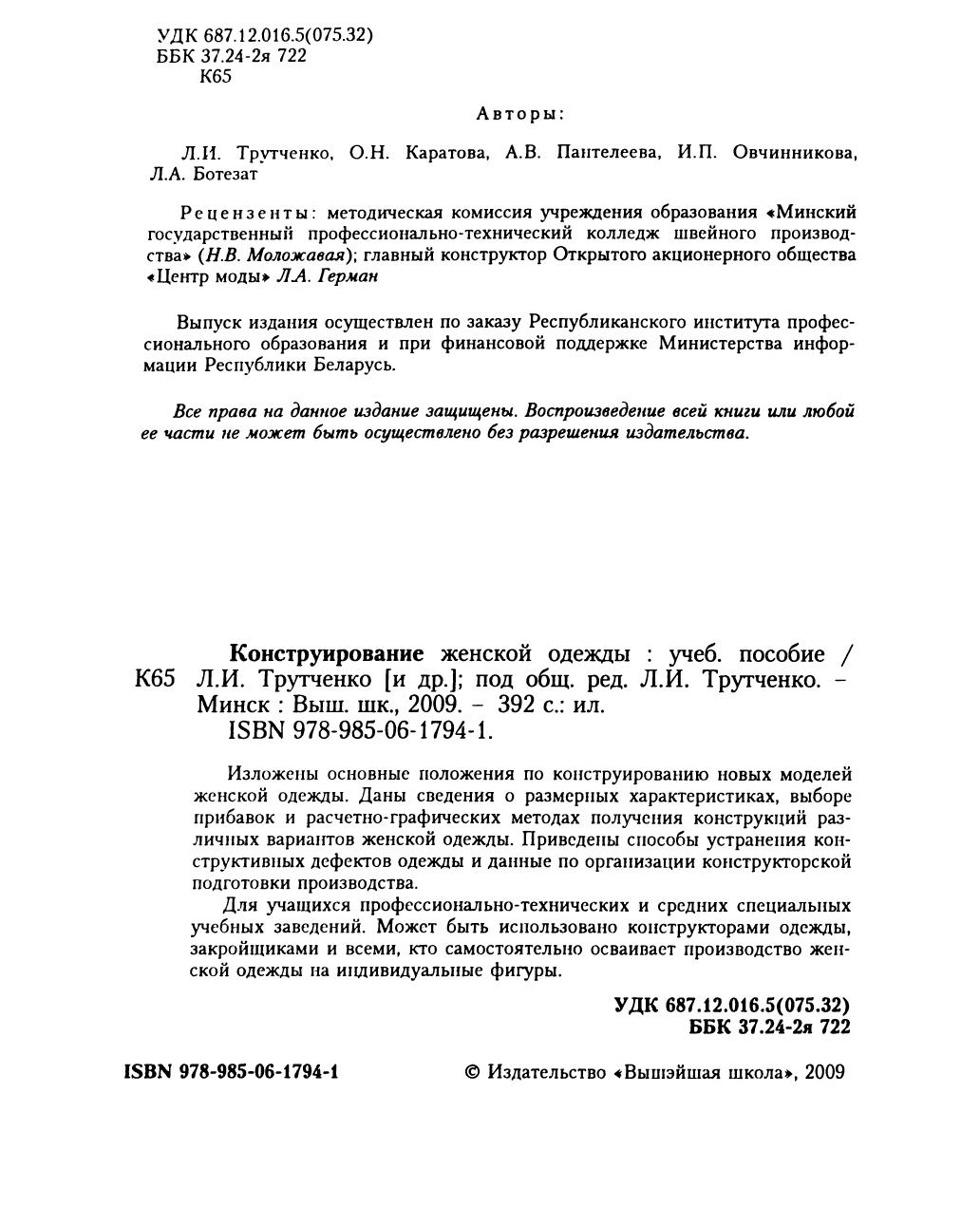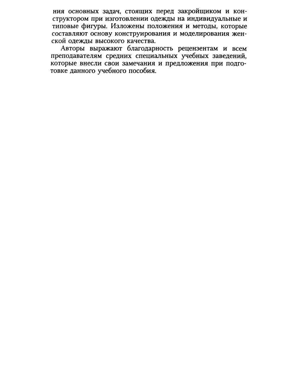 Изложены основные положения по конструированию новых моделей женской одежды. Даны сведения о размерных характеристиках, выборе прибавок и расчетно-графических методах получения конструкций различных вариантов женской одежды. Приведены способы устранения конструктивных дефектов одежды и данные по организации конструкторской подготовки производства. Для учащихся профессионально-технических и средних специальных учебных заведений. Может быть использовано конструкторами одежды, закройщиками и всеми, кто самостоятельно осваивает производство женской одежды на индивидуальные фигуры.