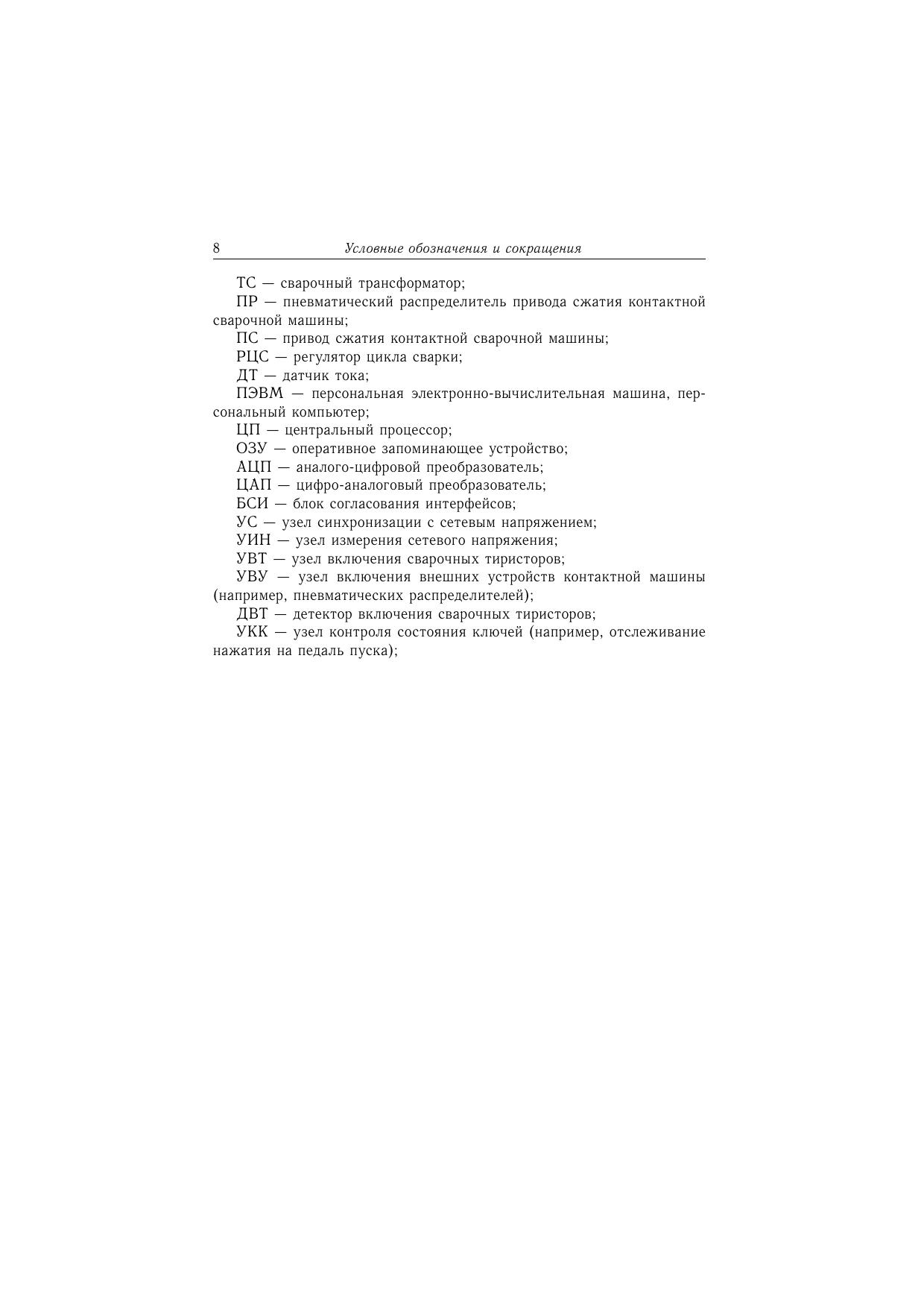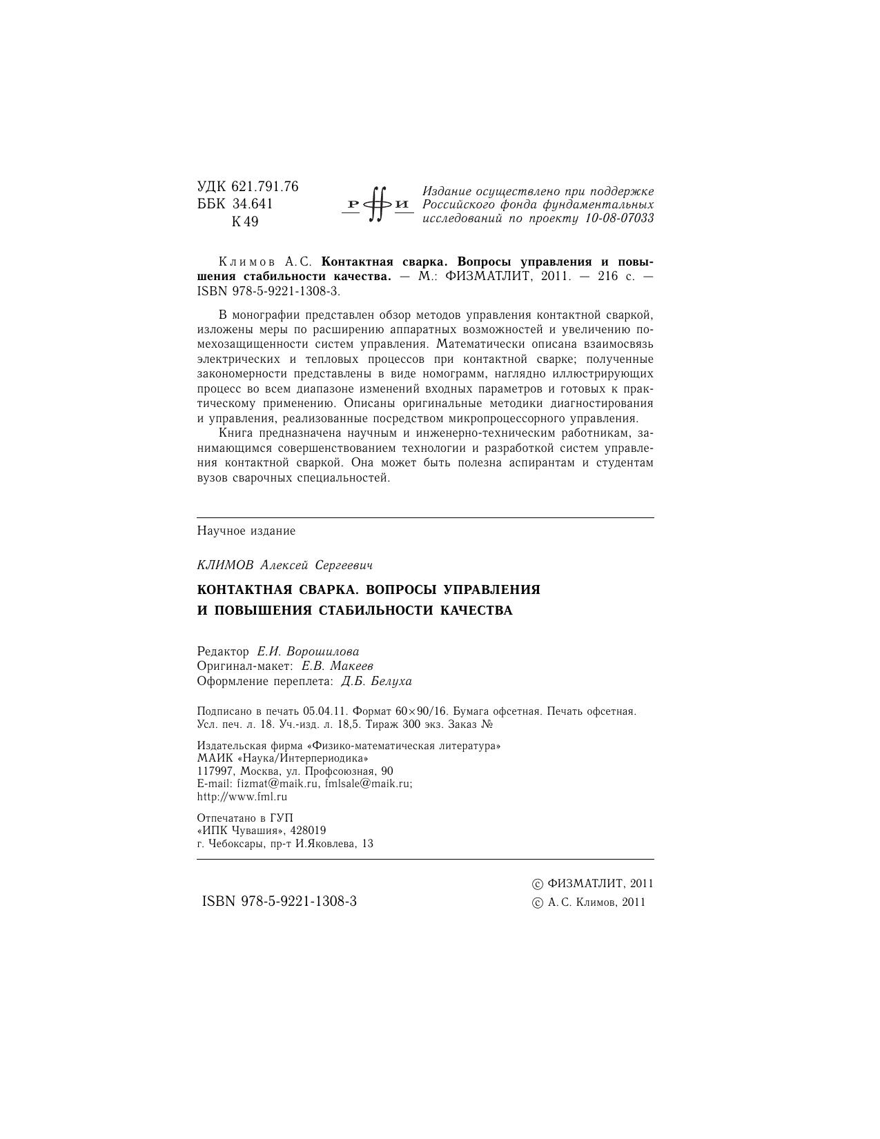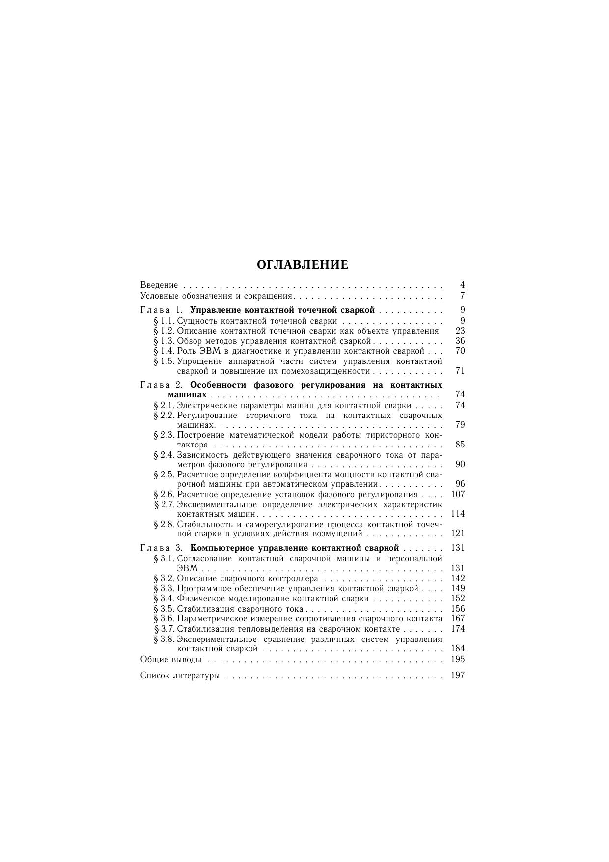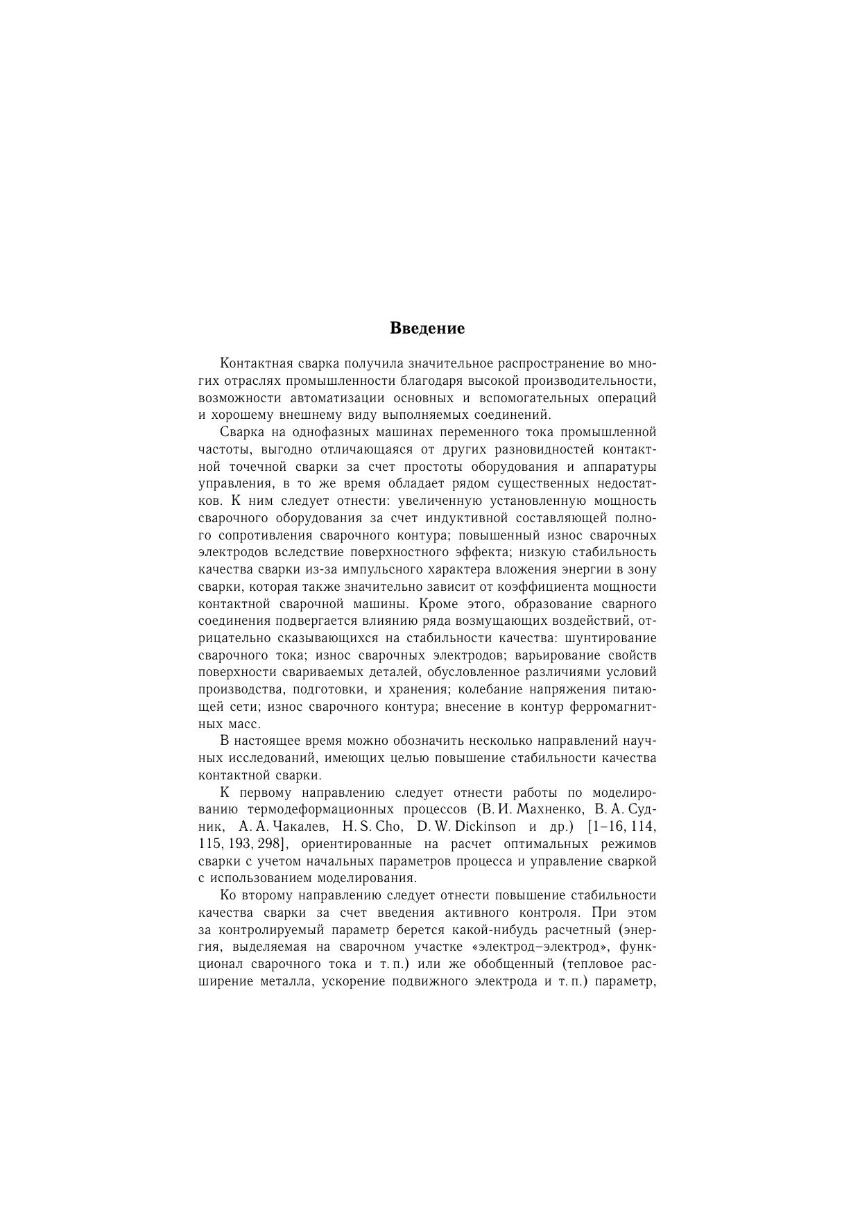 В монографии представлен обзор методов управления контактной сваркой, изложены меры по расширению аппаратных возможностей и увеличению по-мехозащищенности систем управления. Математически описана взаимосвязь электрических и тепловых процессов при контактной сварке полученные закономерности представлены в виде номограмм, наглядно иллюстрирующих процесс во всем диапазоне изменений входных параметров и готовых к практическому применению. Описаны оригинальные методики диагностирования и управления, реализованные посредством микропроцессорного управления. Книга предназначена научным и инженерно-техническим работникам, занимающимся совершенствованием технологии и разработкой систем управления контактной сваркой. Она может быть полезна аспирантам и студентам вузов сварочных специальностей.