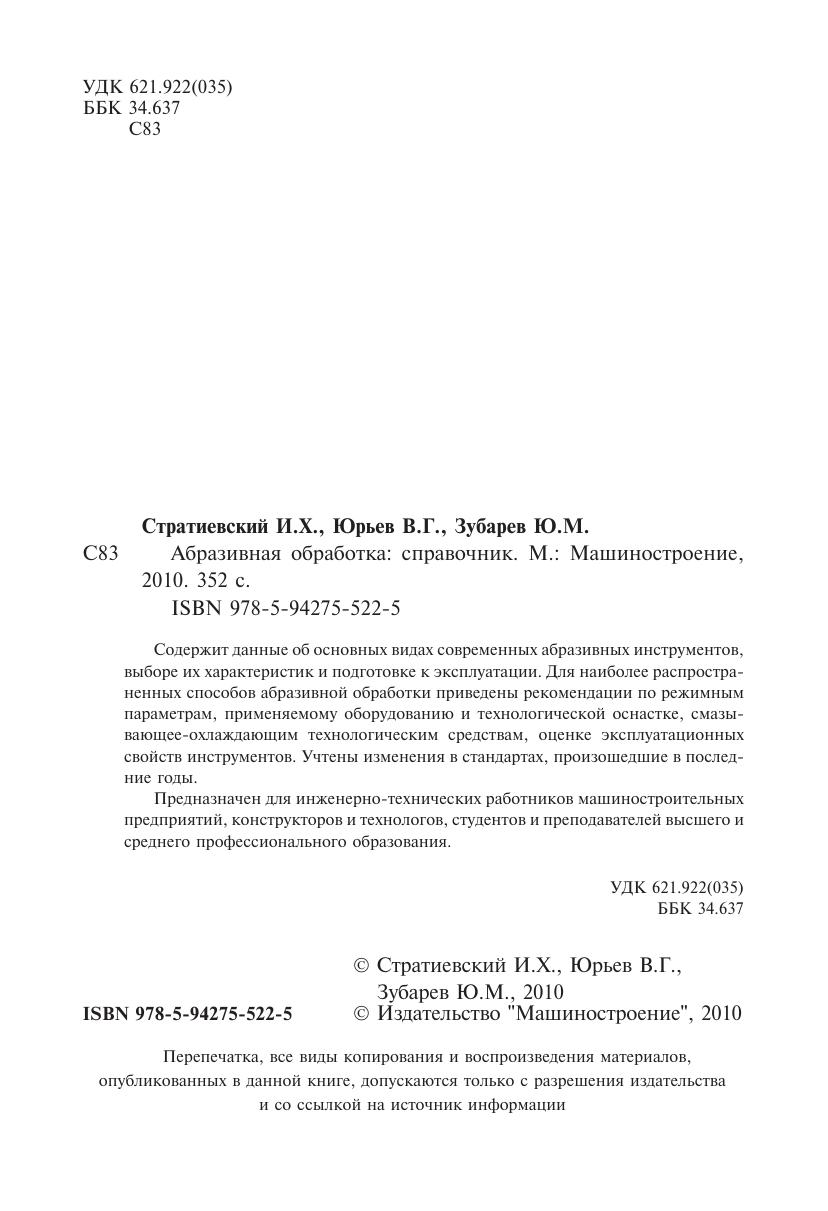 Cодержит данные об основных видах современных абразивных инструментов, выборе их характеристик и подготовке к эксплуатации. Для наиболее распространенных способов абразивной обработки приведены рекомендации по режимным параметрам, применяемому оборудованию и технологической оснастке, смазывающее охлаждающим технологическим средствам, оценке эксплуатационных свойств инструментов. Учтены изменения в стандартах, произошедшие в последние годы. Предназначен для инженерно технических работников машиностроительных предприятий, конструкторов и технологов, студентов и преподавателей высшего и среднего профессионального образования.