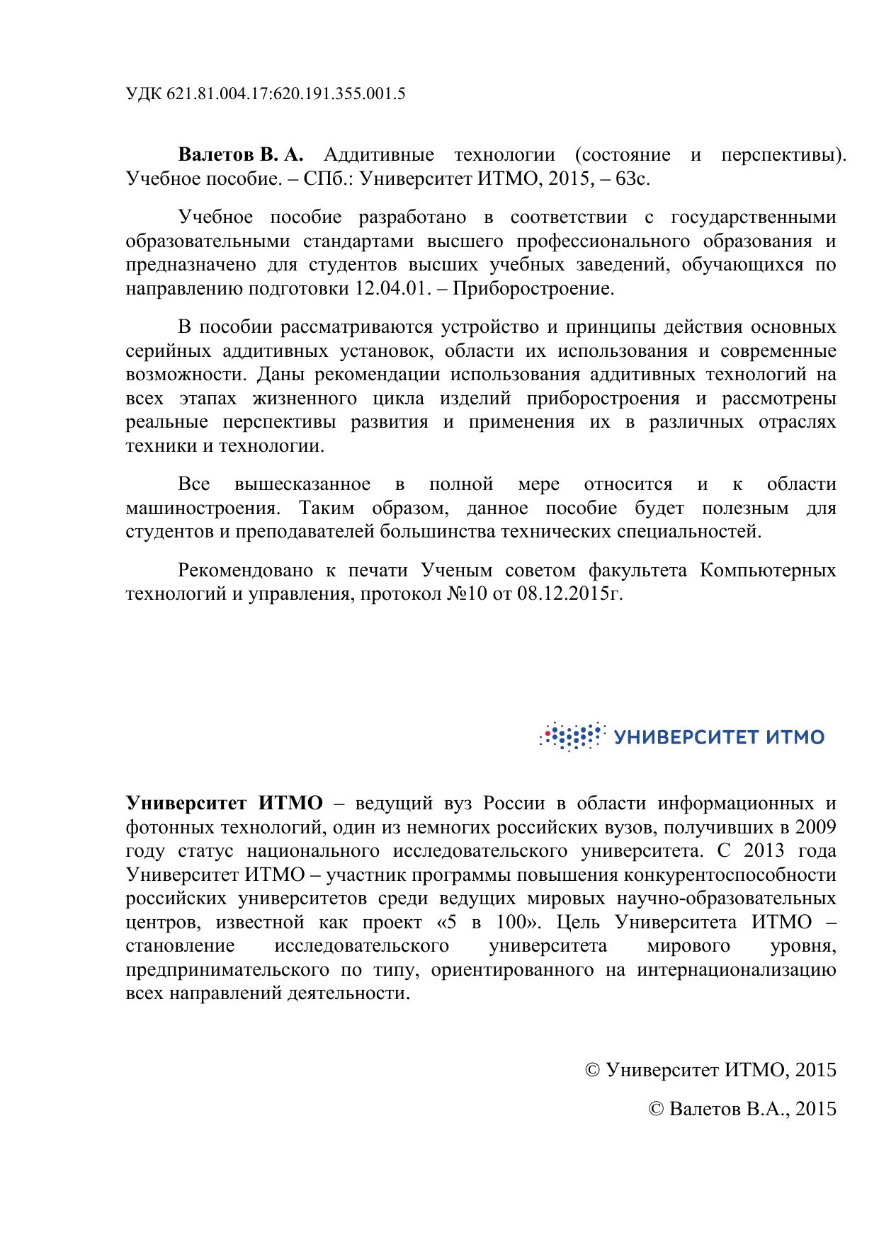 Учебное пособие разработано в соответствии с государственными образовательными стандартами высшего профессионального образования и предназначено для студентов высших учебных заведений, обучающихся по направлению подготовки 12.04.01. – Приборостроение. В пособии рассматриваются устройство и принципы действия основных серийных аддитивных установок, области их использования и современные возможности. Даны рекомендации использования аддитивных технологий на всех этапах жизненного цикла изделий приборостроения и рассмотрены реальные перспективы развития и применения их в различных отраслях техники и технологии.