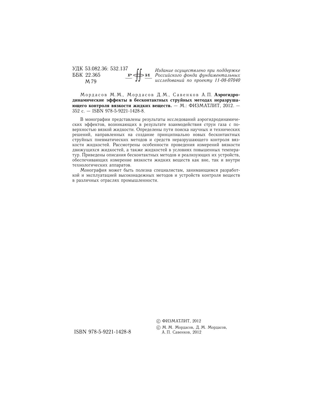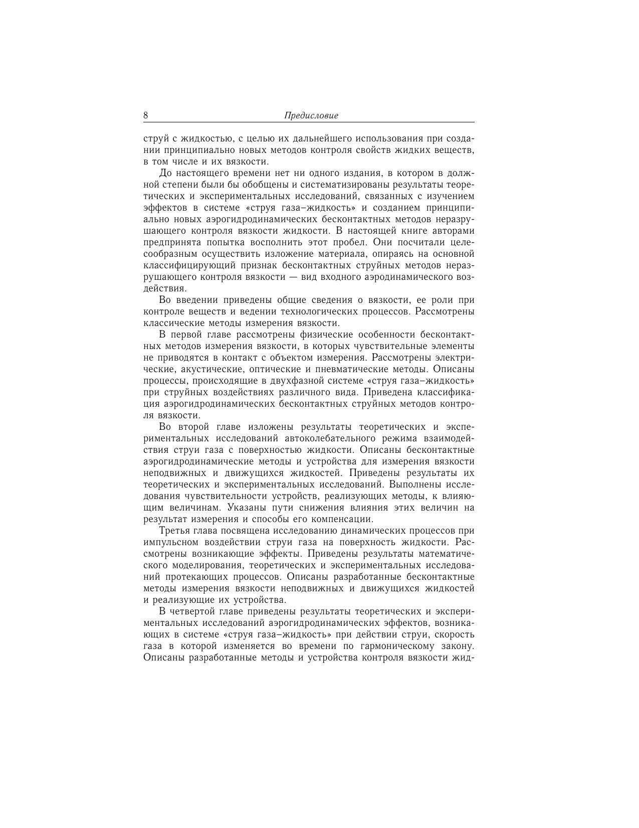 В монографии представлены результаты исследований аэрогидродинамических эффектов, возникающих в результате взаимодействия струи газа с поверхностью вязкой жидкости. Определены пути поиска научных и технических решений, направленных на создание принципиально новых бесконтактных струйных пневматических методов и средств неразрушающего контроля вязкости жидкостей. Рассмотрены особенности проведения измерений вязкости движущихся жидкостей, а также жидкостей в условиях повышенных температур. Приведены описания бесконтактных методов и реализующих их устройств, обеспечивающих измерение вязкости жидких веществ как вне, так и внутри технологических аппаратов. Монография может быть полезна специалистам, занимающимся разработкой и эксплуатацией высоконадежных методов и устройств контроля веществ в различных отраслях промышленности.