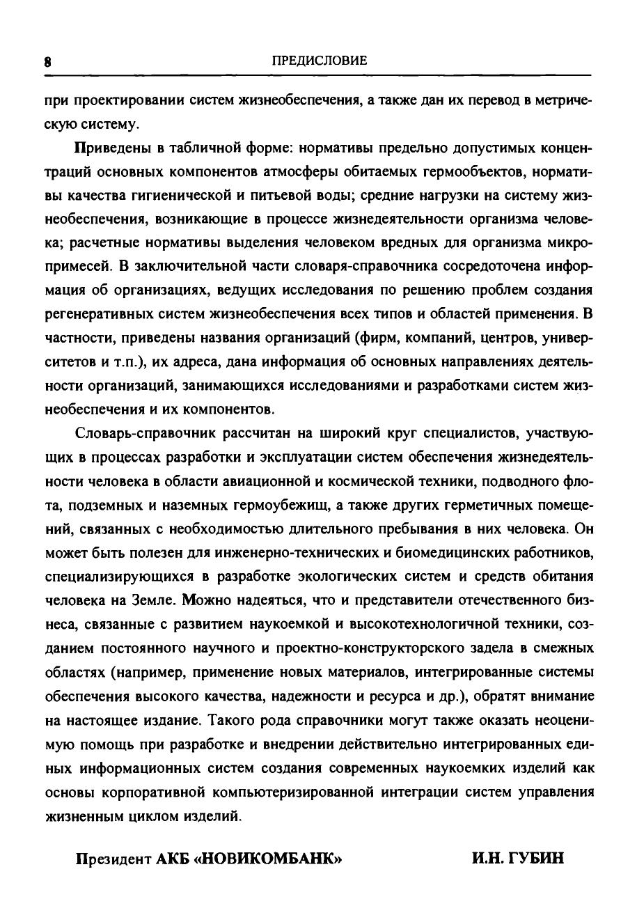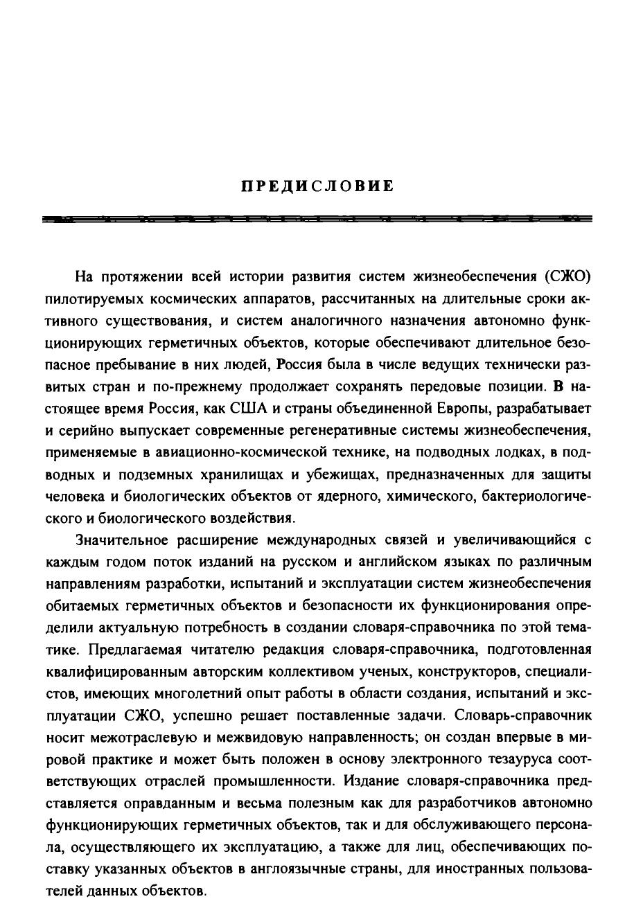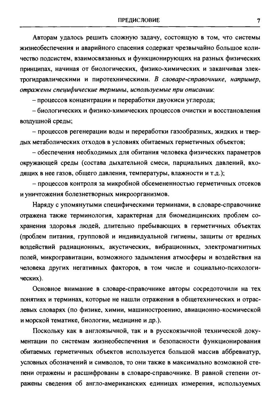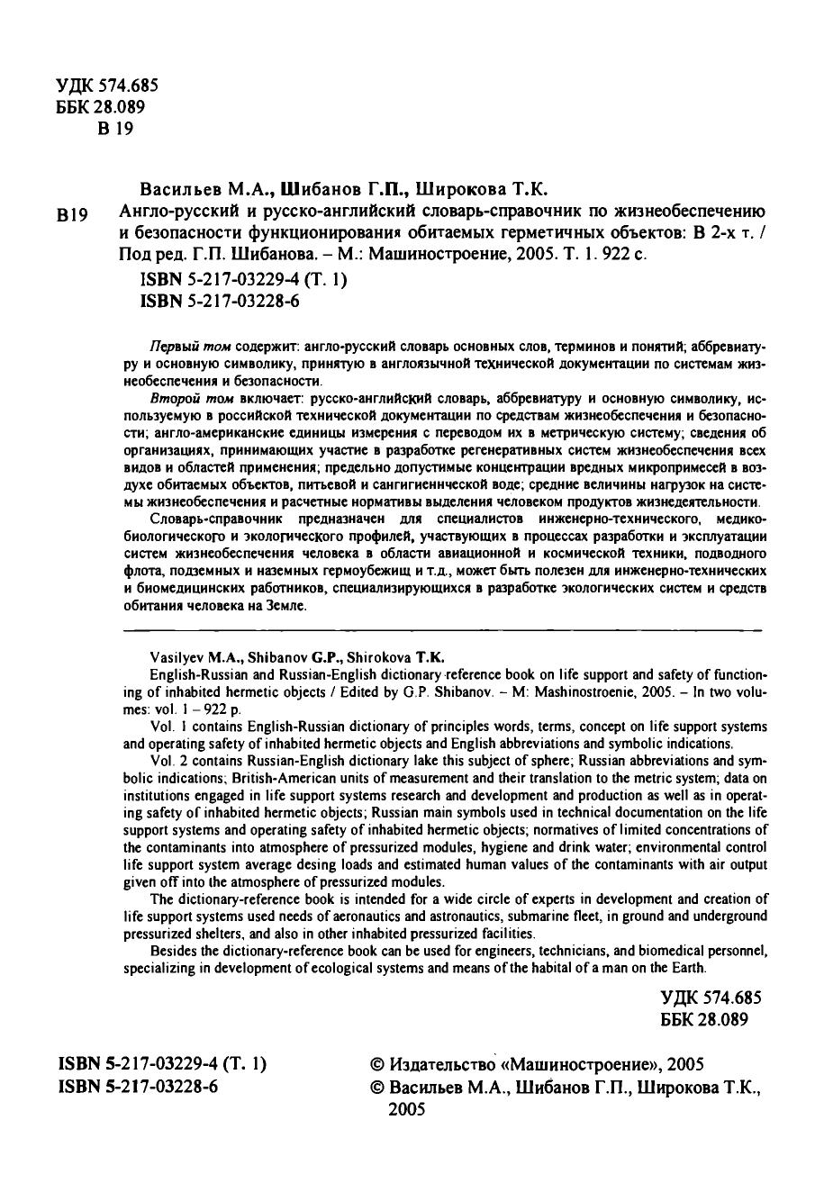 Первый том содержит: англо-русский словарь основных слов, терминов и понятий аббревиатуру и основную символику, принятую в англоязычной технической документации по системам жизнеобеспечения и безопасности. Второй том включает: русско-английский словарь, аббревиатуру и основную символику, используемую в российской технической документации по средствам жизнеобеспечения и безопасности англо-американские единицы измерения с переводом их в метрическую систему сведения об организациях, принимающих участие в разработке регенеративных систем жизнеобеспечения всех видов и областей применения предельно допустимые концентрации вредных микропримесей в воздухе обитаемых объектов, питьевой и сангигиеннческой воде средние величины нагрузок на системы жизнеобеспечения и расчетные нормативы выделения человеком продуктов жизнедеятельности. Словарь-справочник предназначен для специалистов инженерно-технического, медико-биологического и экологического профилей, участвующих в процессах разработки и эксплуатации систем жизнеобеспечения человека в области авиационной и космической техники, подводного флота, подземных и наземных гермоубежищ и т.д., может быть полезен для инженерно-технических и биомедицинских работников, специализирующихся в разработке экологических систем и средств обитания человека на Земле.