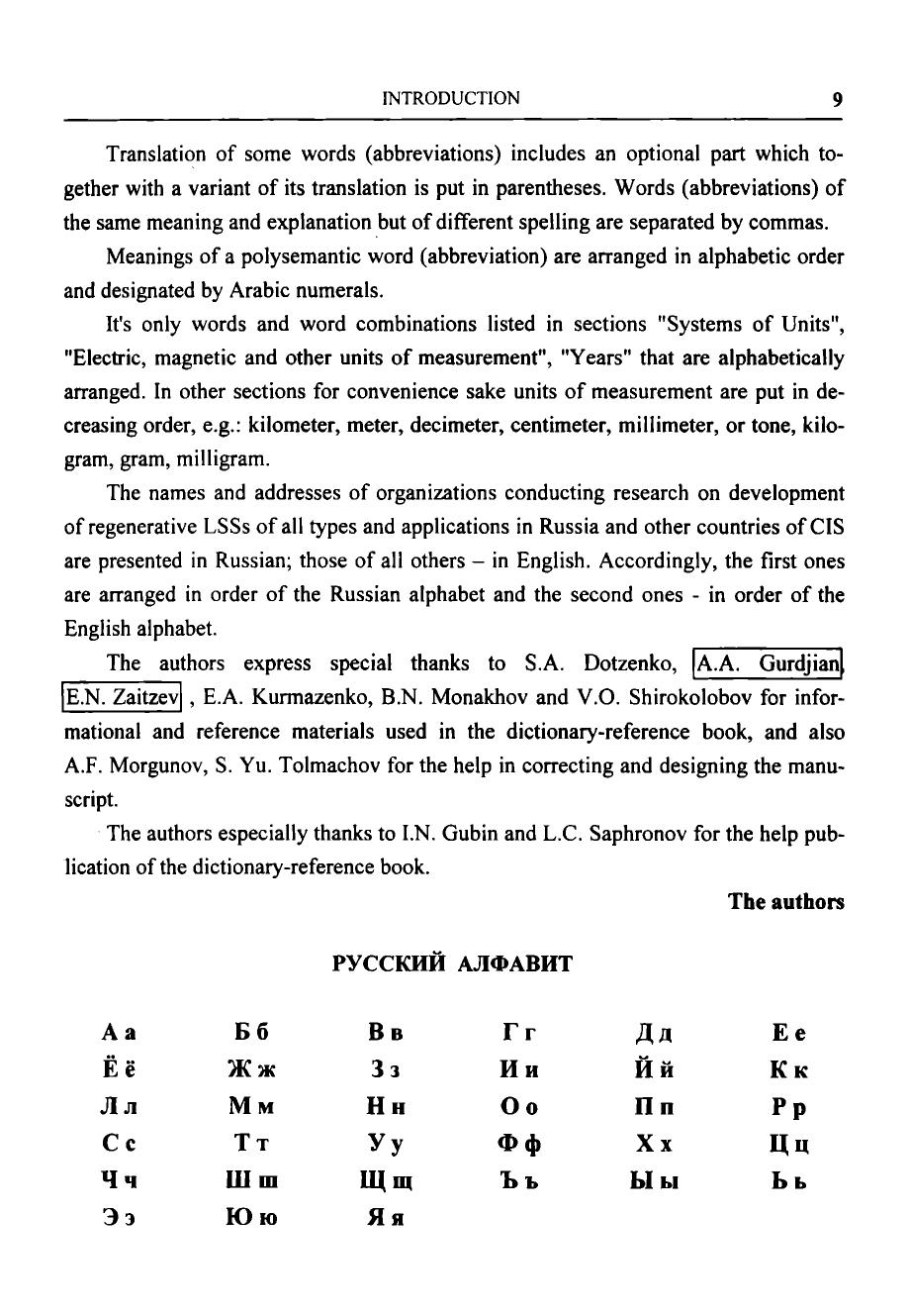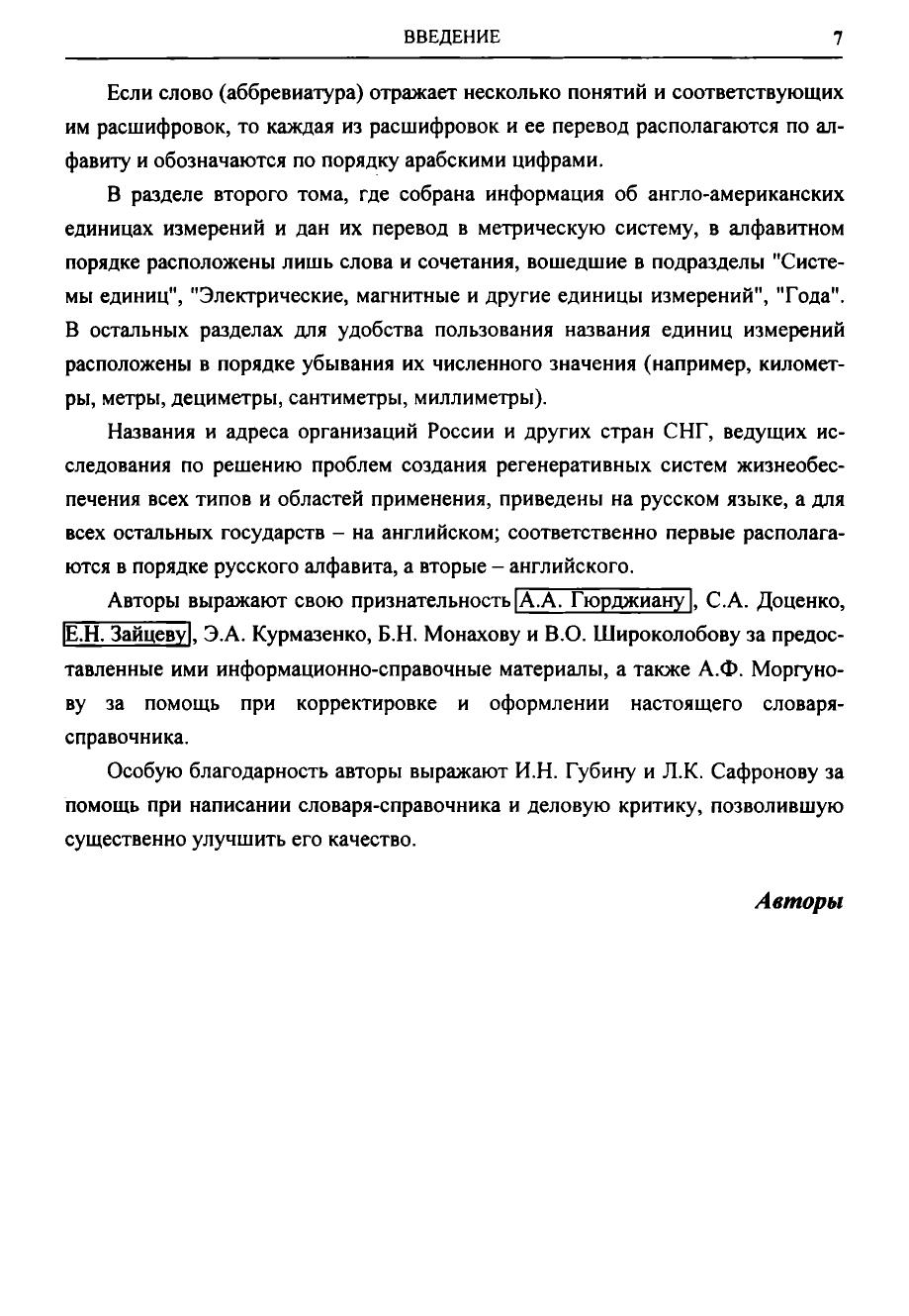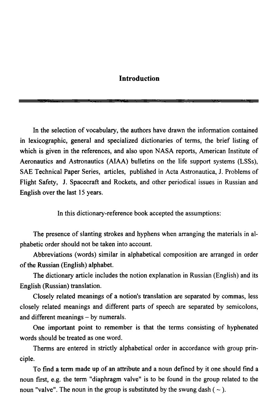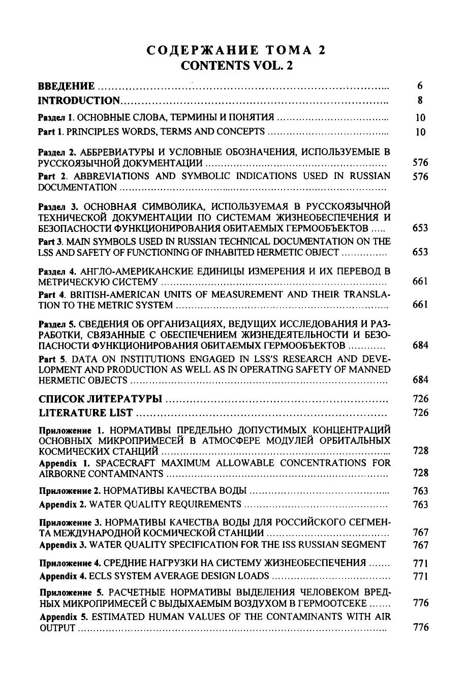 Первый том содержит: англо-русский словарь основных слов, терминов и понятий аббревиатуру и основную символику, принятую в англоязычной технической документации по системам жизнеобеспечения и безопасности. Второй том включает: русско-английский словарь, аббревиатуру и основную символику, используемую в российской технической документации по средствам жизнеобеспечения и безопасности англо-американские единицы измерения с переводом их в метрическую систему сведения об организациях, принимающих участие в разработке регенеративных систем жизнеобеспечения всех типов и областей применения нормативные характеристики по предельно допустимым концентрациям вредных микропримесей в воздухе обитаемых объектов, питьевой и сангигиенической воде средние величины нагрузок на системы жизнеобеспечения и расчетные нормативы выделения человеком продуктов жизнедеятельности. Словарь-справочник предназначен для специалистов инженерно-технического, медикобиологического и экологического профилей, участвующих в процессах разработки и эксплуатации систем жизнеобеспечения человека в области авиационной и космической техники, подводного флота, подземных и наземных гермоубежищ и т.д., может быть полезен для инженерно-технических и биомедицинских работников, специализирующихся в разработке экологических систем и средств обитания человека на Земле.
