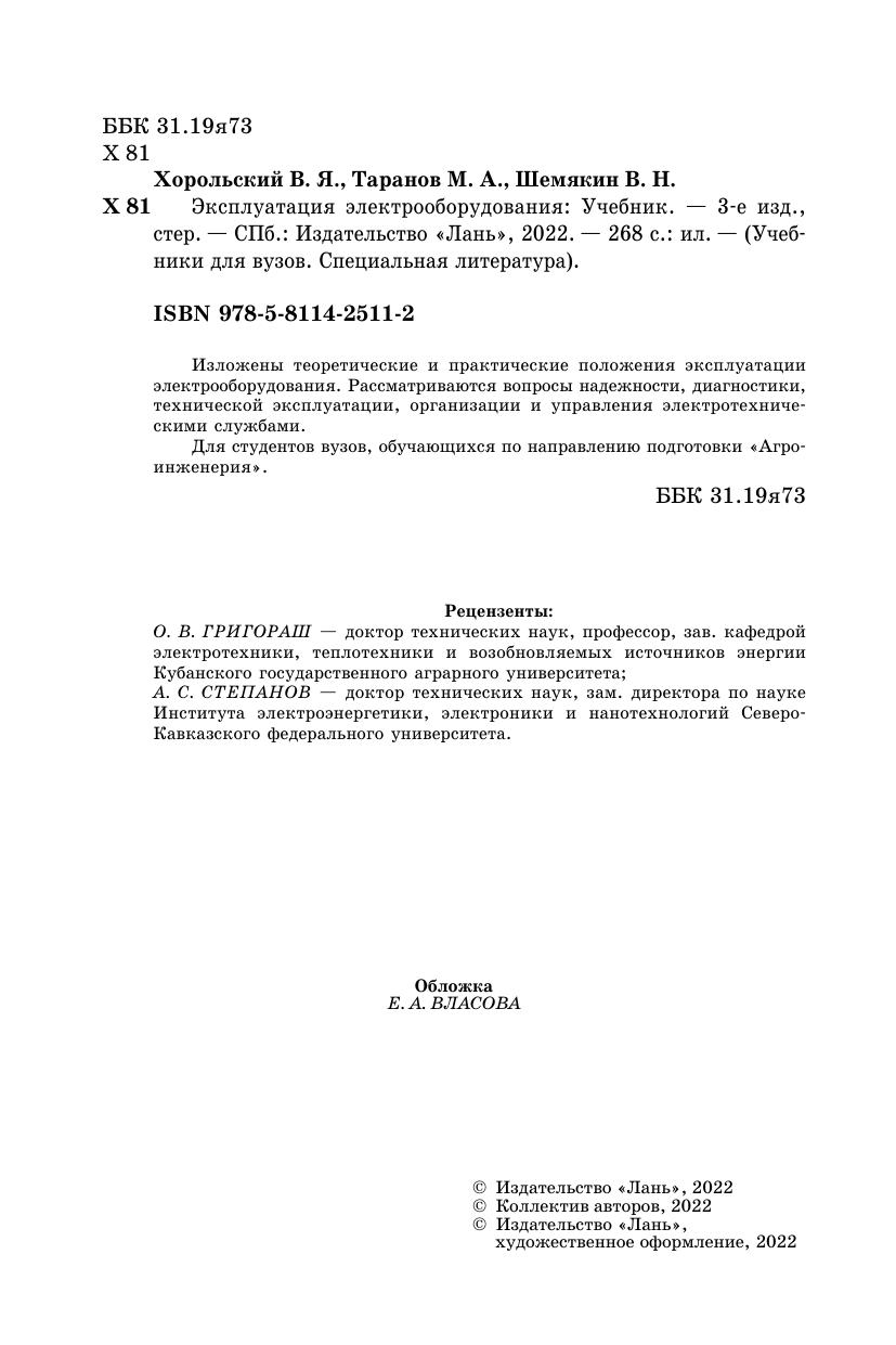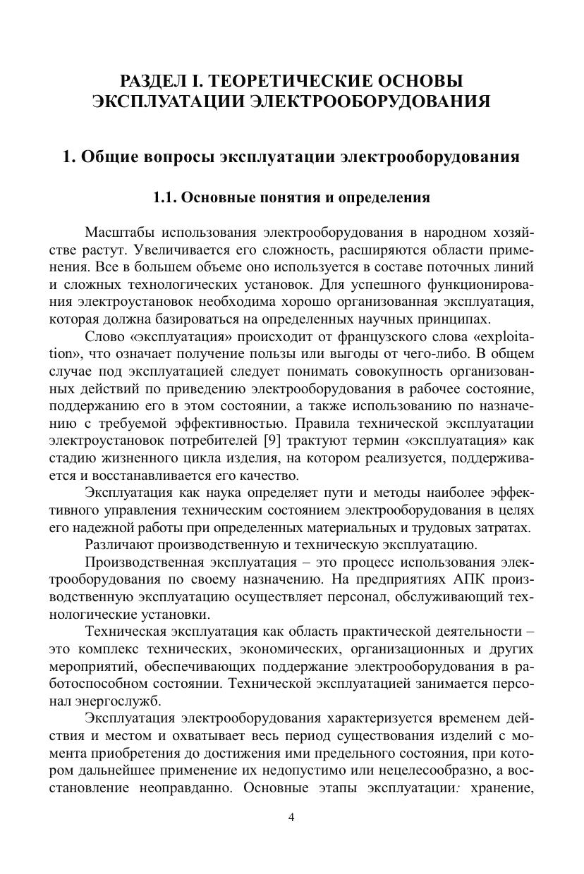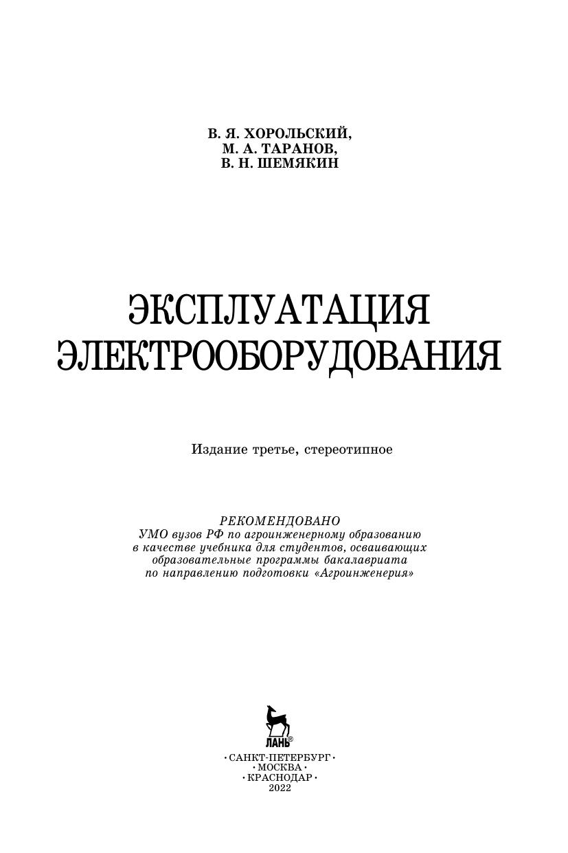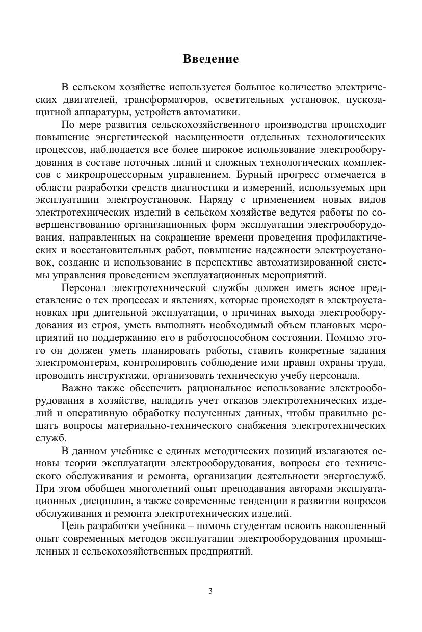 Изложены теоретические и практические положения эксплуатации электрооборудования. Рассматриваются вопросы надежности, диагностики, технической эксплуатации, организации и управления электротехническими службами. Для студентов вузов, обучающихся по направлению подготовки «Агроинженерия».