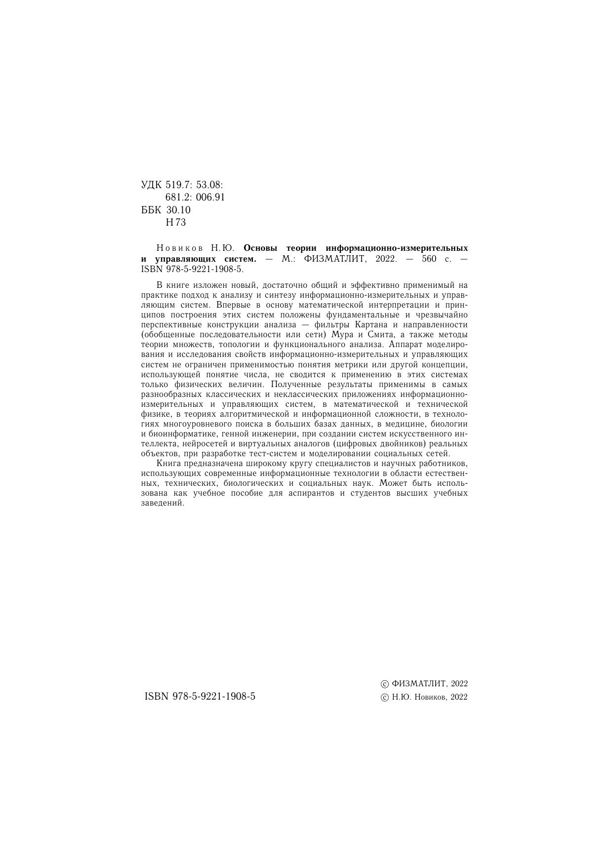 В книге изложен новый, достаточно общий и эффективно применимый на практике подход к анализу и синтезу информационно-измерительных и управляющим систем. Впервые в основу математической интерпретации и принципов построения этих систем положены фундаментальные и чрезвычайно перспективные конструкции анализа — фильтры Картана и направленности (обобщенные последовательности или сети) Мура и Смита, а также методы теории множеств, топологии и функционального анализа. Аппарат моделирования и исследования свойств информационно-измерительных и управляющих систем не ограничен применимостью понятия метрики или другой концепции, использующей понятие числа, не сводится к применению в этих системах только физических величин. Полученные результаты применимы в самых разнообразных классических и неклассических приложениях информационноизмерительных и управляющих систем, в математической и технической физике, в теориях алгоритмической и информационной сложности, в технологиях многоуровневого поиска в больших базах данных, в медицине, биологии и биоинформатике, генной инженерии, при создании систем искусственного интеллекта, нейросетей и виртуальных аналогов (цифровых двойников) реальных объектов, при разработке тест-систем и моделировании социальных сетей. Книга предназначена широкому кругу специалистов и научных работников, использующих современные информационные технологии в области естественных, технических, биологических и социальных наук. Может быть использована как учебное пособие для аспирантов и студентов высших учебных заведений.