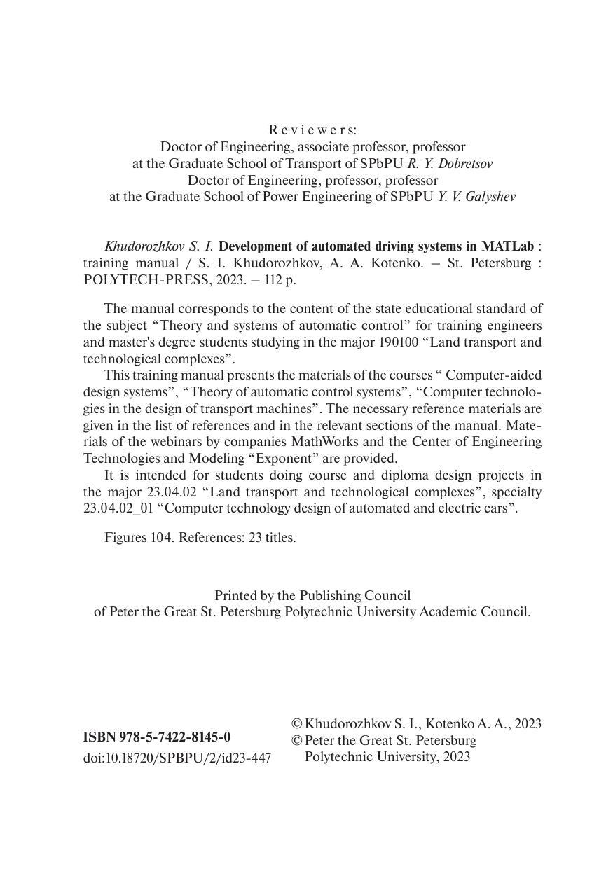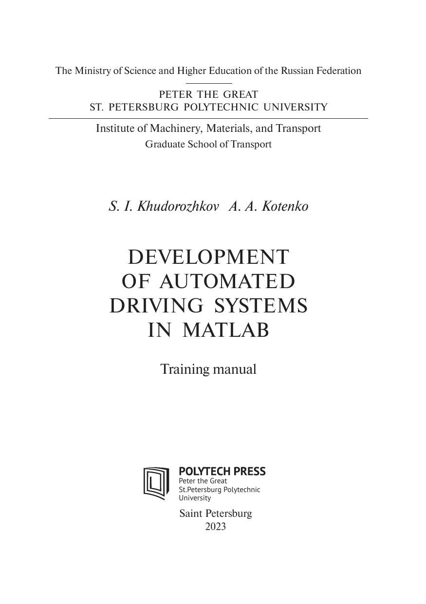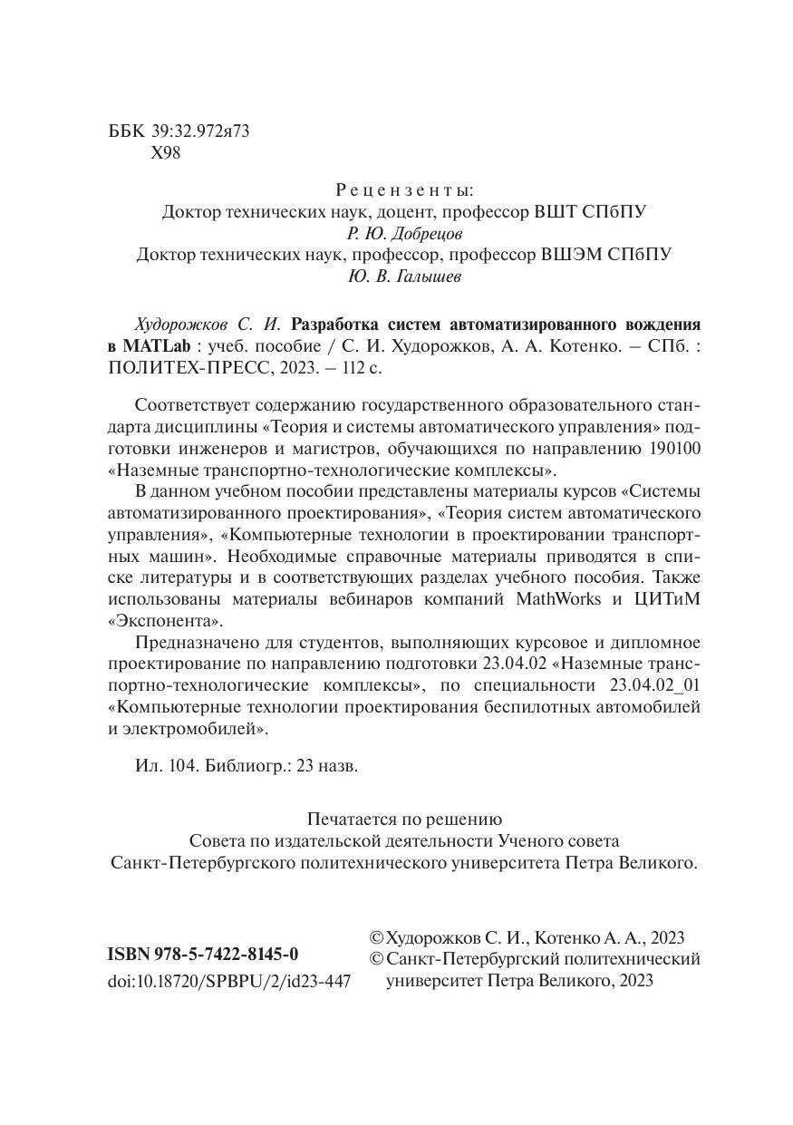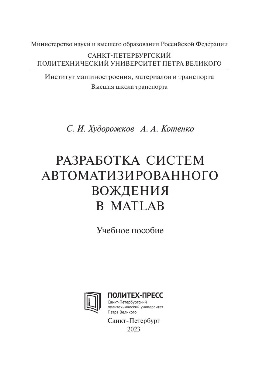 Соответствует содержанию государственного образовательного стандарта дисциплины «Теория и системы автоматического управления» подготовки инженеров и магистров, обучающихся по направлению 190100 «Наземные транспортно-технологические комплексы». В данном учебном пособии представлены материалы курсов «Системы автоматизированного проектирования», «Теория систем автоматического управления», «Компьютерные технологии в проектировании транспортных машин». Необходимые справочные материалы приводятся в списке литературы и в соответствующих разделах учебного пособия. Также использованы материалы вебинаров компаний MathWorks и ЦИТиМ «Экспонента». Предназначено для студентов, выполняющих курсовое и дипломное проектирование по направлению подготовки 23.04.02 «Наземные транспортно-технологические комплексы», по специальности 23.04.02_01 «Компьютерные технологии проектирования беспилотных автомобилей и электромобилей».