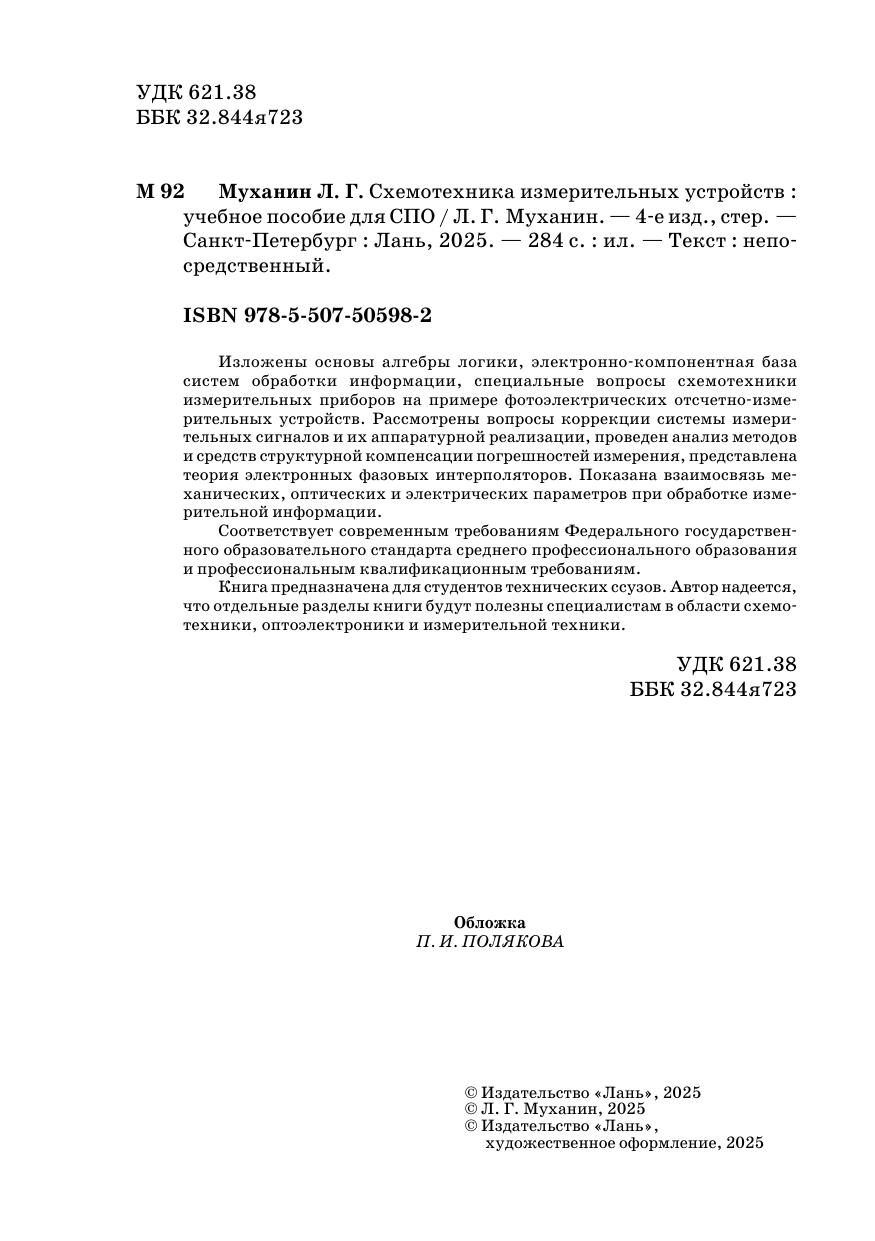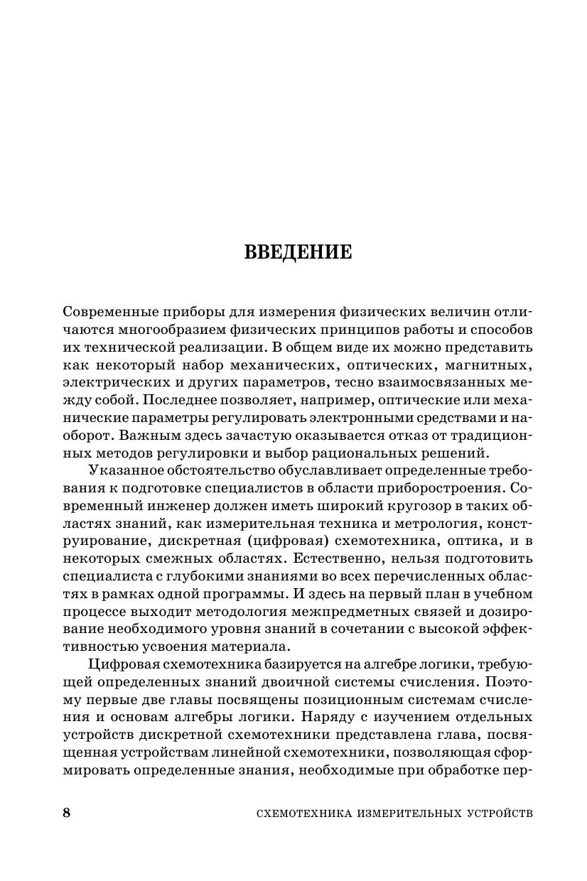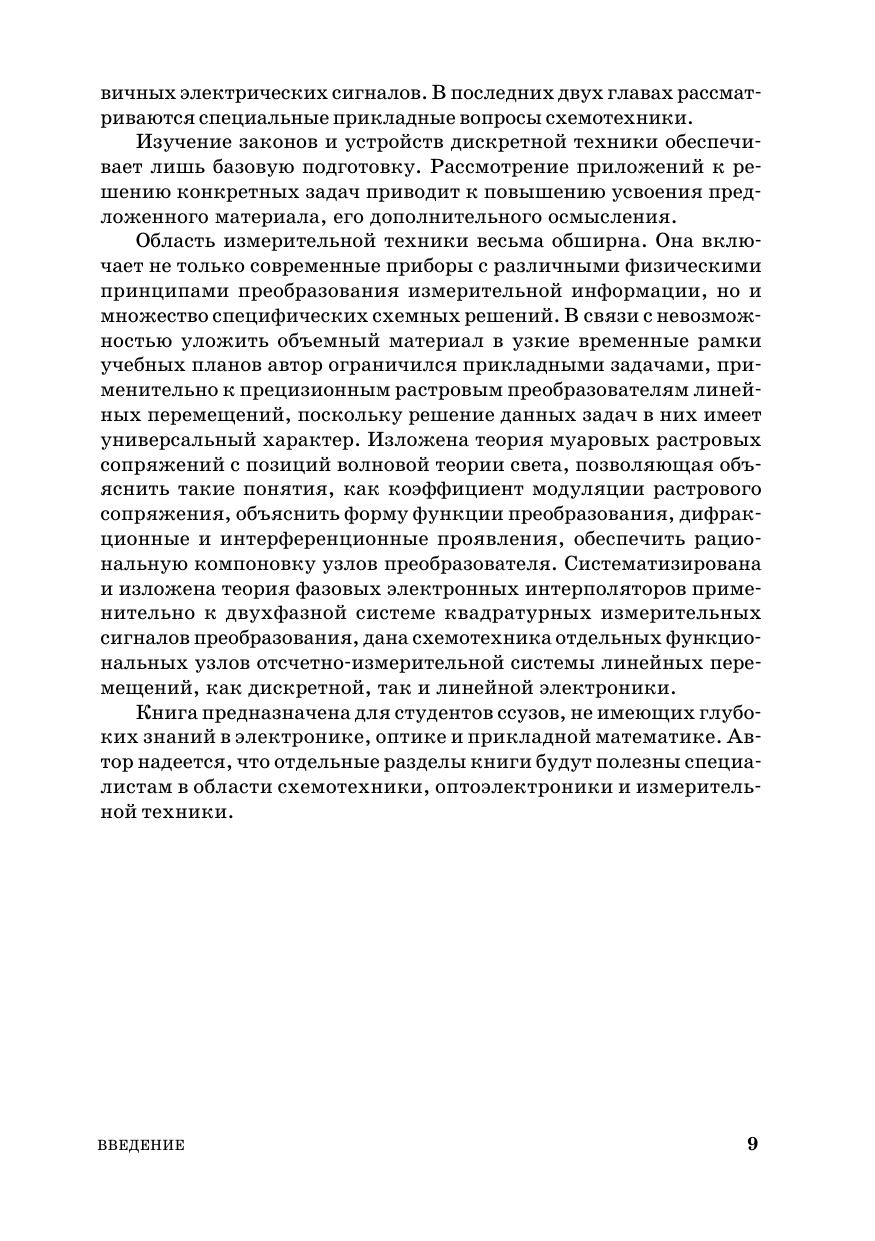 Изложены основы алгебры логики, электронно-компонентная база систем обработки информации, специальные вопросы схемотехники измерительных приборов на примере фотоэлектрических отсчетно-измерительных устройств. Рассмотрены вопросы коррекции системы измерительных сигналов и их аппаратурной реализации, проведен анализ методов и средств структурной компенсации погрешностей измерения, представлена теория электронных фазовых интерполяторов. Показана взаимосвязь механических, оптических и электрических параметров при обработке измерительной информации. Соответствует современным требованиям Федерального государственного образовательного стандарта среднего профессионального образования и профессиональным квалификационным требованиям. Книга предназначена для студентов технических ссузов. Автор надеется, что отдельные разделы книги будут полезны специалистам в области схемотехники, оптоэлектроники и измерительной техники.