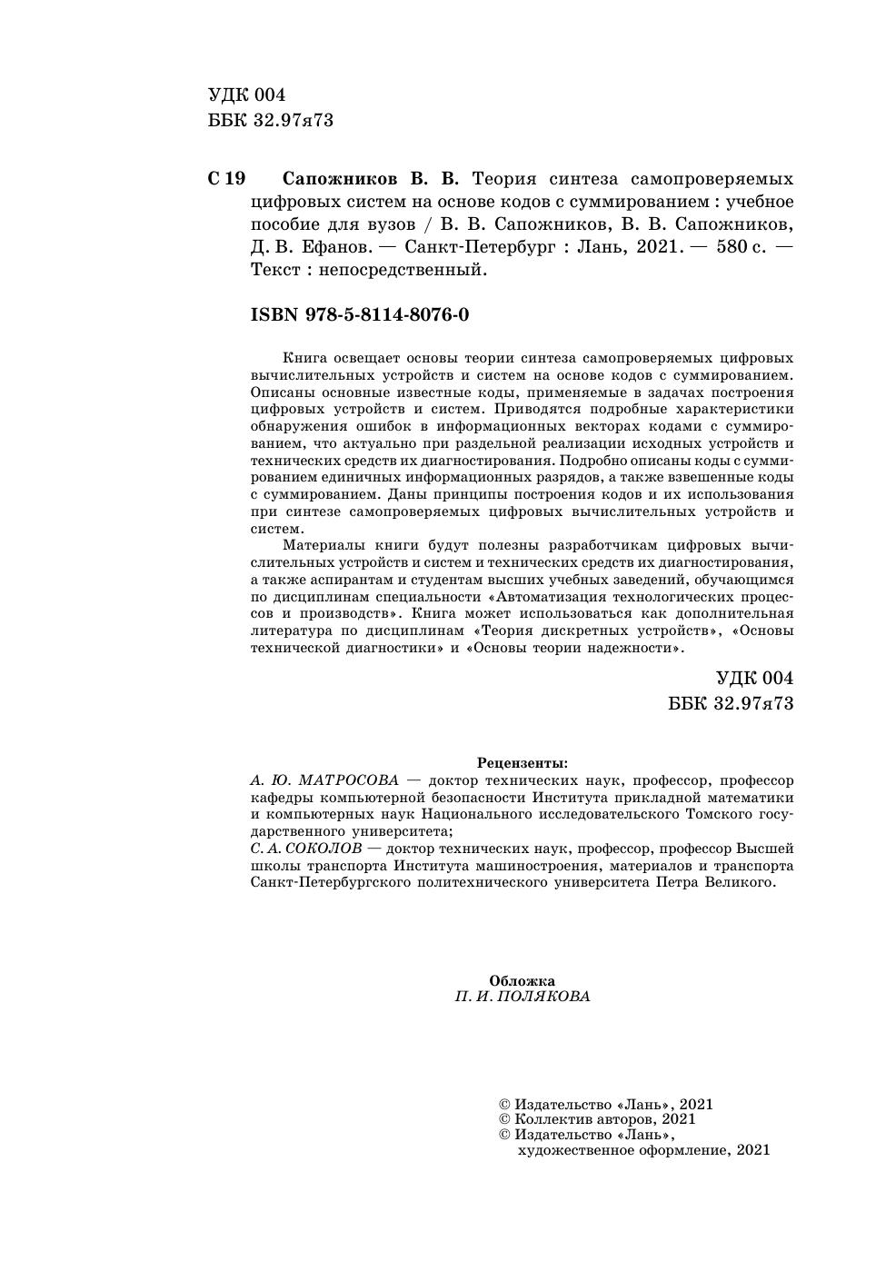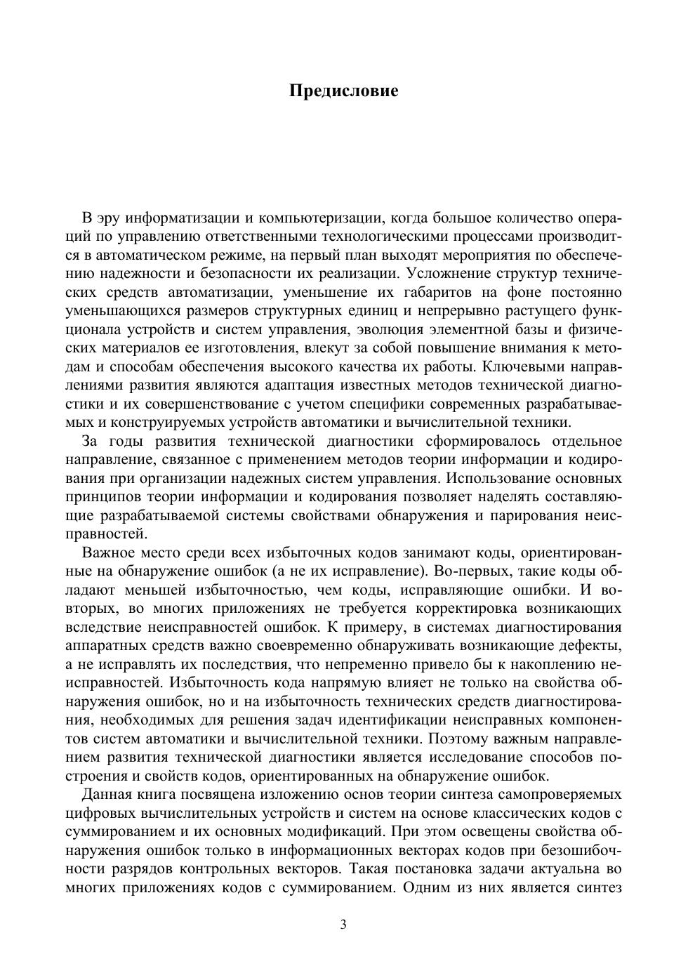 Книга освещает основы теории синтеза самопроверяемых цифровых вычислительных устройств и систем на основе кодов с суммированием. Описаны основные известные коды, применяемые в задачах построения цифровых устройств и систем. Приводятся подробные характеристики обнаружения ошибок в информационных векторах кодами с суммированием, что актуально при раздельной реализации исходных устройств и технических средств их диагностирования. Подробно описаны коды с суммированием единичных информационных разрядов, а также взвешенные коды с суммированием. Даны принципы построения кодов и их использования при синтезе самопроверяемых цифровых вычислительных устройств и систем.