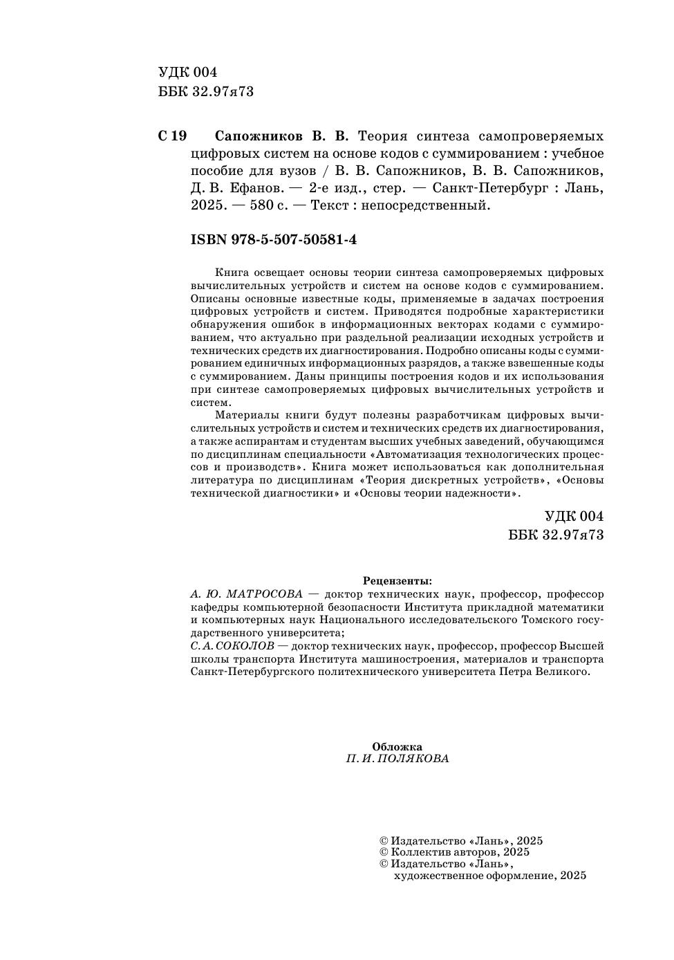 Книга освещает основы теории синтеза самопроверяемых цифровых вычислительных устройств и систем на основе кодов с суммированием. Описаны основные известные коды, применяемые в задачах построения цифровых устройств и систем. Приводятся подробные характеристики обнаружения ошибок в информационных векторах кодами с суммированием, что актуально при раздельной реализации исходных устройств и технических средств их диагностирования. Подробно описаны коды с суммированием единичных информационных разрядов, а также взвешенные коды с суммированием. Даны принципы построения кодов и их использования при синтезе самопроверяемых цифровых вычислительных устройств и систем. Материалы книги будут полезны разработчикам цифровых вычислительных устройств и систем и технических средств их диагностирования, а также аспирантам и студентам высших учебных заведений, обучающимся по дисциплинам специальности «Автоматизация технологических процессов и производств». Книга может использоваться как дополнительная литература по дисциплинам «Теория дискретных устройств», «Основы технической диагностики» и «Основы теории надежности».