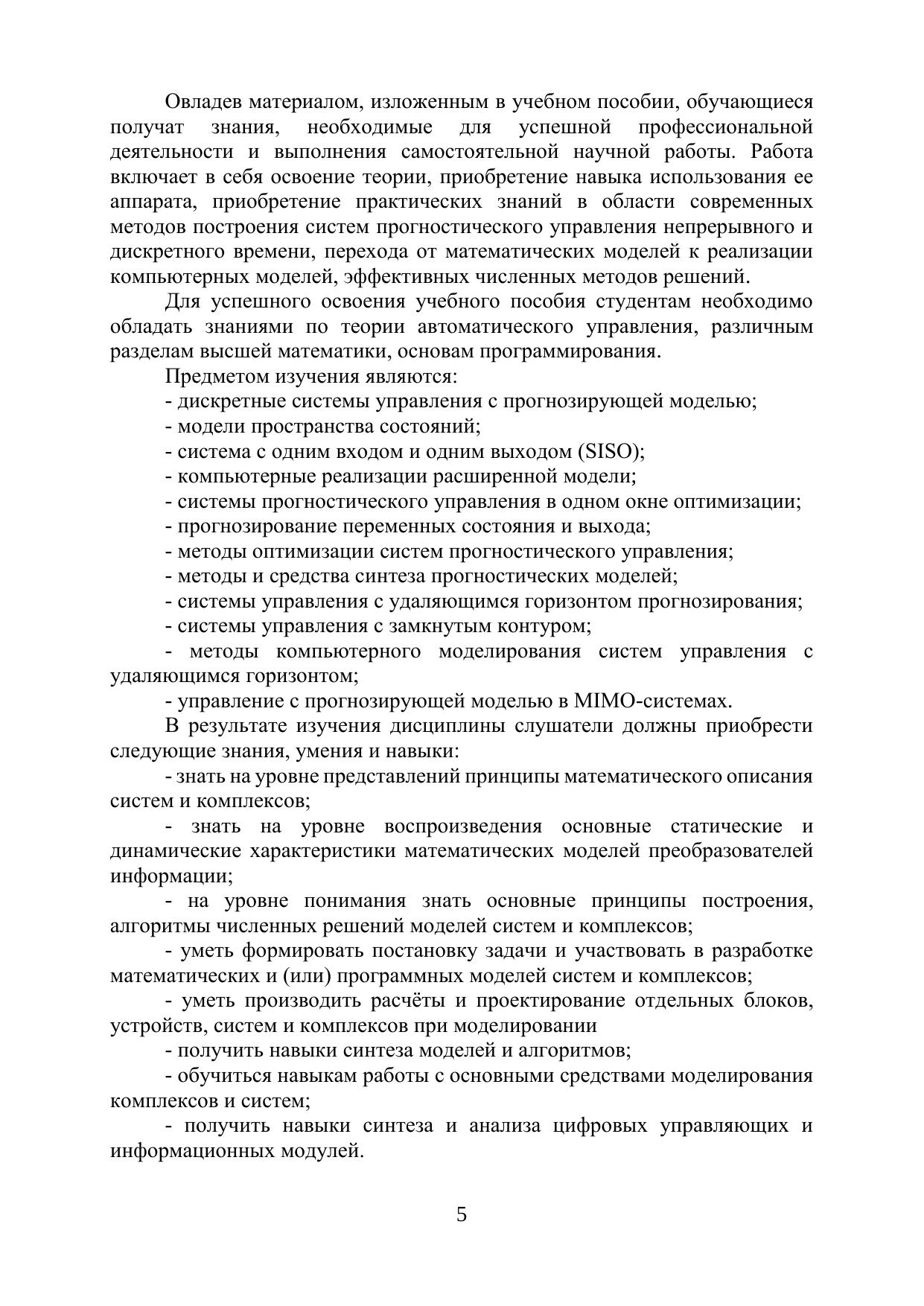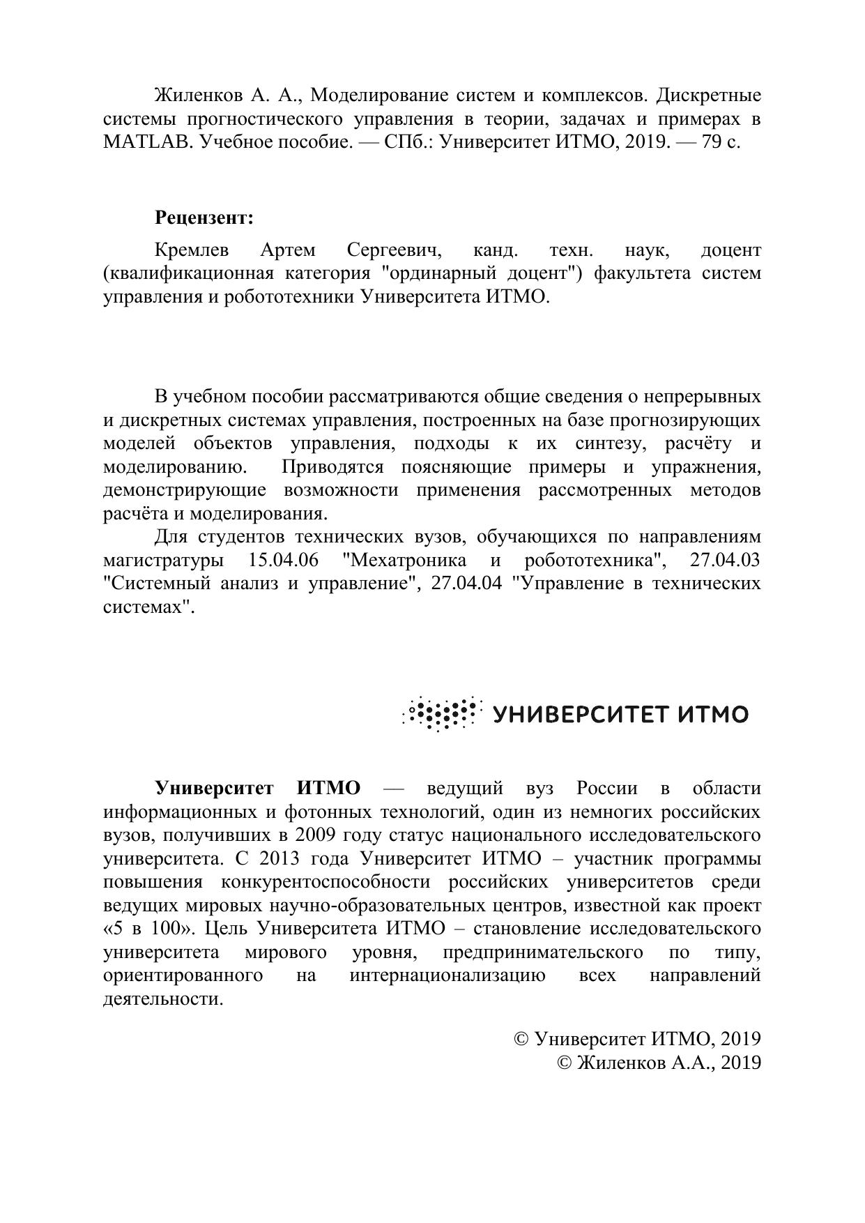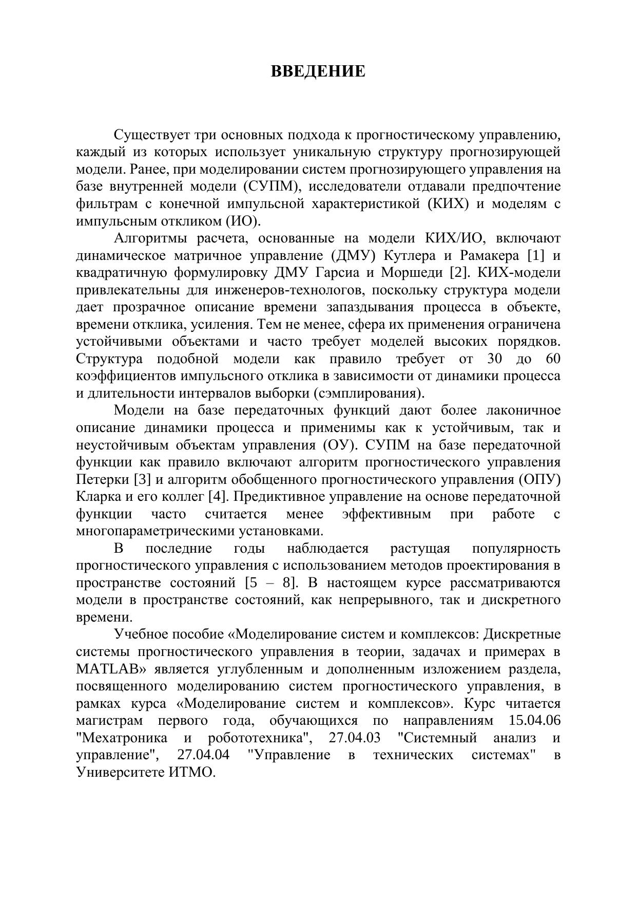 В учебном пособии рассматриваются общие сведения о непрерывных и дискретных системах управления, построенных на базе прогнозирующих моделей объектов управления, подходы к их синтезу, расчёту и моделированию. Приводятся поясняющие примеры и упражнения, демонстрирующие возможности применения рассмотренных методов расчёта и моделирования. Для студентов технических вузов, обучающихся по направлениям магистратуры 15.04.06 "Мехатроника и робототехника", 27.04.03 "Системный анализ и управление", 27.04.04 "Управление в технических системах"