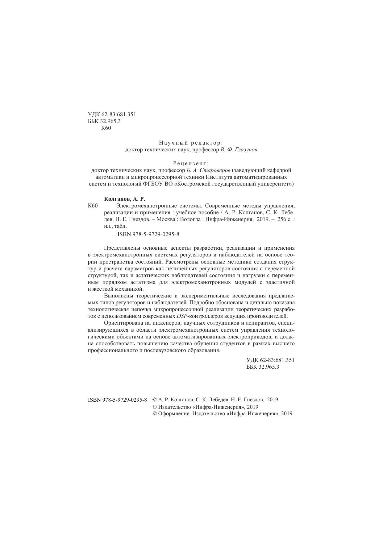 Представлены основные аспекты разработки, реализации и применения в электромеханотронных системах регуляторов и наблюдателей на основе теории пространства состояний. Рассмотрены основные методики создания структур и расчета параметров как нелинейных регуляторов состояния с переменной структурой, так и астатических наблюдателей состояния и нагрузки с переменным порядком астатизма для электромеханотронных модулей с эластичной и жесткой механикой.