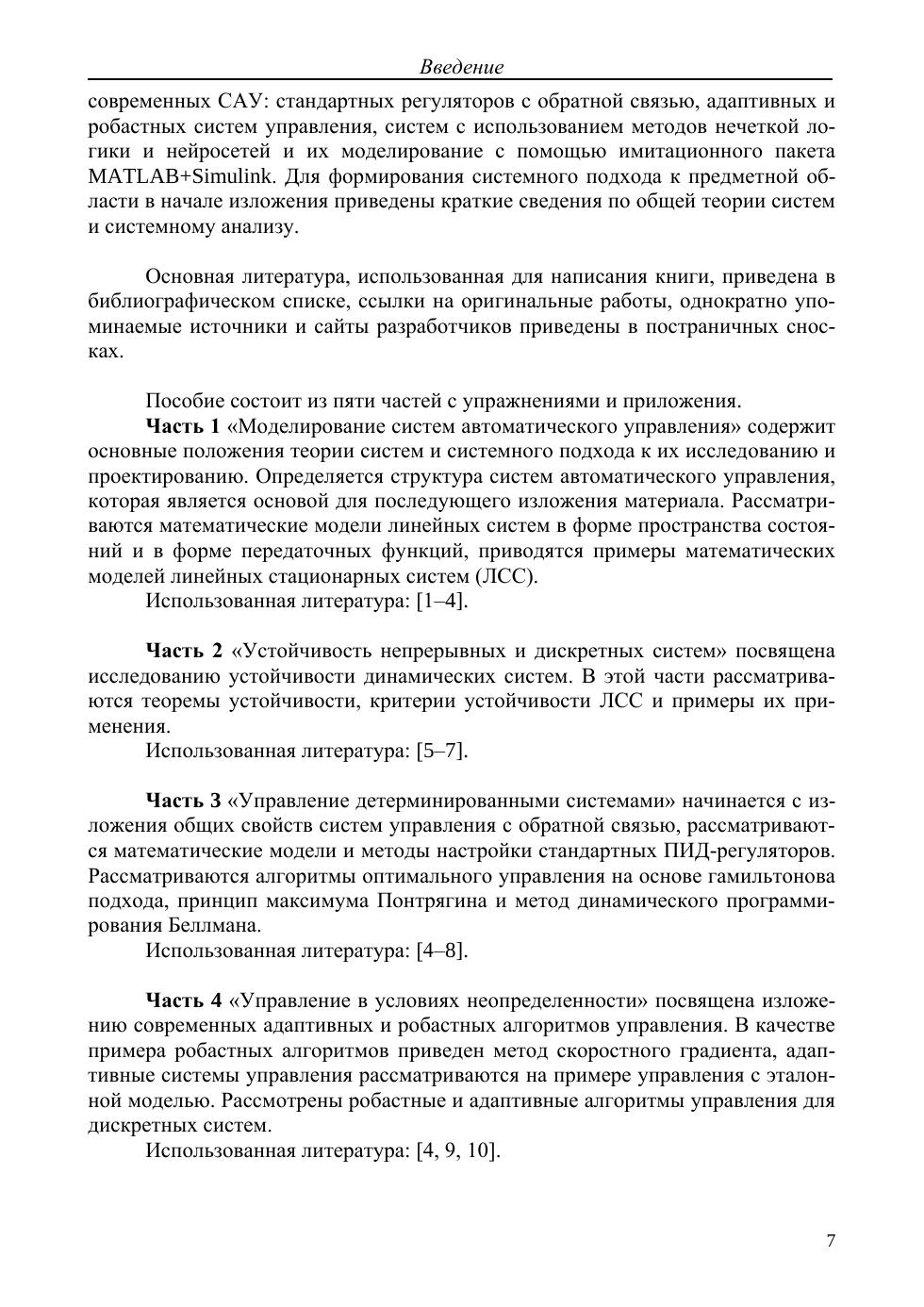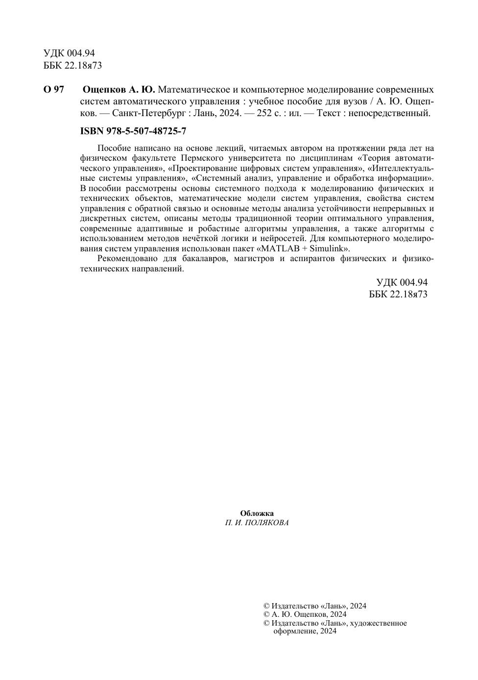 Пособие написано на основе лекций, читаемых автором на протяжении ряда лет на физическом факультете Пермского университета по дисциплинам «Теория автоматического управления», «Проектирование цифровых систем управления», «Интеллектуальные системы управления», «Системный анализ, управление и обработка информации». В пособии рассмотрены основы системного подхода к моделированию физических и технических объектов, математические модели систем управления, свойства систем управления с обратной связью и основные методы анализа устойчивости непрерывных и дискретных систем, описаны методы традиционной теории оптимального управления, современные адаптивные и робастные алгоритмы управления, а также алгоритмы с использованием методов нечёткой логики и нейросетей. Для компьютерного моделирования систем управления использован пакет «MATLAB + Simulink». Рекомендовано для бакалавров, магистров и аспирантов физических и физико-технических направлений.
