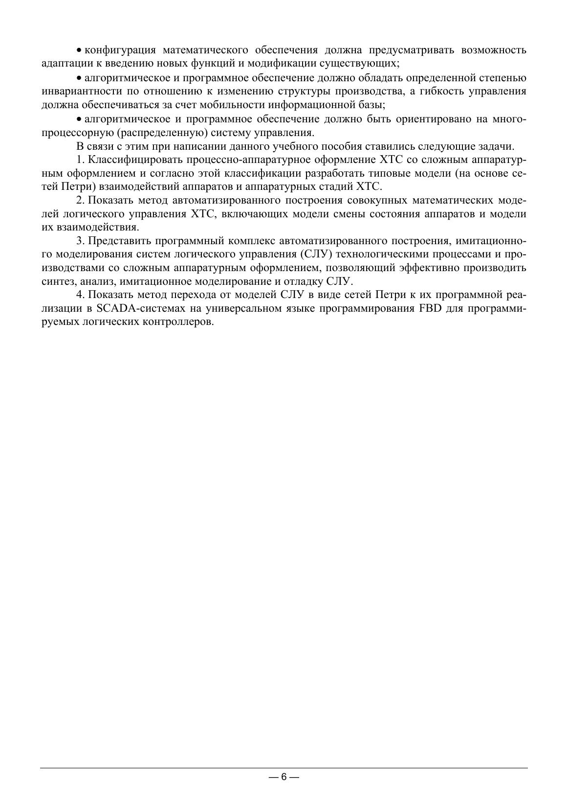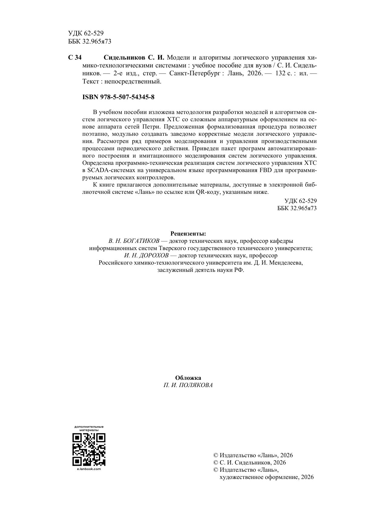 В учебном пособии изложена методология разработки моделей и алгоритмов систем логического управления ХТС со сложным аппаратурным оформлением на основе аппарата сетей Петри. Предложенная формализованная процедура позволяет поэтапно, модульно создавать заведомо корректные модели логического управления. Рассмотрен ряд примеров моделирования и управления производственными процессами периодического действия. Приведен пакет программ автоматизированного построения и имитационного моделирования систем логического управления. Определена программно-техническая реализация систем логического управления ХТС в SCADA-системах на универсальном языке программирования FBD для программируемых логических контроллеров. К книге прилагаются дополнительные материалы, доступные в электронной библиотечной системе «Лань» по ссылке или QR-коду, указанным ниже.