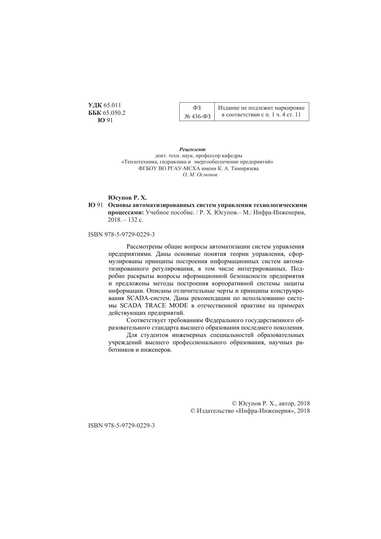 Рассмотрены общие вопросы автоматизации систем управления предприятиями. Даны основные понятия теории управления, сформулированы принципы построения информационных систем автоматизированного регулирования, в том числе интегрированных. Подробно раскрыты вопросы нформационной безопасности предприятия и предложены методы построения корпоративной системы защиты информации. Описаны отличительные черты и принципы конструирования SCADA-систем. Даны рекомендации по использованию системы SCADA TRACE MODE в отечественной практике на примерах действующих предприятий.