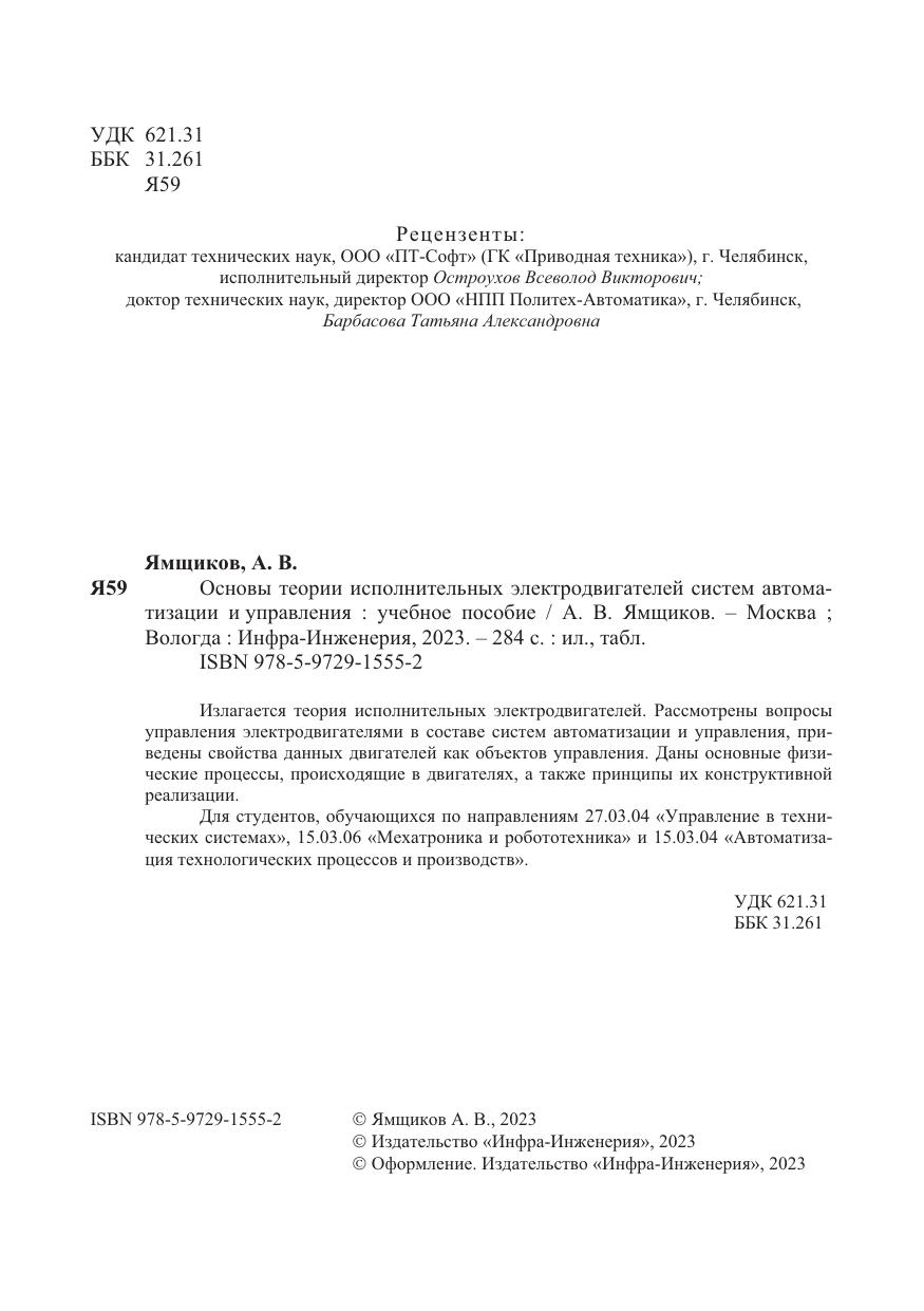 Излагается теория исполнительных электродвигателей. Рассмотрены вопросы управления электродвигателями в составе систем автоматизации и управления, приведены свойства данных двигателей как объектов управления. Даны основные физические процессы, происходящие в двигателях, а также принципы их конструктивной реализации.