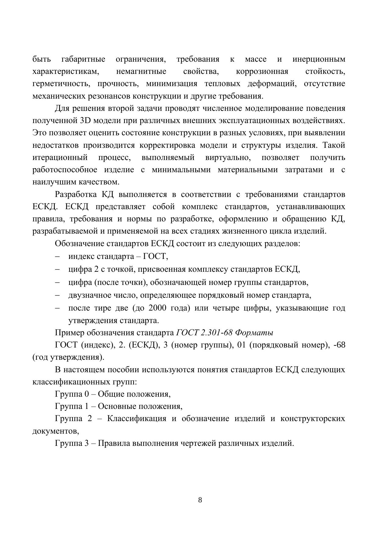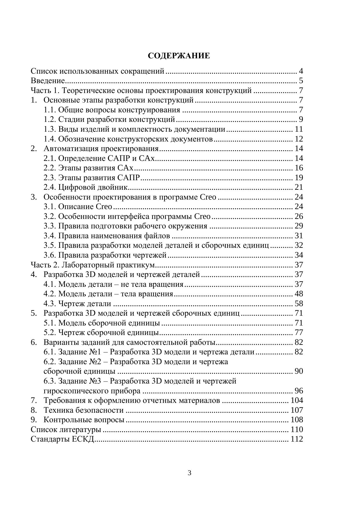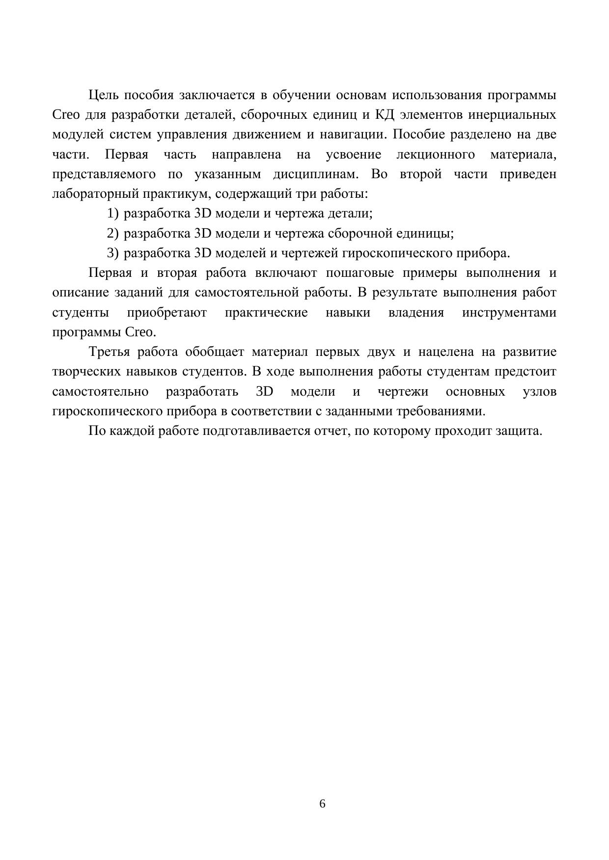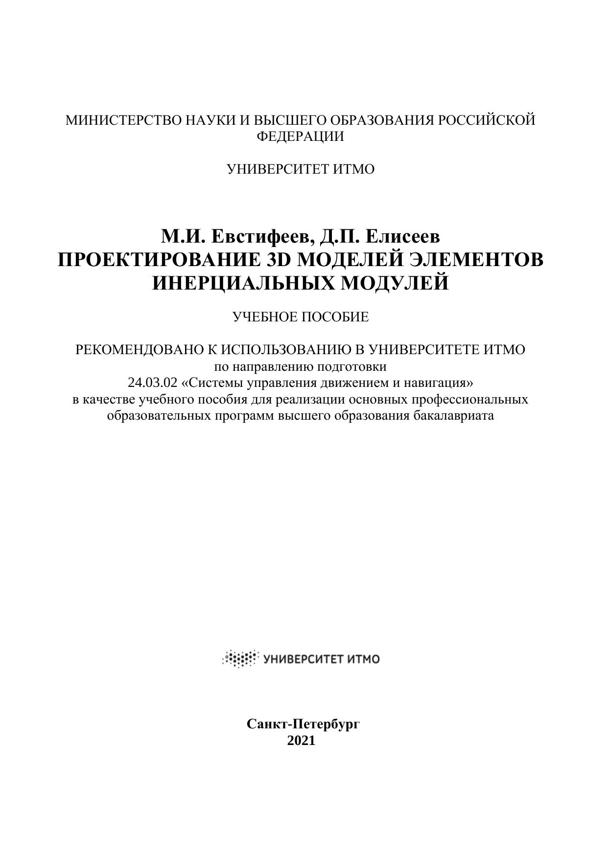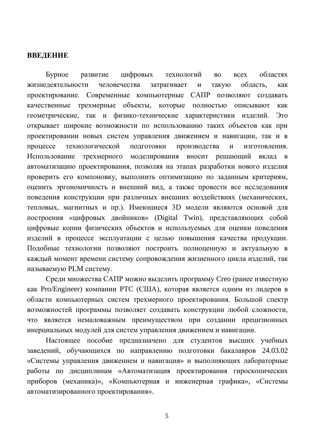 Пособие разделено на две части. В первой части рассматриваются теоретические основы проектирования инерциальных модулей систем управления движением и навигации, стадии их разработки, даются базовые понятия о комплектности конструкторской документации, этапах разработки документации. Представлены общие сведения о системах автоматизации проектирования и приводятся их направления дальнейшего развития, включая цифровые двойники. Рассматриваются особенности и правила проектирования 3D моделей в программе Creo. Во второй части представлен лабораторный практикум, состоящий из трех работ. Первая работа посвящена созданию трехмерной модели и чертежа детали, вторая – созданию модели и чертежа сборочной единицы, третья – разработке модели и чертежей инерциального модуля. Пособие предназначено для студентов высших учебных заведений, обучающихся по направлению подготовки бакалавров – 24.03.02 «Системы управления движением и навигация» и выполняющих лабораторные работы по дисциплинам «Автоматизация проектирования гироскопических приборов (механика)», «Компьютерная и инженерная графика», «Системы автоматизированного проектирования».