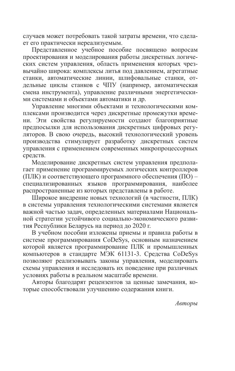 Приводятся сведения о порядке разработки систем автоматизации и управления технологическими комплексами применительно к объектам промышленного назначения. Рассматривается реализация проектов систем управления технологических комплексов на основе ПЛК. Описаны языки программирования ПЛК: РКС, LAD, FBD, STL, SCL, Grafcet, SFC, CFC. Представлены промышленные компьютерные сети, объединяющие ПЛК, интеллектуальные датчики и исполнительные устройства, а также реализация управления в реальном времени. Изложены приемы и правила работы в системе программирования CoDeSys. Для студентов учреждений высшего образования по специальности «Автоматизация технологических процессов и производств». Будет полезно специалистам, занимающимся разработкой дискретных систем управления технологических комплексов.