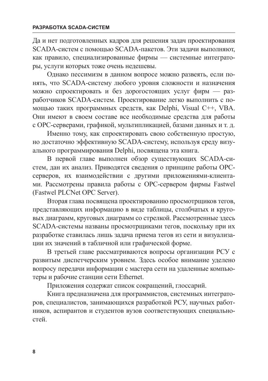 Даны рекомендации по проектированию SCADA-системы с использованием среды визуального программирования Delphi. Приведен обзор существующих SCADA-систем с анализом принципов их работы. Рассмотрены возможности SCADA-системы как инструмента для просмотра тегов. Освещены вопросы организации распределенных систем управления с развитым диспетчерским уровнем.
