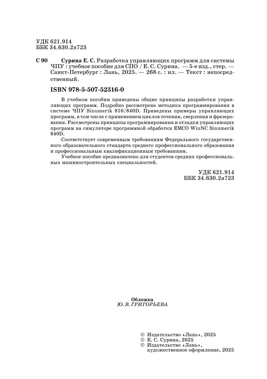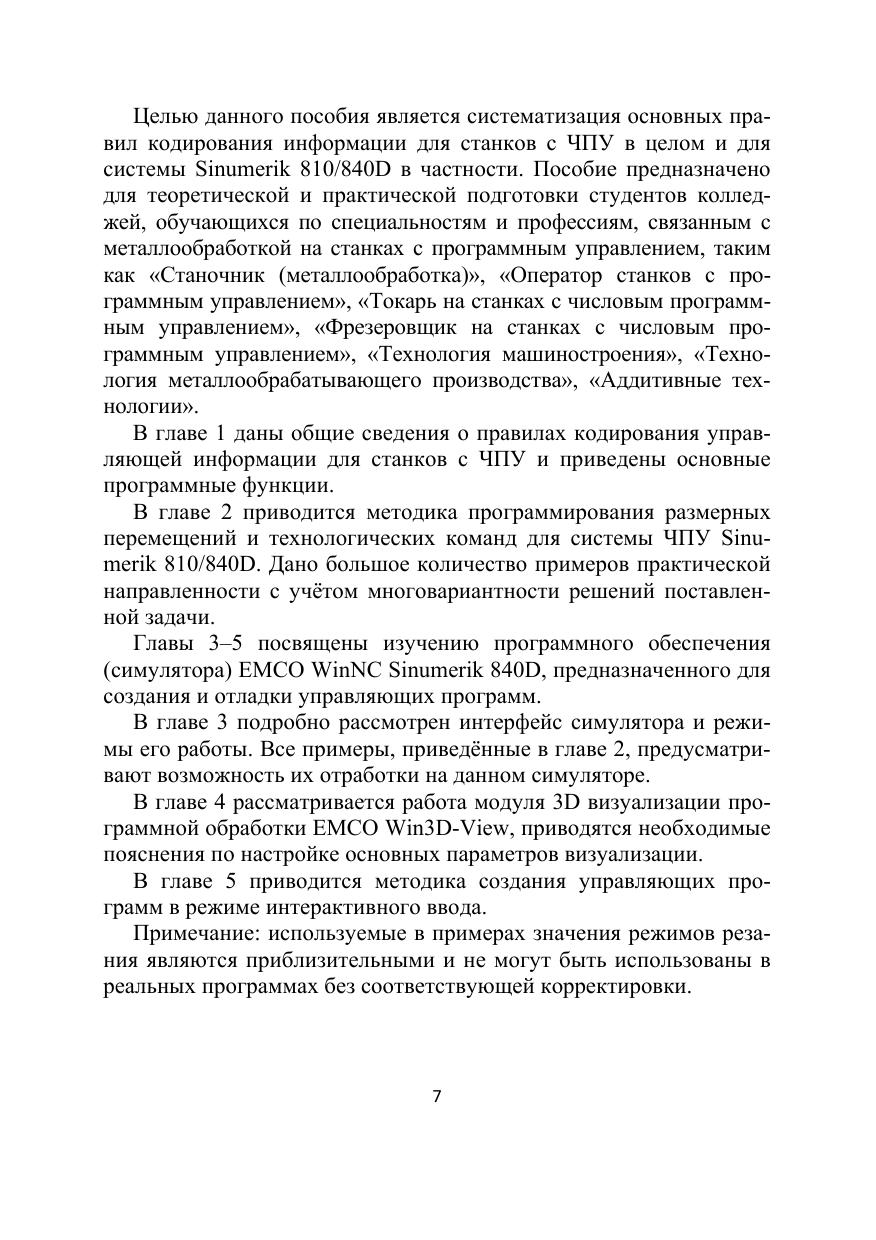 В учебном пособии приведены общие принципы разработки управляющих программ. Подробно рассмотрена методика программирования в системе ЧПУ Sinumerik 810/840D. Приведены примеры управляющих программ, в том числе с применением циклов точения, сверления и фрезерования. Рассмотрены принципы программирования и отладки управляющих программ на симуляторе программной обработки EMCO WinNC Sinumerik 840D. Соответствует современным требованиям Федерального государственного образовательного стандарта среднего профессионального образования и профессиональным квалификационным требованиям. Учебное пособие предназначено для студентов средних профессиональных машиностроительных специальностей.