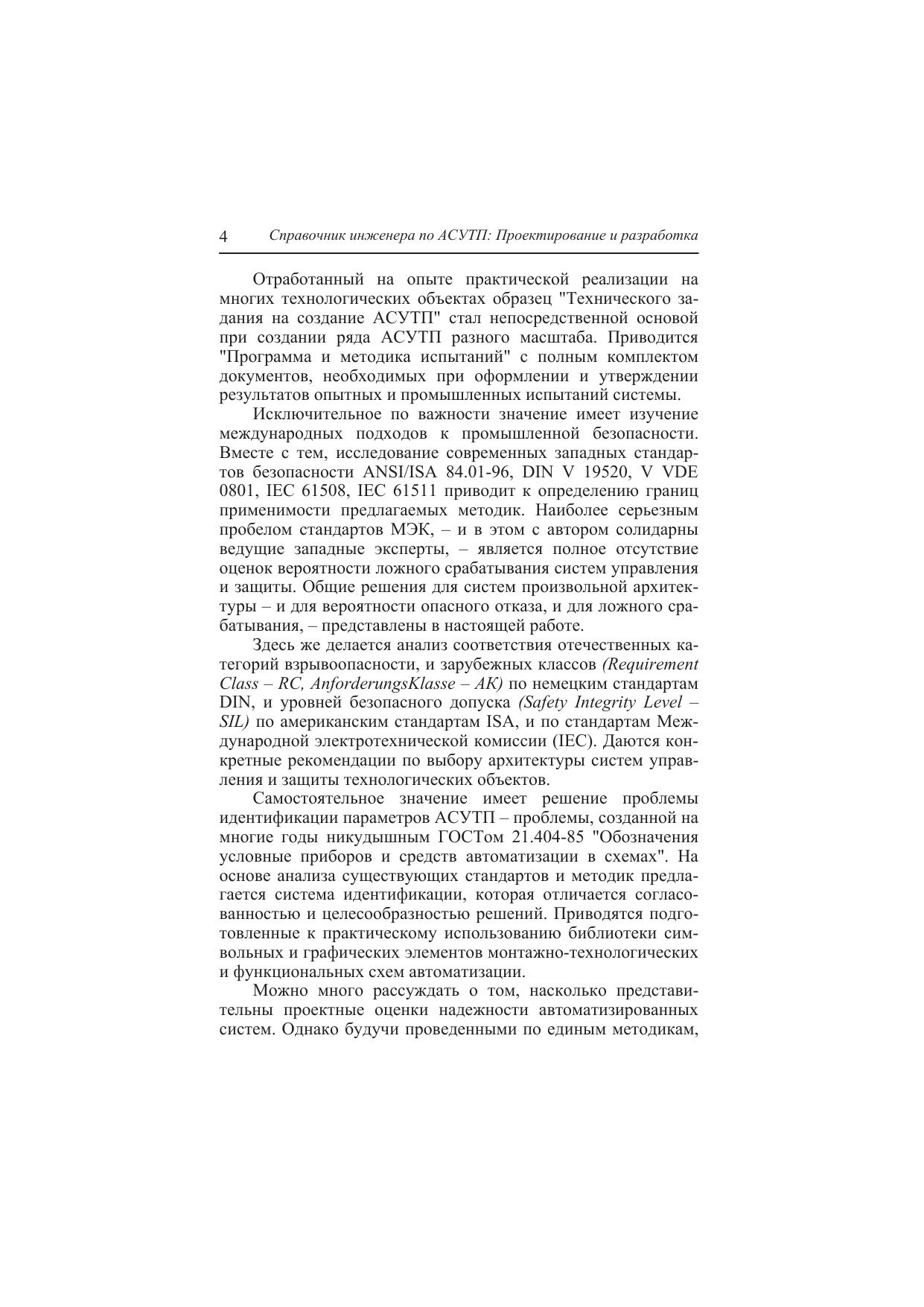 Справочник задает систему базовых определений и требований, выполнение которых реализуется в правилах создания АСУТП. Даются рекомендации по выбору архитектуры автоматизированных систем управления и защиты технологических процессов. Последовательно определяется состав и распределение работ по созданию АСУТП, устанавливается состав и содержание проектной документации.