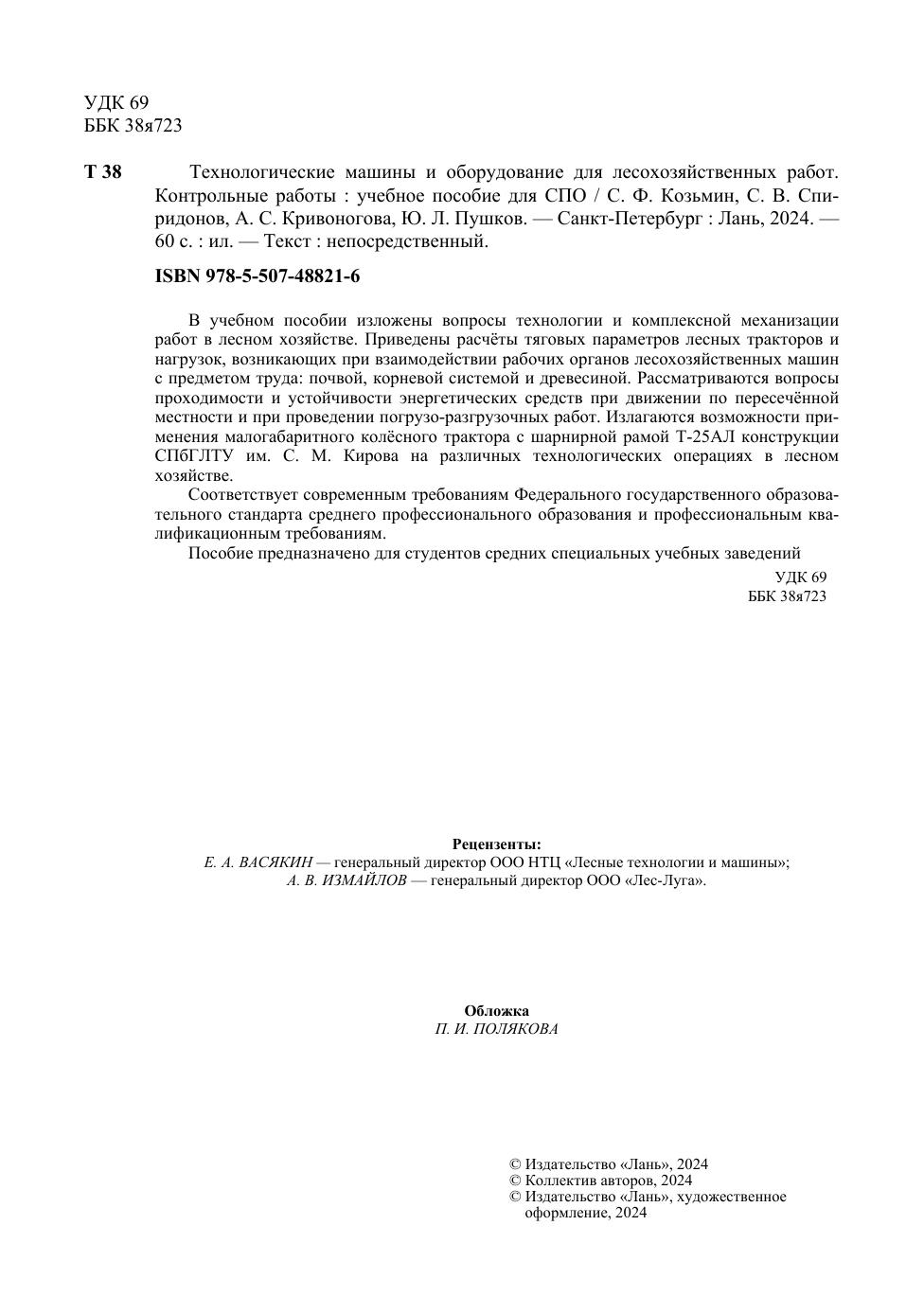 В учебном пособии изложены вопросы технологии и комплексной механизации работ в лесном хозяйстве. Приведены расчёты тяговых параметров лесных тракторов и нагрузок, возникающих при взаимодействии рабочих органов лесохозяйственных машин с предметом труда: почвой, корневой системой и древесиной. Рассматриваются вопросы проходимости и устойчивости энергетических средств при движении по пересечённой местности и при проведении погрузо-разгрузочных работ. Излагаются возможности применения малогабаритного колёсного трактора с шарнирной рамой Т-25АЛ конструкции СПбГЛТУ им. С. М. Кирова на различных технологических операциях в лесном хозяйстве. Соответствует современным требованиям Федерального государственного образовательного стандарта среднего профессионального образования и профессиональным квалификационным требованиям. Пособие предназначено для студентов средних специальных учебных заведений
