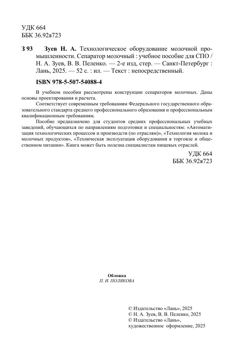 В учебном пособии рассмотрены конструкции сепараторов молочных. Даны основы проектирования и расчета. Соответствует современным требованиям Федерального государственного образовательного стандарта среднего профессионального образования и профессиональным квалификационным требованиям. Пособие предназначено для студентов средних профессиональных учебных заведений, обучающихся по направлениям подготовки и специальностям: «Автоматизация технологических процессов и производств (по отраслям)», «Технология молока и молочных продуктов», «Техническая эксплуатация оборудования в торговле и общественном питании». Книга может быть полезна специалистам пищевых отраслей.