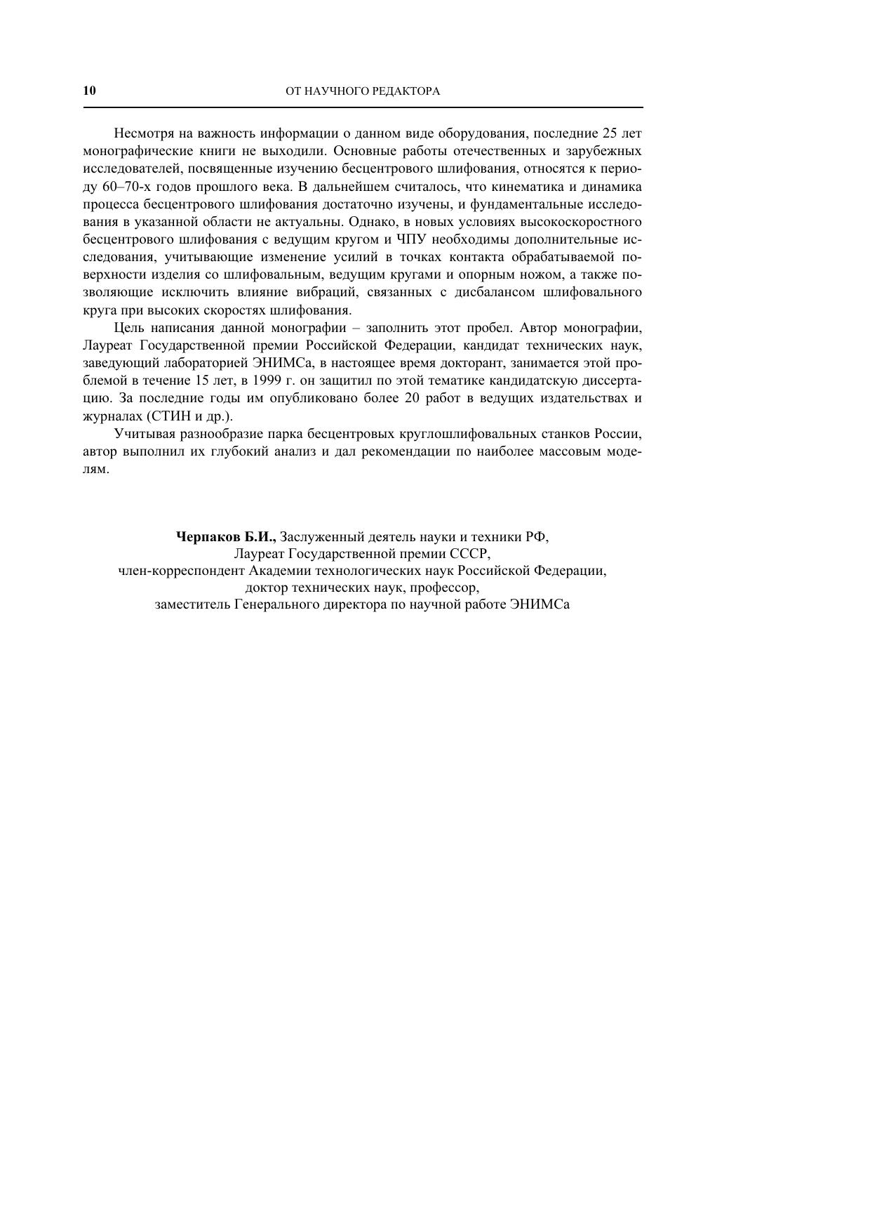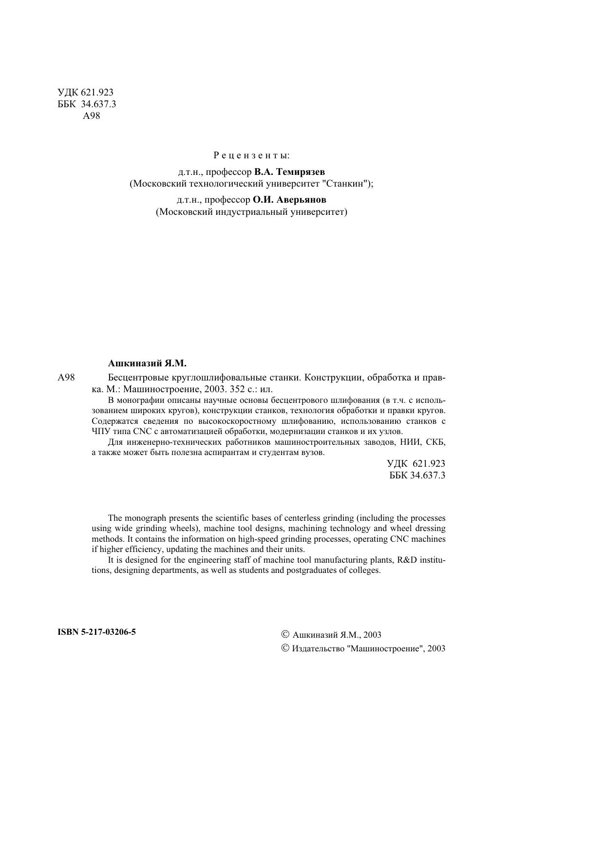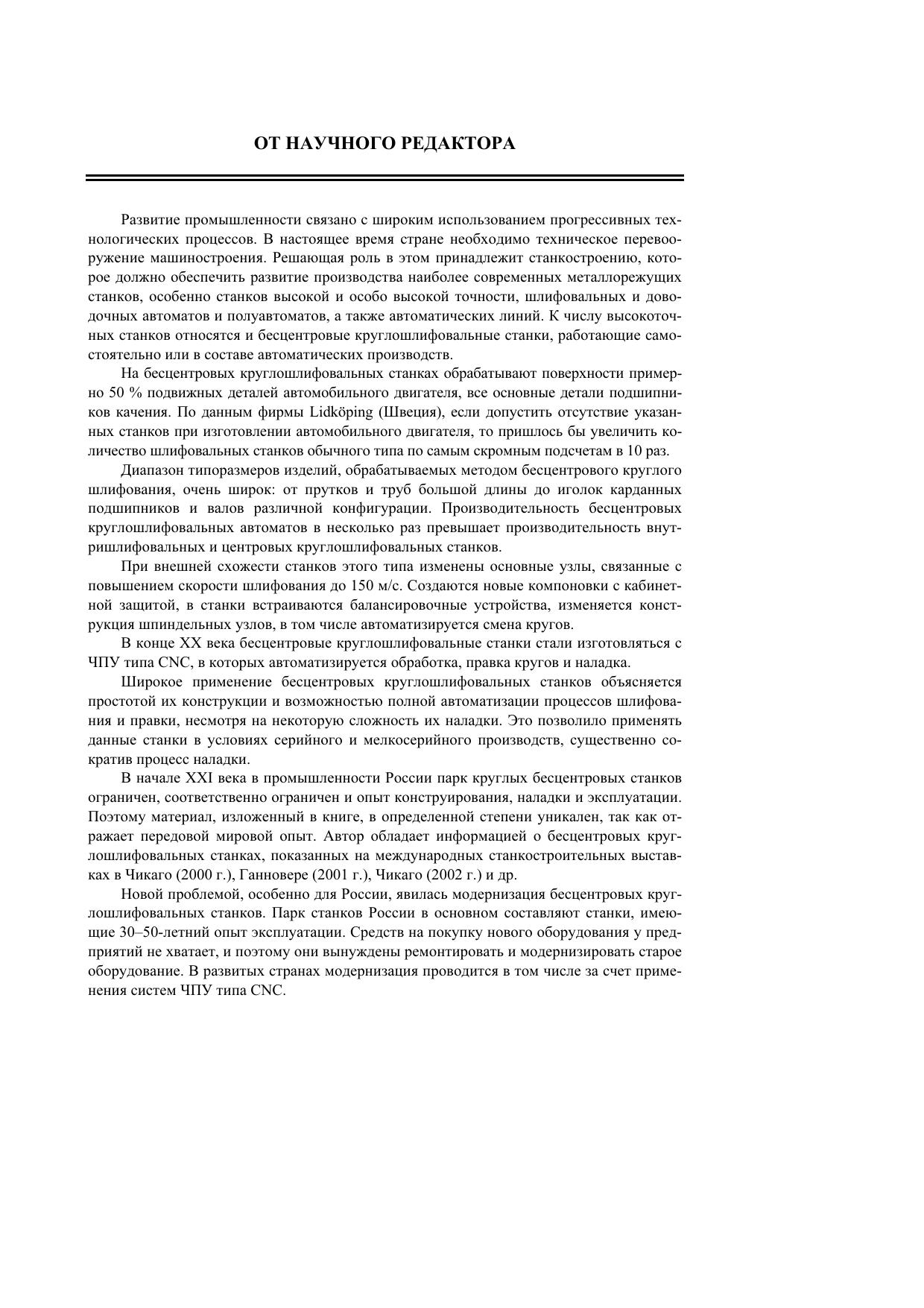 В монографии описаны научные основы бесцентрового шлифования (в т.ч. с использованием широких кругов), конструкции станков, технология обработки и правки кругов. Содержатся сведения по высокоскоростному шлифованию, использованию станков с ЧПУ типа CNC с автоматизацией обработки, модернизации станков и их узлов. Для инженерно-технических работников машиностроительных заводов, НИИ, СКБ, а также может быть полезна аспирантам и студентам вузов.
