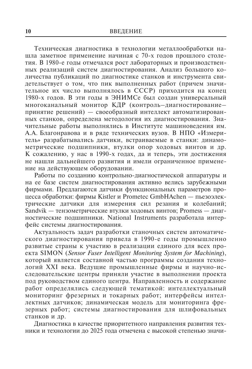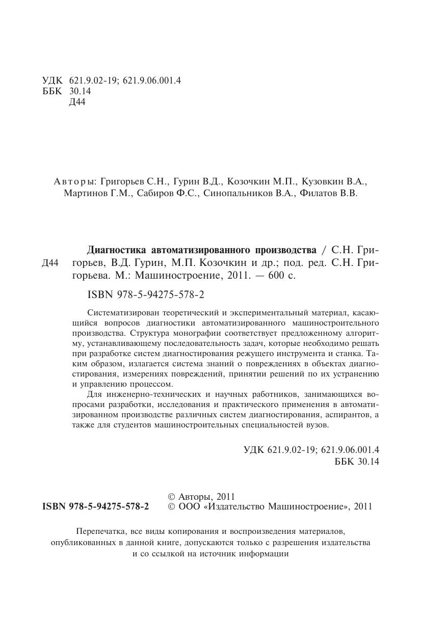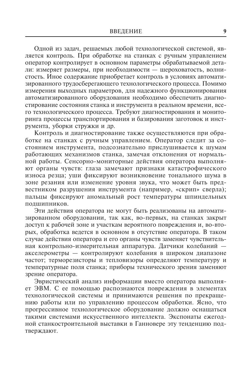 Систематизирован теоретический и экспериментальный материал, касающийся вопросов диагностики автоматизированного машиностроительного производства. Структура монографии соответствует предложенному алгоритму, устанавливающему последовательность задач, которые необходимо решать при разработке систем диагностирования режущего инструмента и станка. Таким образом, излагается система знаний о повреждениях в объектах диагностирования, измерениях повреждений, принятии решений по их устранению и управлению процессом. Для инженерно-технических и научных работников, занимающихся вопросами разработки, исследования и практического применения в автоматизированном производстве различных систем диагностирования, аспирантов, а также для студентов машиностроительных специальностей вузов.