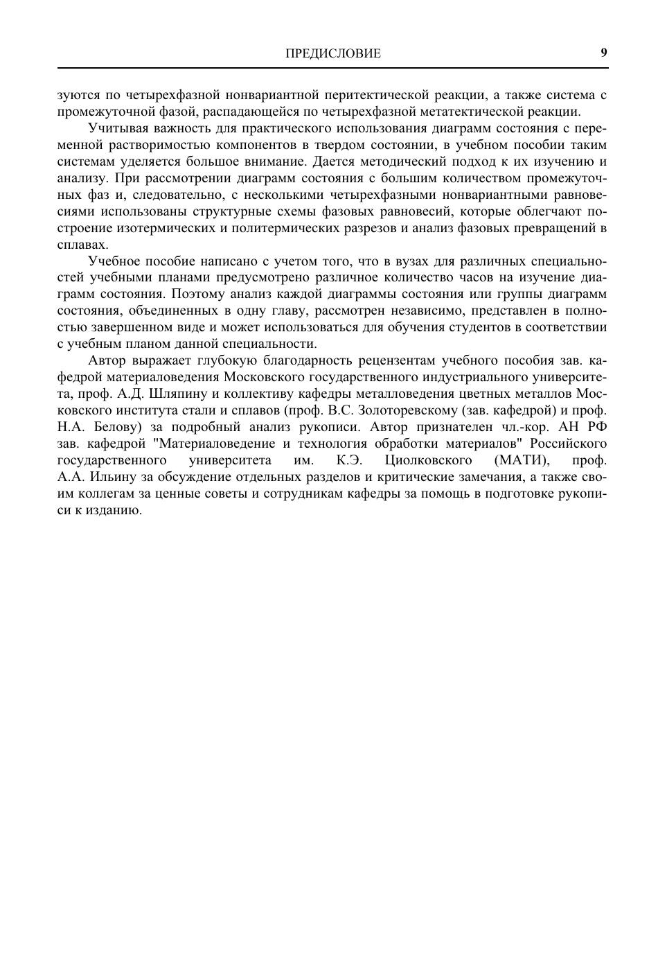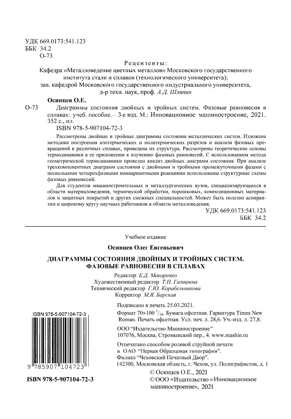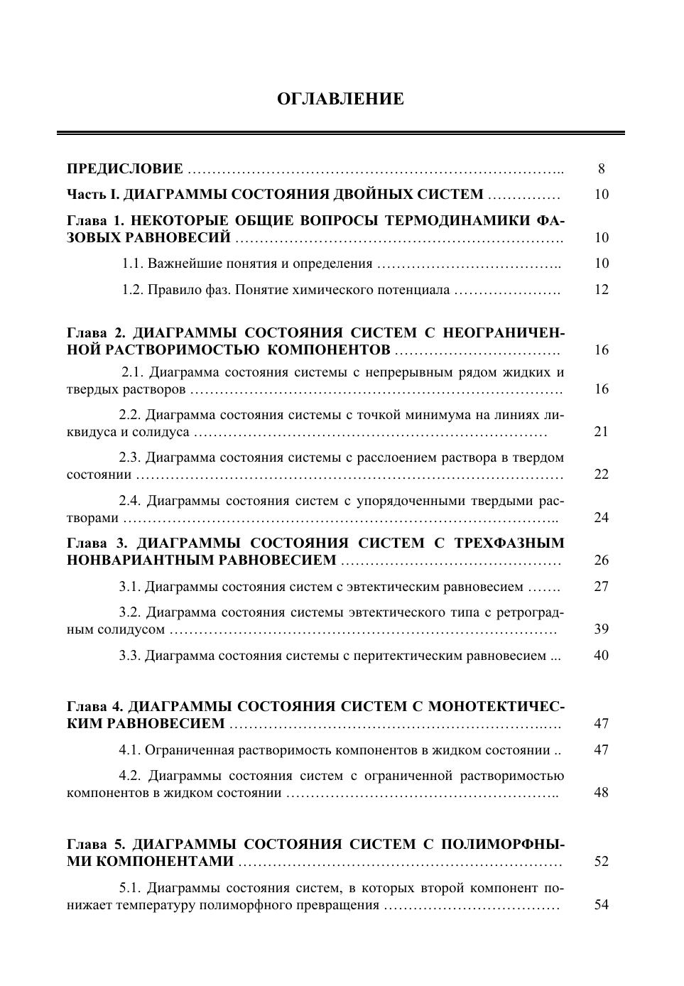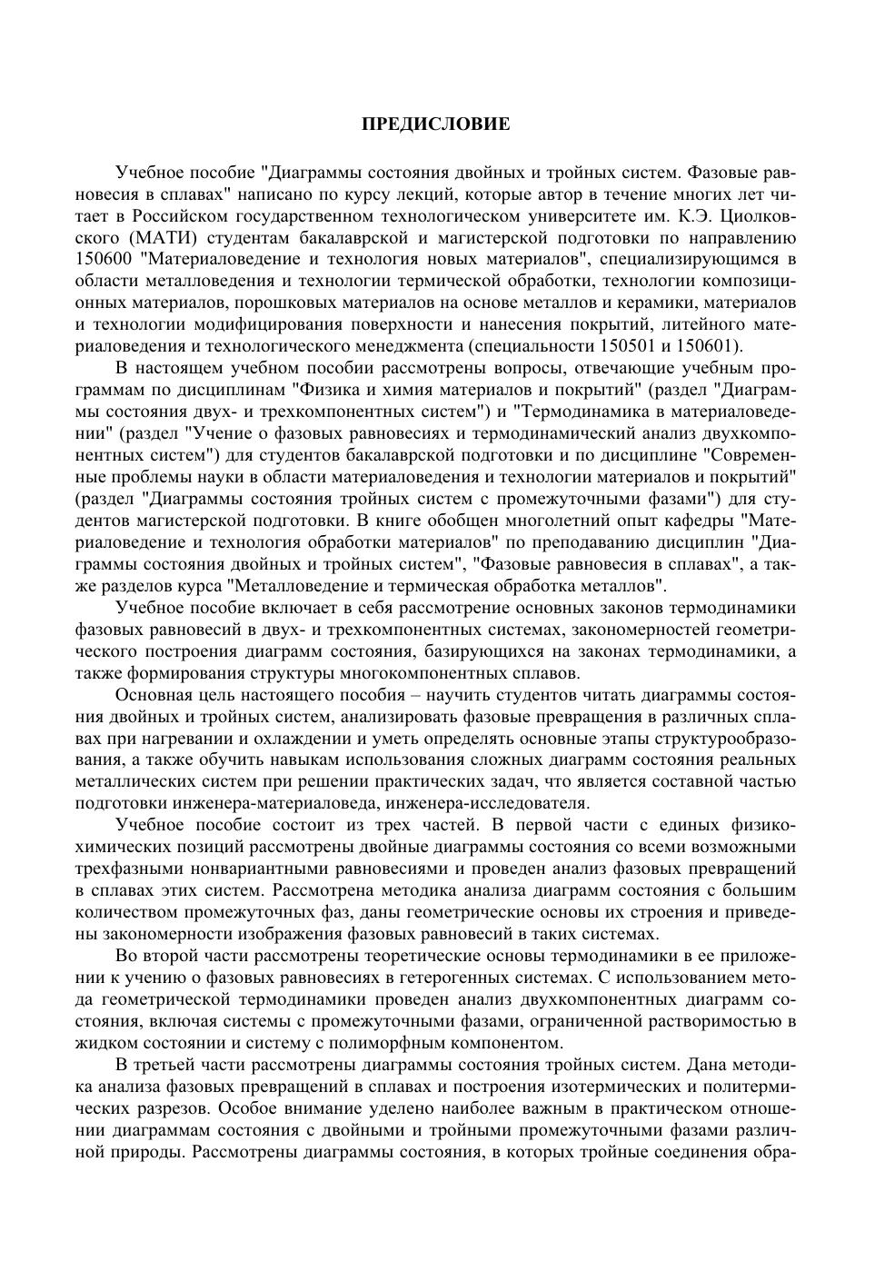 Рассмотрены двойные и тройные диаграммы состояния металлических систем. Изложена методика построения изотермических и политермических разрезов и анализа фазовых превращений в различных сплавах, приведена структура. Рассмотрены теоретические основы термодинамики в ее приложении к изучению фазовых равновесий. С использованием метода геометрической термодинамики проведен анализ двойных диаграмм состояния. При анализе трехкомпонентных диаграмм состояния с двойными и тройными промежуточными фазами с несколькими четырехфазными ионвариантными реакциями использованы структурные схемы фазовых равновесий.