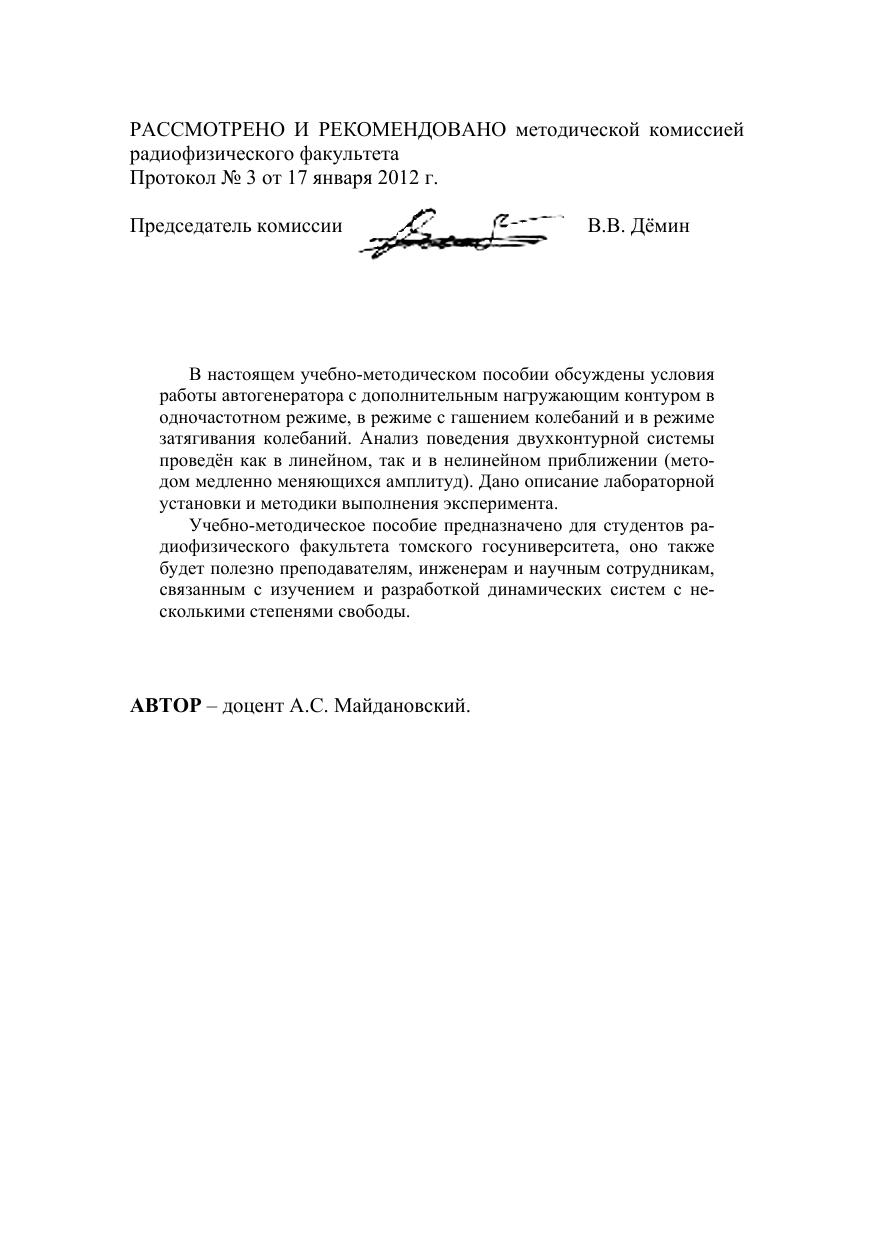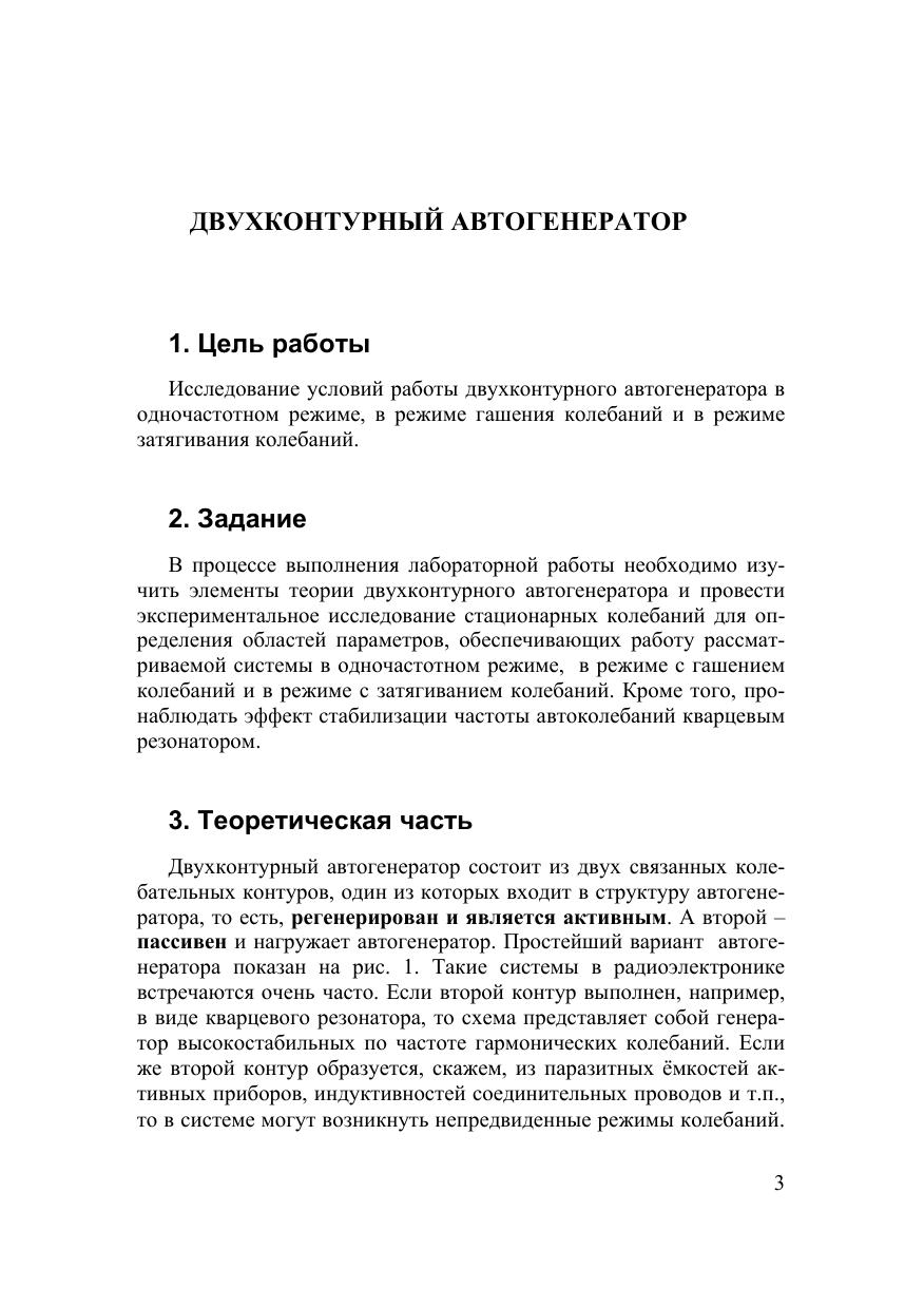 В настоящем учебно-методическом пособии обсуждены условия работы автогенератора с дополнительным нагружающим контуром в одночастотном режиме, в режиме с гашением колебаний и в режиме затягивания колебаний. Анализ поведения двухконтурной системы проведён как в линейном, так и в нелинейном приближении (методом медленно меняющихся амплитуд). Дано описание лабораторной установки и методики выполнения эксперимента. Учебно-методическое пособие предназначено для студентов радиофизического факультета томского госуниверситета, оно также будет полезно преподавателям, инженерам и научным сотрудникам, связанным с изучением и разработкой динамических систем с несколькими степенями свободы