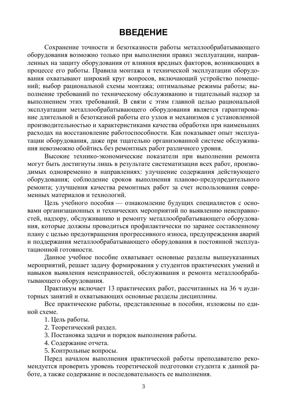 В учебном пособии приведено содержание практических работ, в которых нашли отражение вопросы практической реализации, в условиях машиностроительного предприятия, организационных, технических и технологических мероприятий по выявлению неисправностей эксплуатируемого металлообрабатывающего оборудования, его обслуживанию, эксплуатации и ремонту. Представленные в учебном пособии материалы позволяют овладеть методиками определения типовых неисправностей металлообрабатывающего оборудования, разработки структур ремонтного цикла, графиков планово-предупредительных ремонтов, структур цикла технического обслуживания и карт технического обслуживания металлообрабатывающего оборудования, назначения характеристик фундамента металлообрабатывающего оборудования и выбора устройств его виброизоляции, выбора способов дефектовки и методов ремонта деталей, разработки схем контроля геометрической точности металлообрабатывающего оборудования и технологической оснастки. Соответствует современным требованиям Федерального государственного образовательного стандарта среднего профессионального образования и профессиональным квалификационным требованиям. Учебное пособие предназначено для студентов учреждений среднего профессионального образования, обучающихся по направлению «Машиностроение». Может использоваться для самостоятельной работы студентов, при выполнении курсовых и выпускных квалификационных работ.