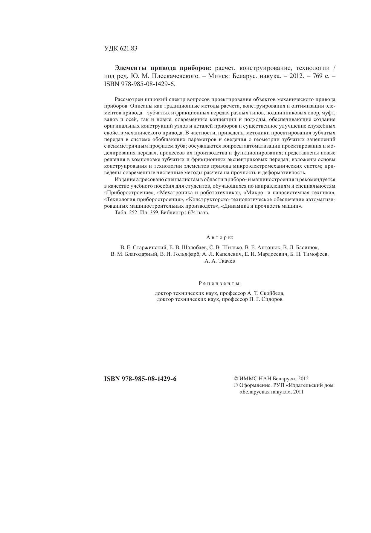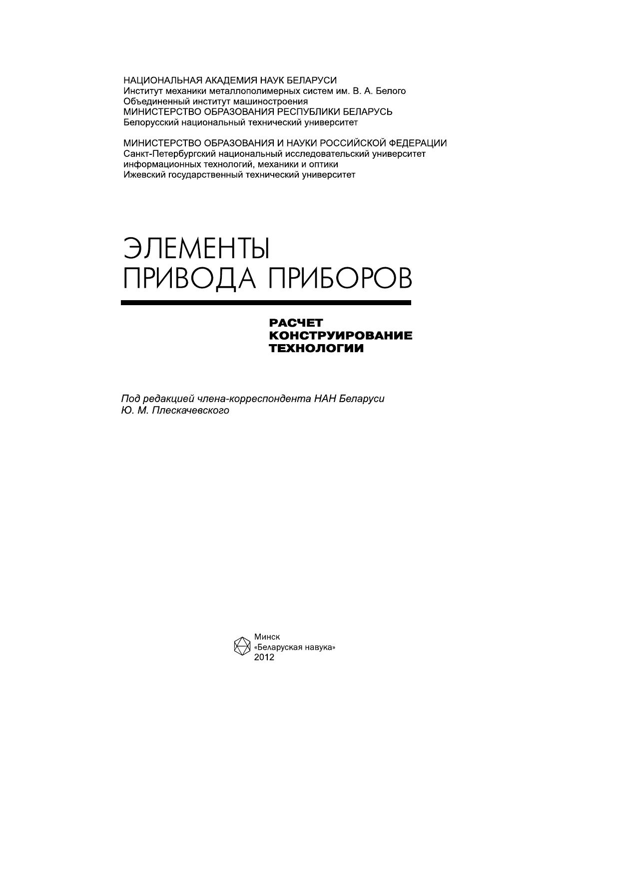 Рассмотрен широкий спектр вопросов проектирования объектов механического привода приборов. Описаны как традиционные методы расчета, конструирования и оптимизации элементов привода – зубчатых и фрикционных передач разных типов, подшипниковых опор, муфт, валов и осей, так и новые, современные концепции и подходы, обеспечивающие создание оригинальных конструкций узлов и деталей приборов и существенное улучшение служебных свойств механического привода. В частности, приведены методики проектирования зубчатых передач в системе обобщающих параметров и сведения о геометрии зубчатых зацеплений с асимметричным профилем зуба, обсуждаются вопросы автоматизации проектирования и моделирования передач, процессов их производства и функционирования, представлены новые решения в компоновке зубчатых и фрикционных эксцентриковых передач, изложены основы конструирования и технологии элементов привода микроэлектромеханических систем, приведены современные численные методы расчета на прочность и деформативность. Издание адресовано специалистам в области приборо- и машиностроения и рекомендуется в качестве учебного пособия для студентов, обучающихся по направлениям и специальностям «Приборостроение», «Мехатроника и робототехника», «Микро- и наносистемная техника», «Технология приборостроения», «Конструкторско-технологическое обеспечение автоматизированных машиностроительных производств», «Динамика и прочность машин».