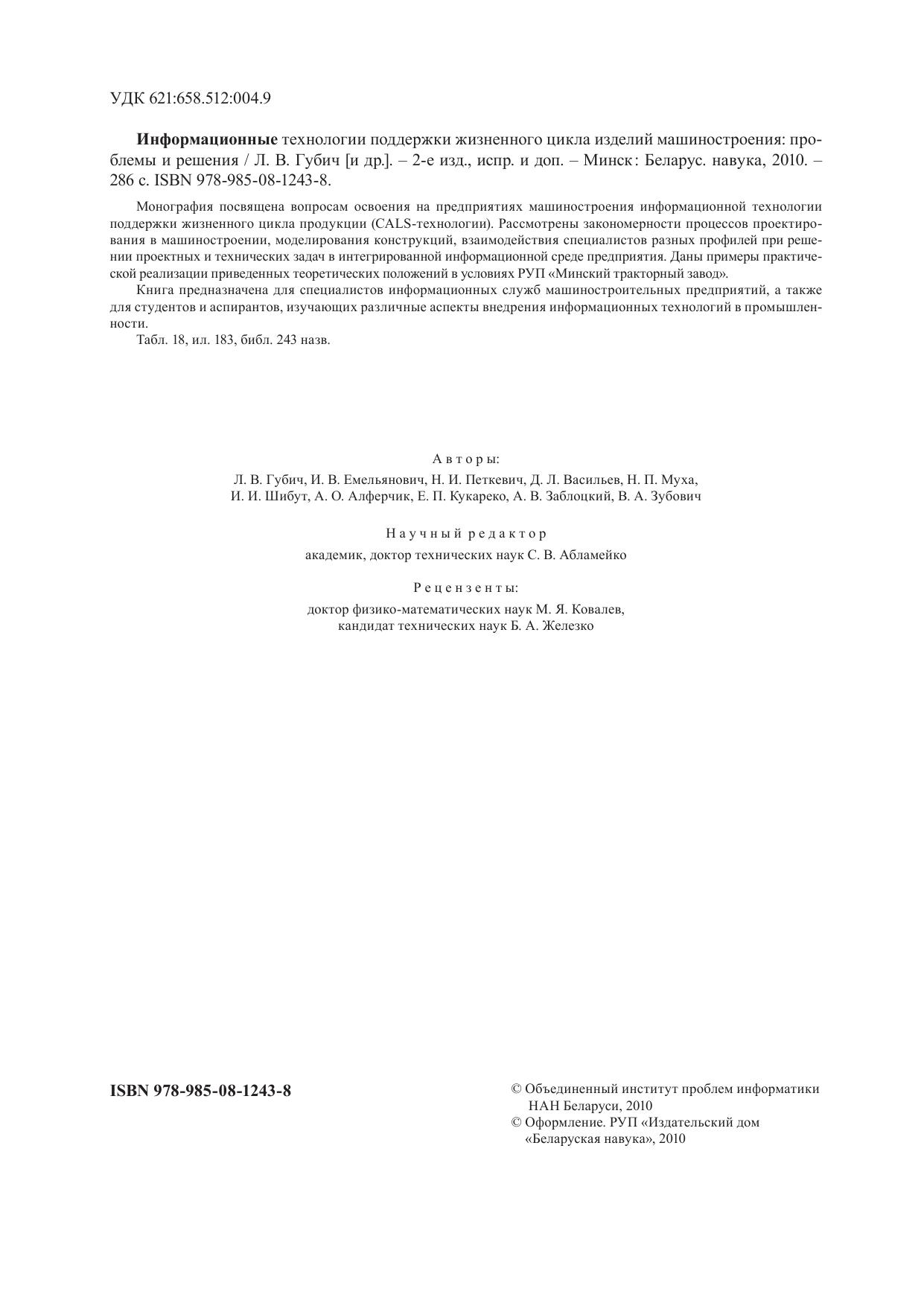 Монография посвящена вопросам освоения на предприятиях машиностроения информационной технологии поддержки жизненного цикла продукции (CALS-технологии). Рассмотрены закономерности процессов проектирования в машиностроении, моделирования конструкций, взаимодействия специалистов разных профилей при решении проектных и технических задач в интегрированной информационной среде предприятия. Даны примеры практической реализации приведенных теоретических положений в условиях РУП «Минский тракторный завод». Книга предназначена для специалистов информационных служб машиностроительных предприятий, а также для студентов и аспирантов, изучающих различные аспекты внедрения информационных технологий в промышленности.