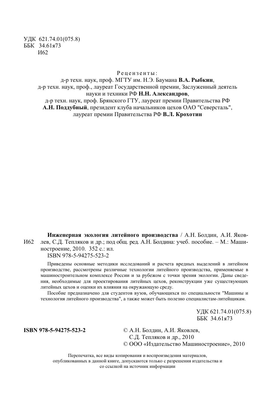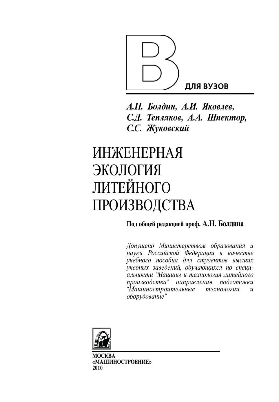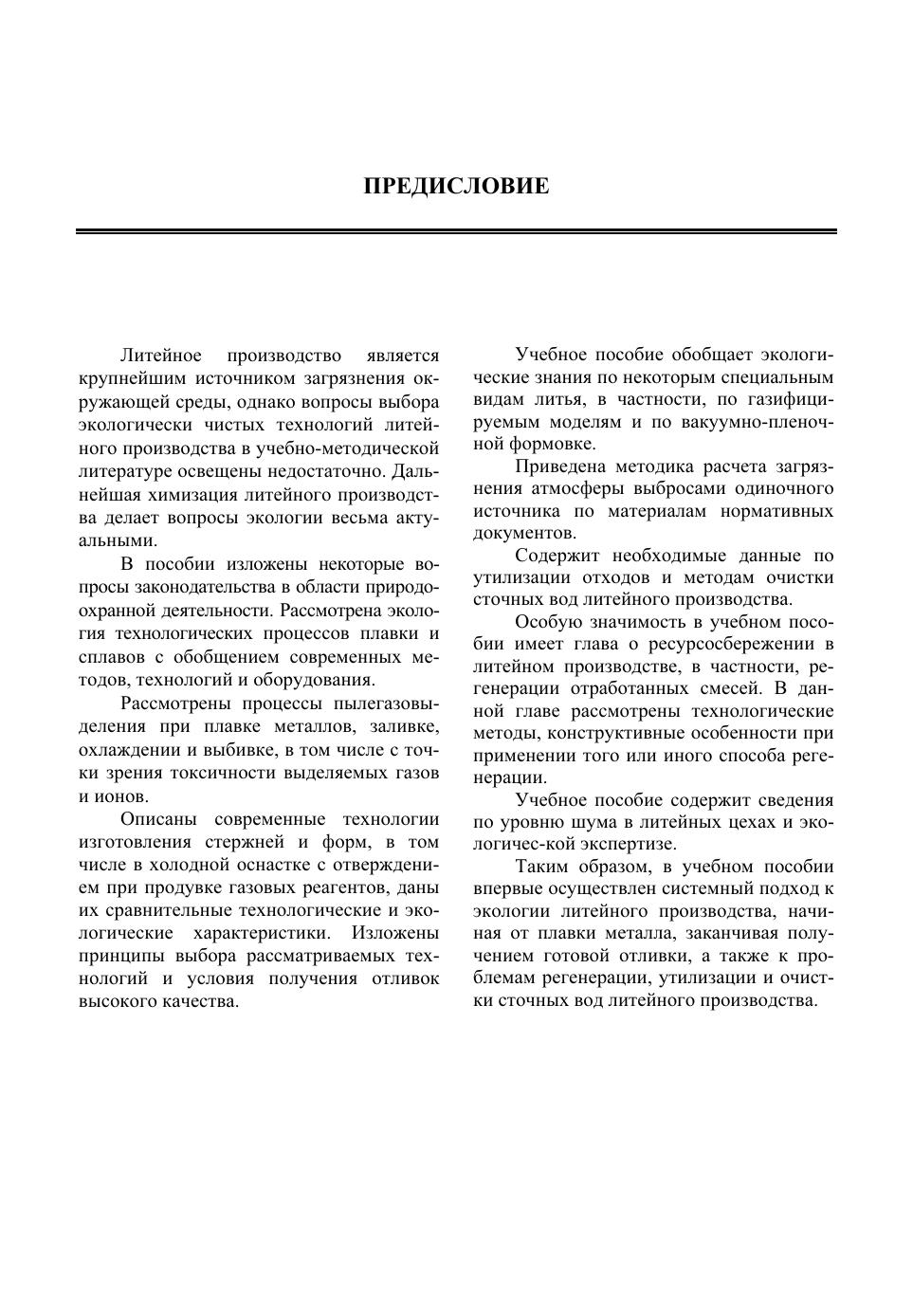 Приведены основные методики исследований и расчета вредных выделений в литейном производстве, рассмотрены различные технологии литейного производства, применяемые в машиностроительном комплексе России и за рубежом с точки зрения экологии. Даны сведения, необходимые для проектирования литейных цехов, реконструкции уже существующих литейных цехов и оценки их влияния на окружающую среду. Пособие предназначено для студентов вузов, обучающихся по специальности "Машины и технология литейного производства", а также может быть полезно специалистам-литейщикам.