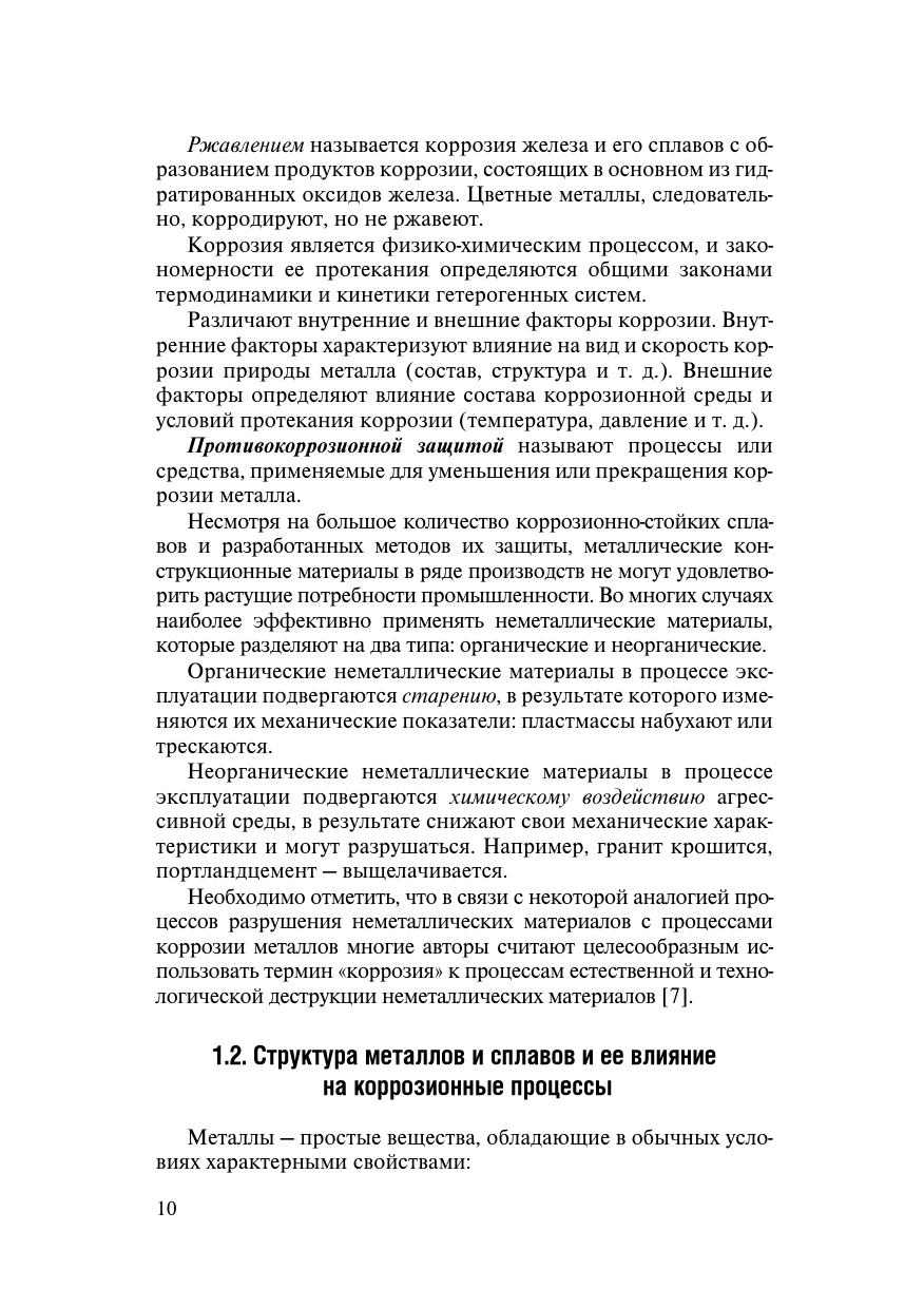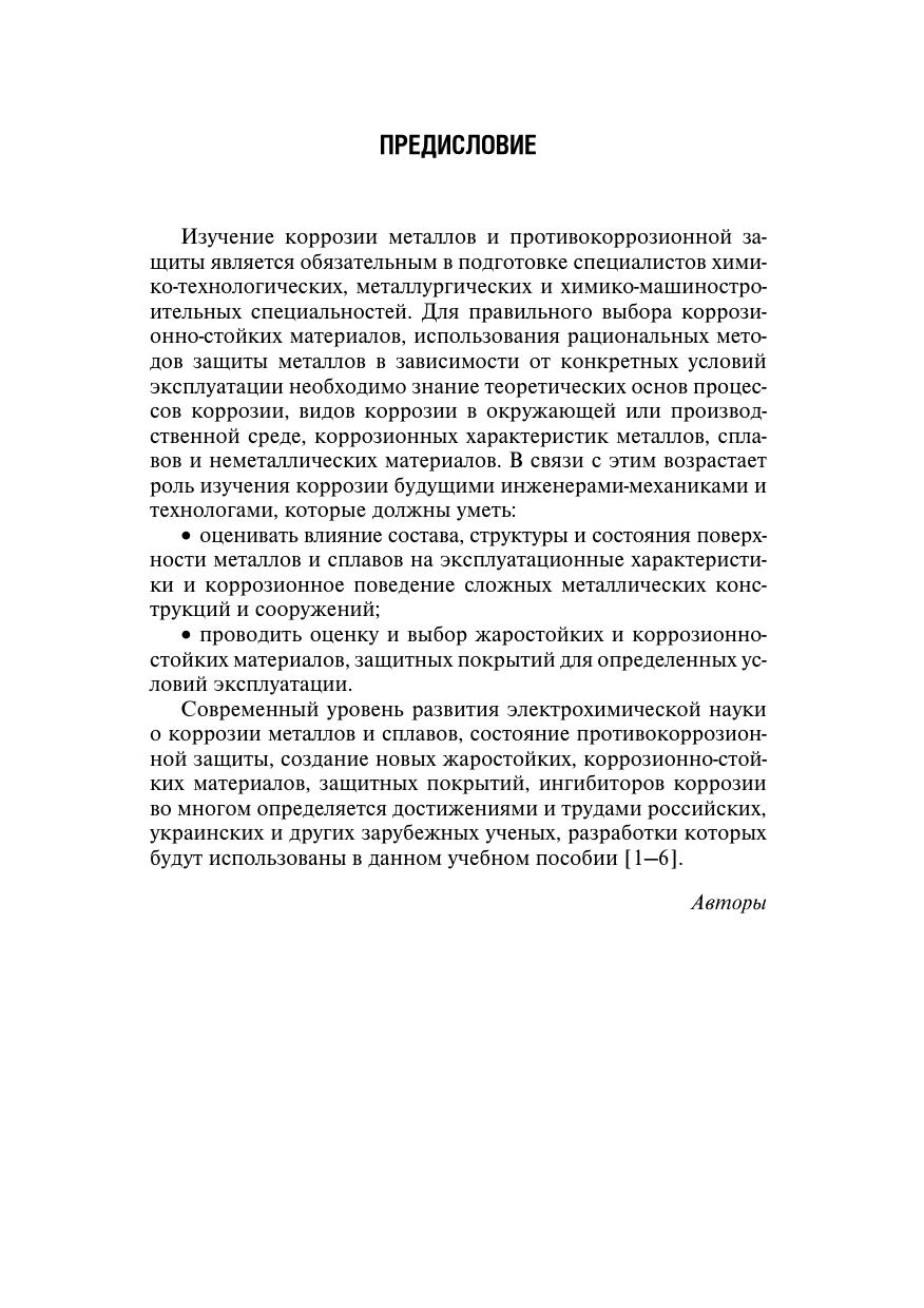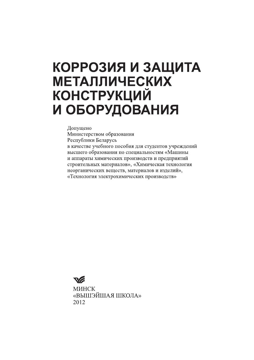 Рассмотрены основы теории химической и электрохимической коррозии металлов, методы защиты металлов от коррозии, способы коррозионных испытаний. Приведены конструкционные металлические и неметаллические неорганические и органические материалы, защитные и защитно-декоративные покрытия. Рассмотрены примеры коррозионных разрушений металлических конструкций и оборудования и способы их защиты. Для студентов вузов химико-технологических, металлургических и машиностроительных специальностей. Может быть полезно специалистам.