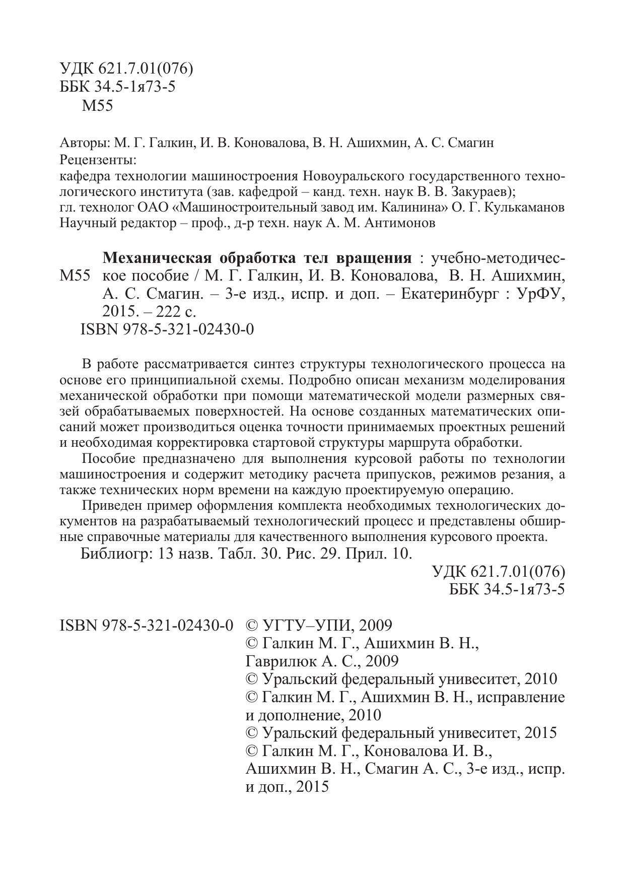В работе рассматривается синтез структуры технологического процесса на основе его принципиальной схемы. Подробно описан механизм моделирования механической обработки при помощи математической модели размерных связей обрабатываемых поверхностей. На основе созданных математических описаний может производиться оценка точности принимаемых проектных решений и необходимая корректировка стартовой структуры маршрута обработки. Пособие предназначено для выполнения курсовой работы по технологии машиностроения и содержит методику расчета припусков, режимов резания, а также технических норм времени на каждую проектируемую операцию. Приведен пример оформления комплекта необходимых технологических документов на разрабатываемый технологический процесс и представлены обширные справочные материалы для качественного выполнения курсового проекта.