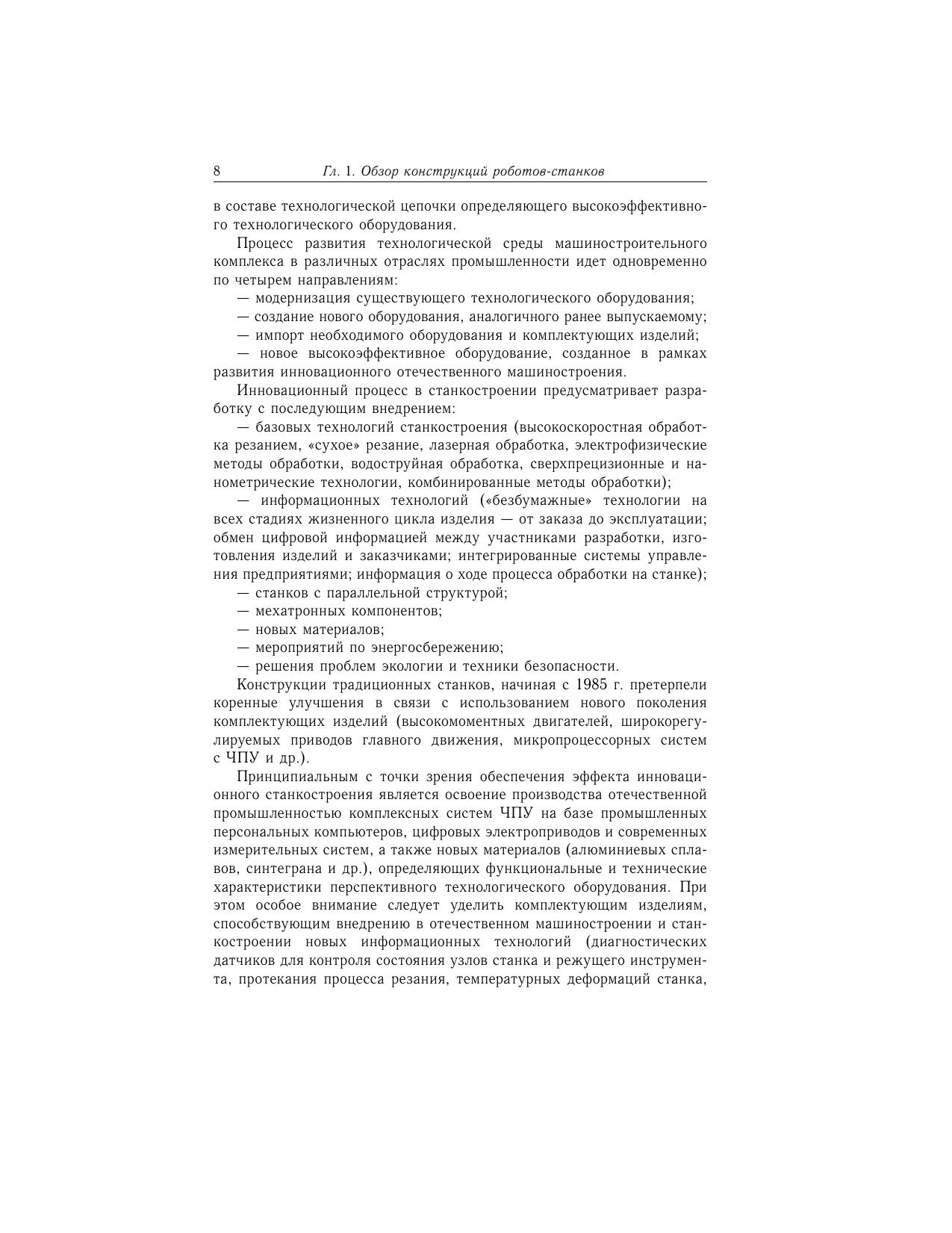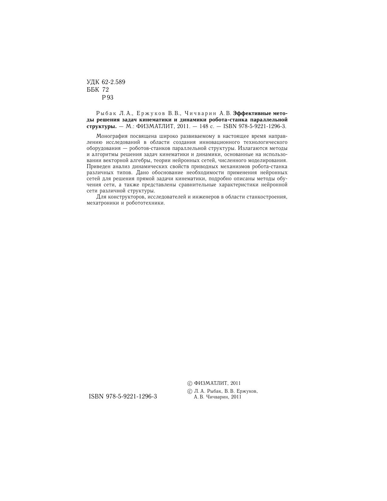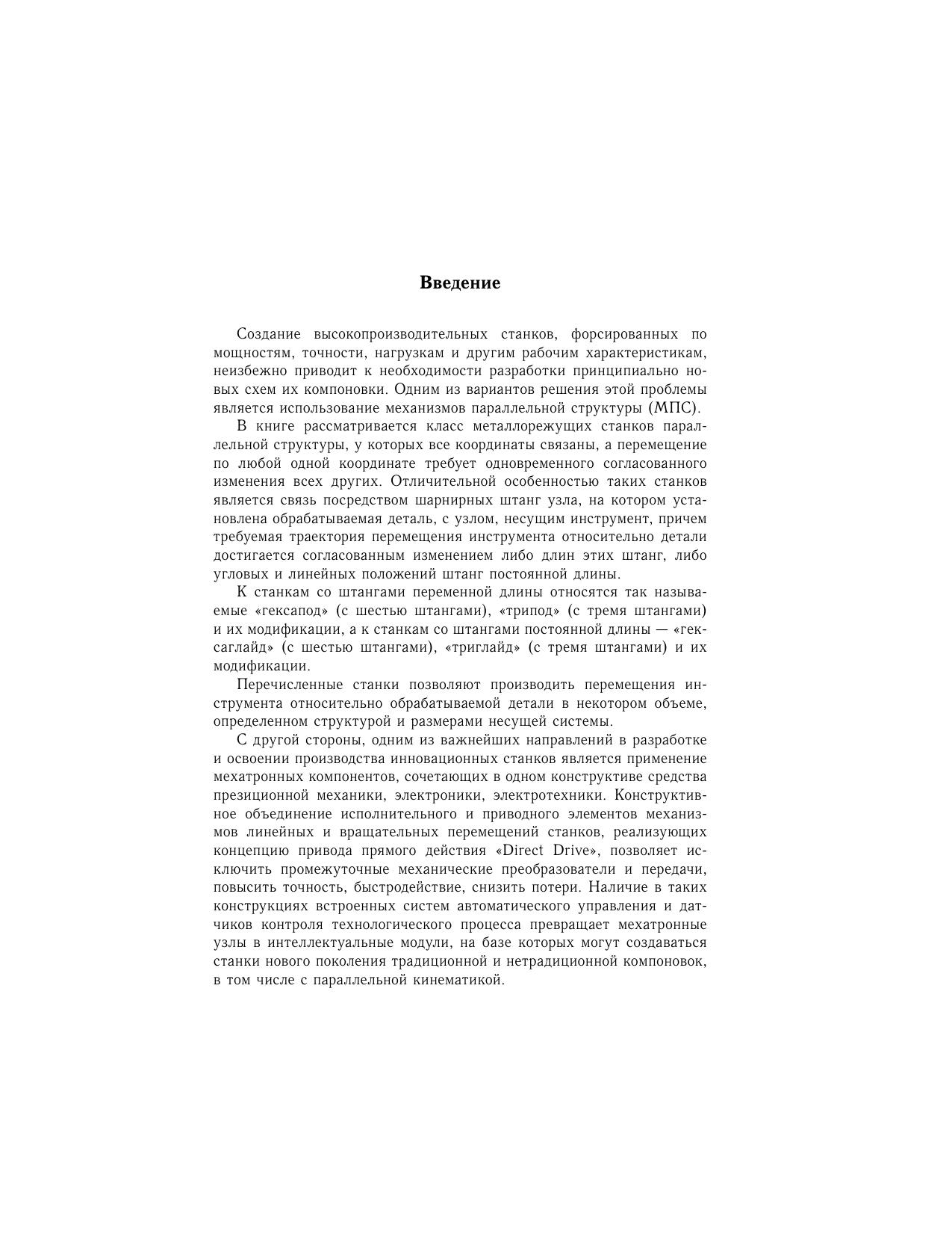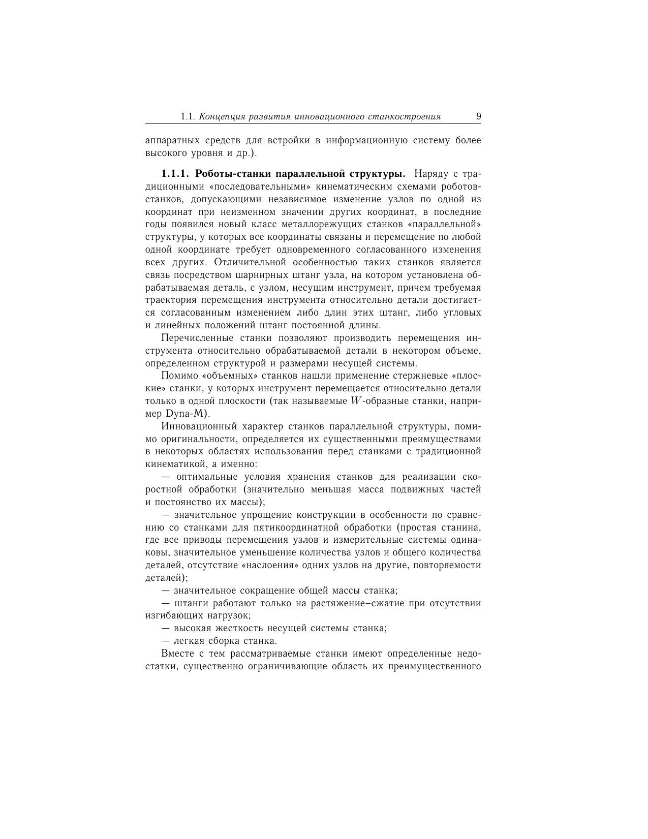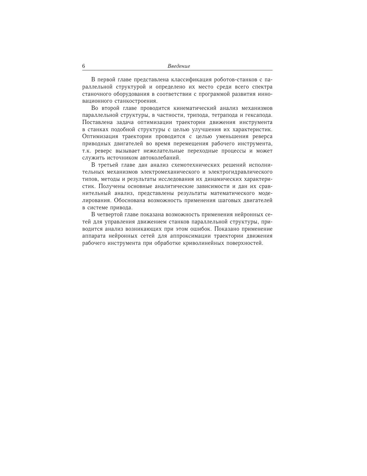 Монография посвящена широко развиваемому в настоящее время направлению исследований в области создания инновационного технологического оборудования — роботов-станков параллельной структуры. Излагаются методы и алгоритмы решения задач кинематики и динамики, основанные на использовании векторной алгебры, теории нейронных сетей, численного моделирования. Приведен анализ динамических свойств приводных механизмов робота-станка различных типов. Дано обоснование необходимости применения нейронных сетей для решения прямой задачи кинематики, подробно описаны методы обучения сети, а также представлены сравнительные характеристики нейронной сети различной структуры. Для конструкторов, исследователей и инженеров в области станкостроения, мехатроники и робототехники.