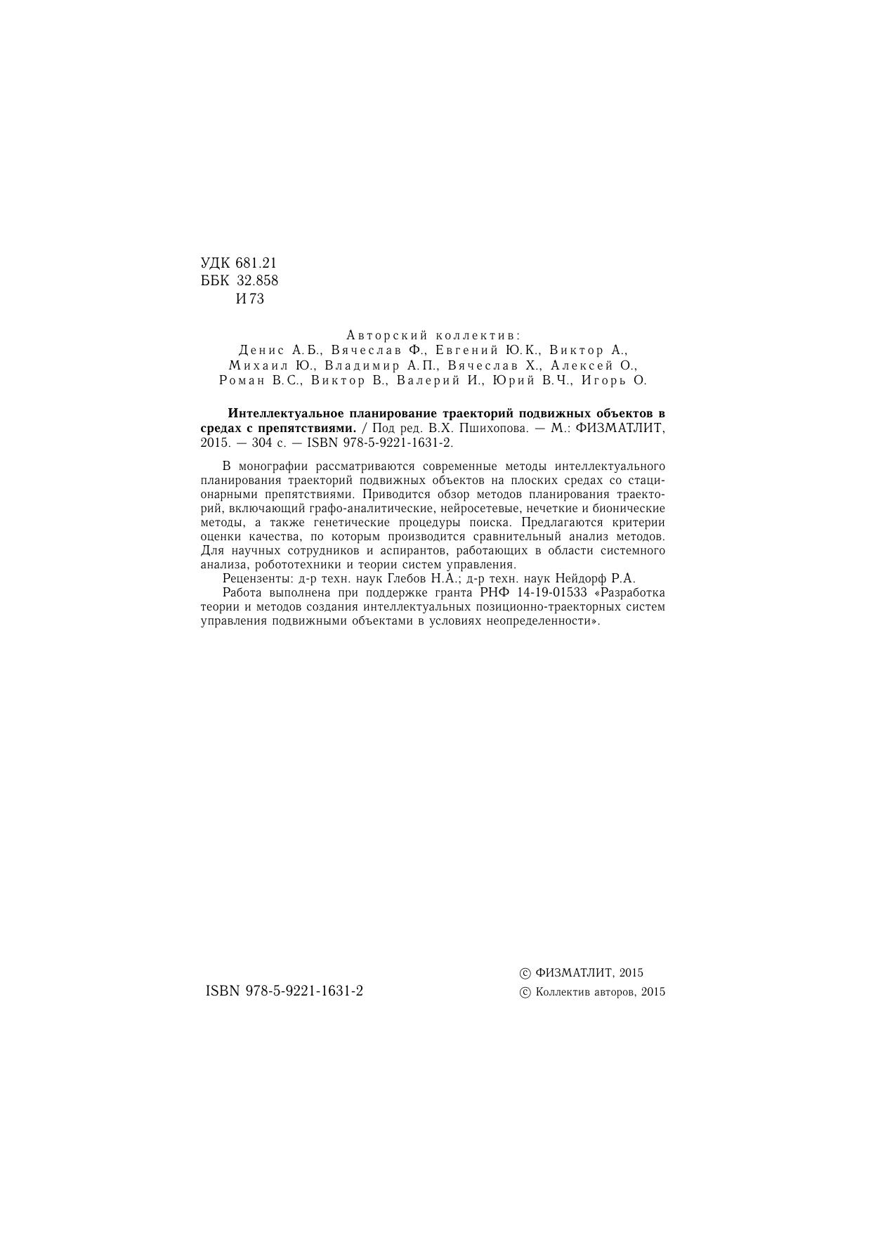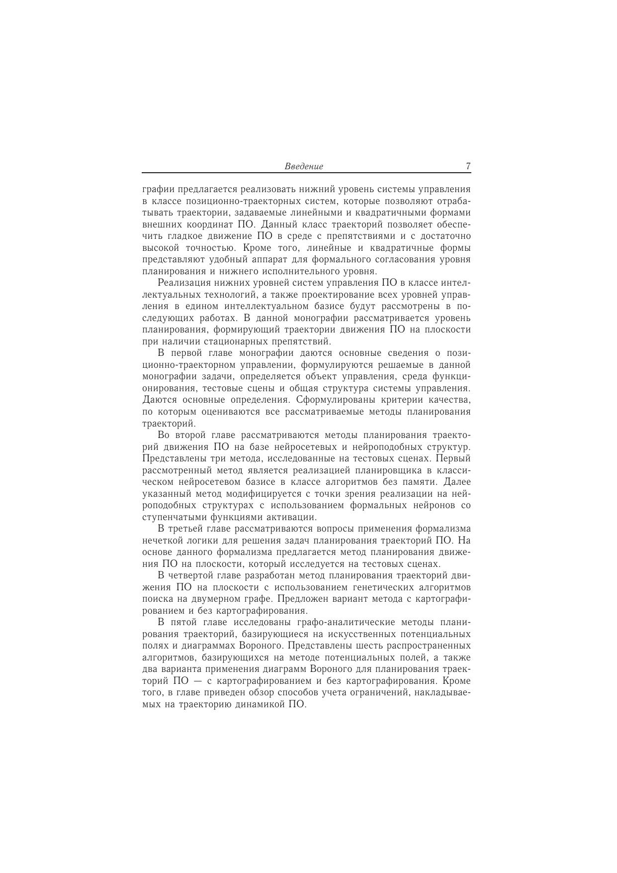 В монографии рассматриваются современные методы интеллектуального планирования траекторий подвижных объектов на плоских средах со стационарными препятствиями. Приводится обзор методов планирования траекторий, включающий графо-аналитические, нейросетевые, нечеткие и бионические методы, а также генетические процедуры поиска. Предлагаются критерии оценки качества, по которым производится сравнительный анализ методов. Для научных сотрудников и аспирантов, работающих в области системного анализа, робототехники и теории систем управления.